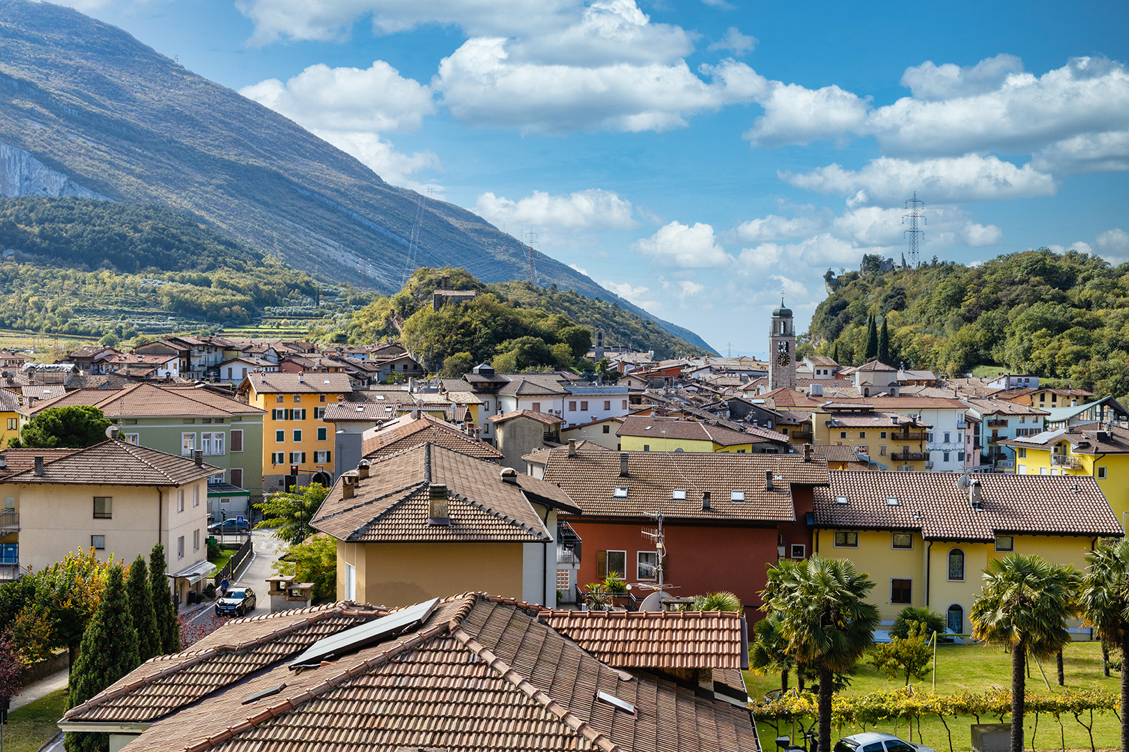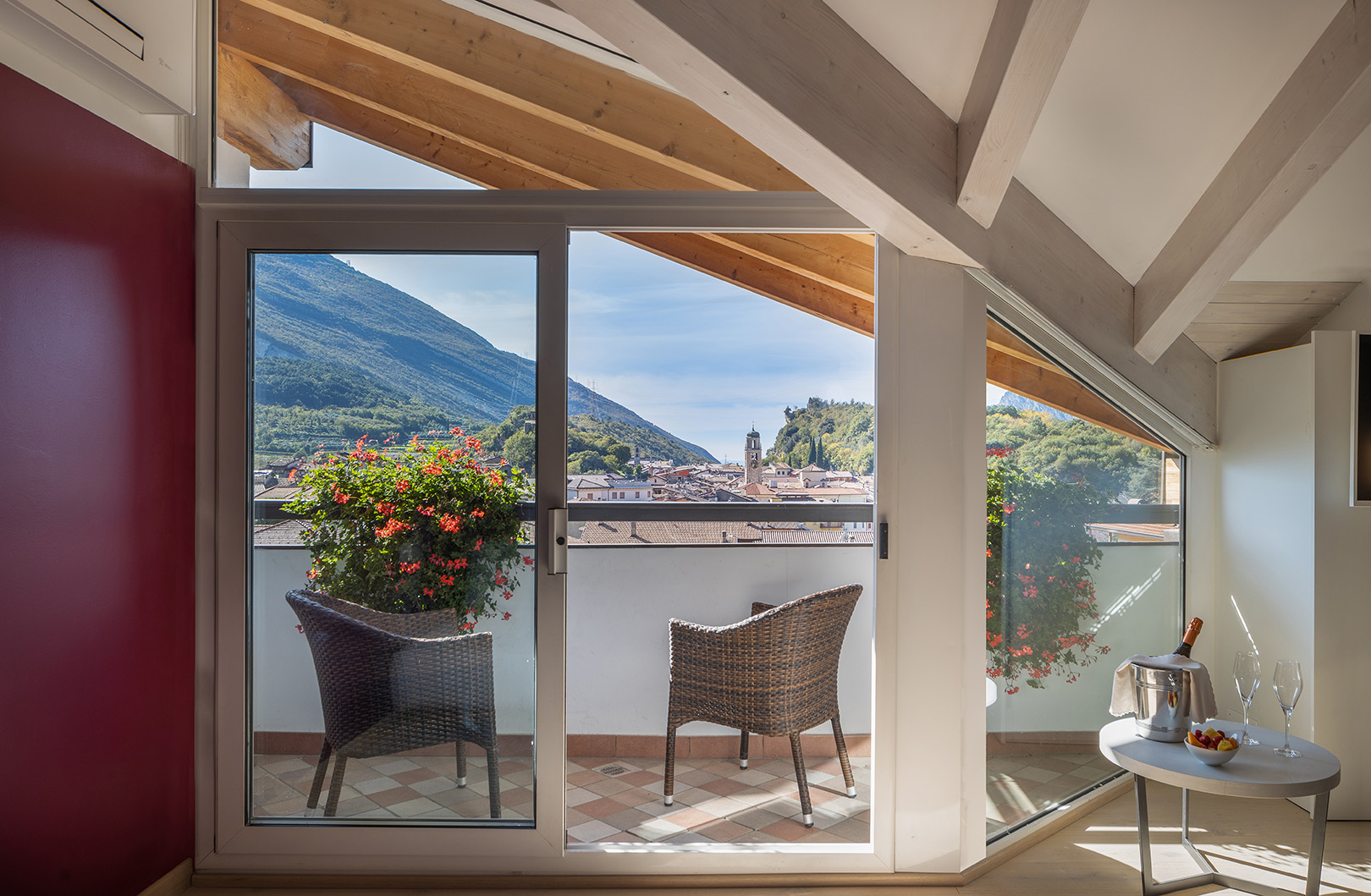 Die Junior Suite Deluxe bietet einen herrlichen Panoramablick auf den Monte Baldo, die Landschaft und die Stadt Nago. Sie zeichnet sich durch moderne Möbel, einen großen und hellen Raum mit großen Fenstern, einen begehbaren Kleiderschrank und ein kleines Wohnzimmer aus, das lädt zum Entspannen ein, während Sie die Aussicht auf die Schönheit der Landschaft und die Lichter des Dorfes genießen. Mansardenzimmer mit jeglichem Komfort, Badezimmer mit Fenster und geräumiger ebenerdiger Dusche, gemütlicher Panoramabalkon mit Tisch und Stühlen.