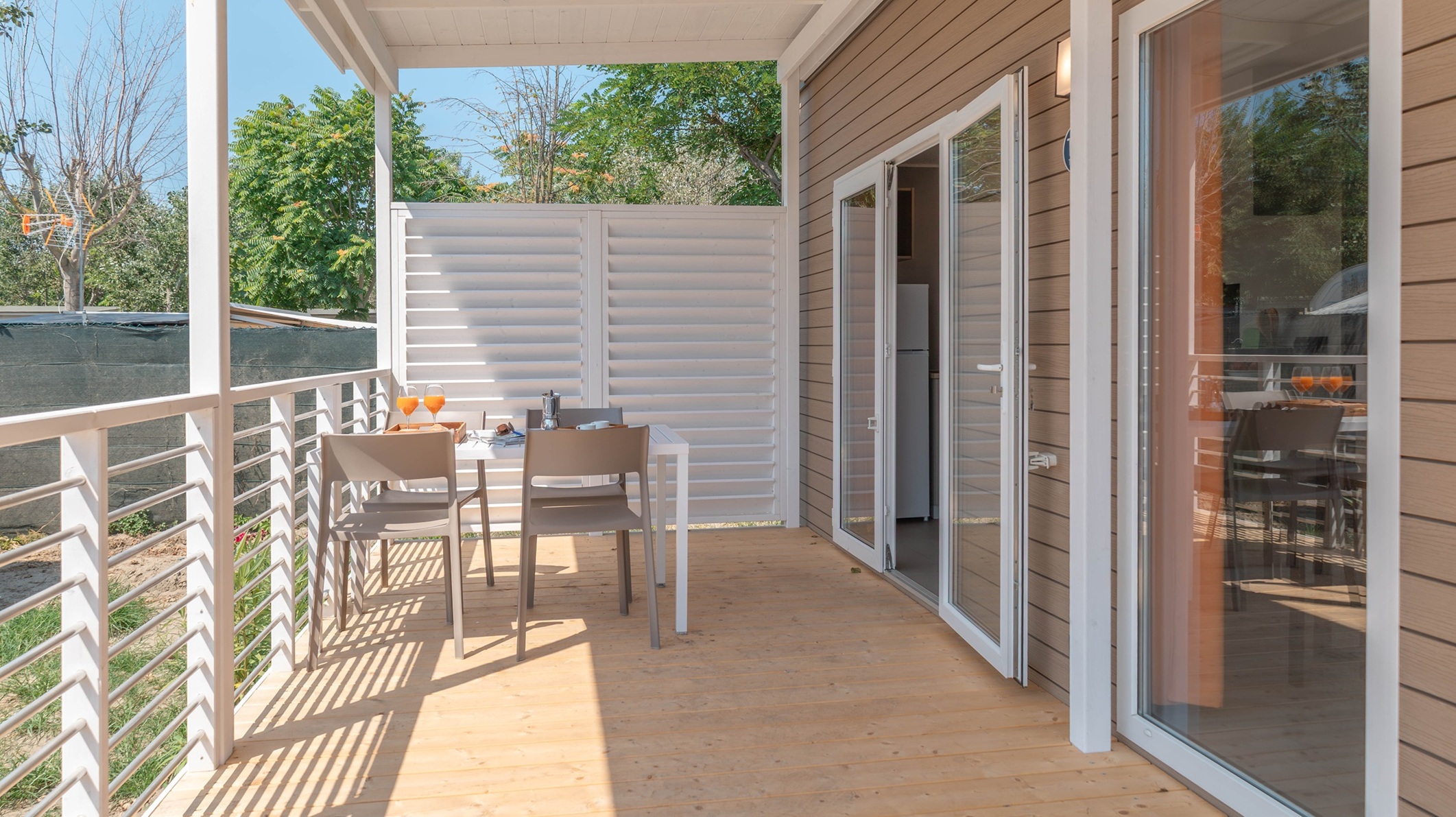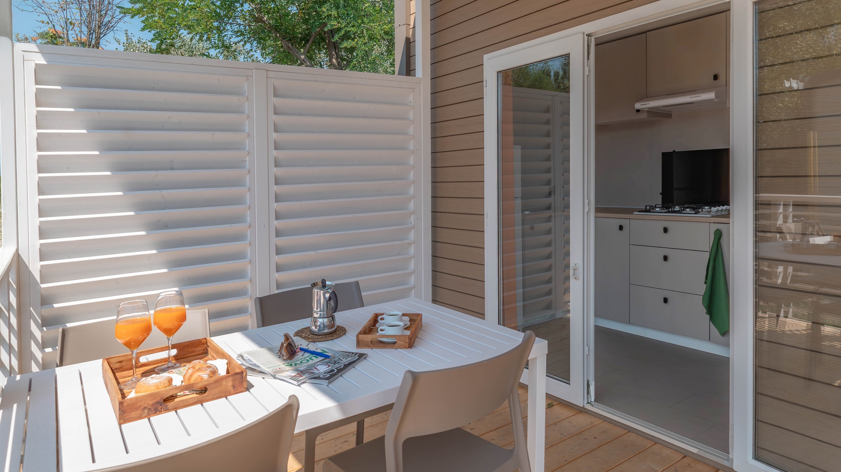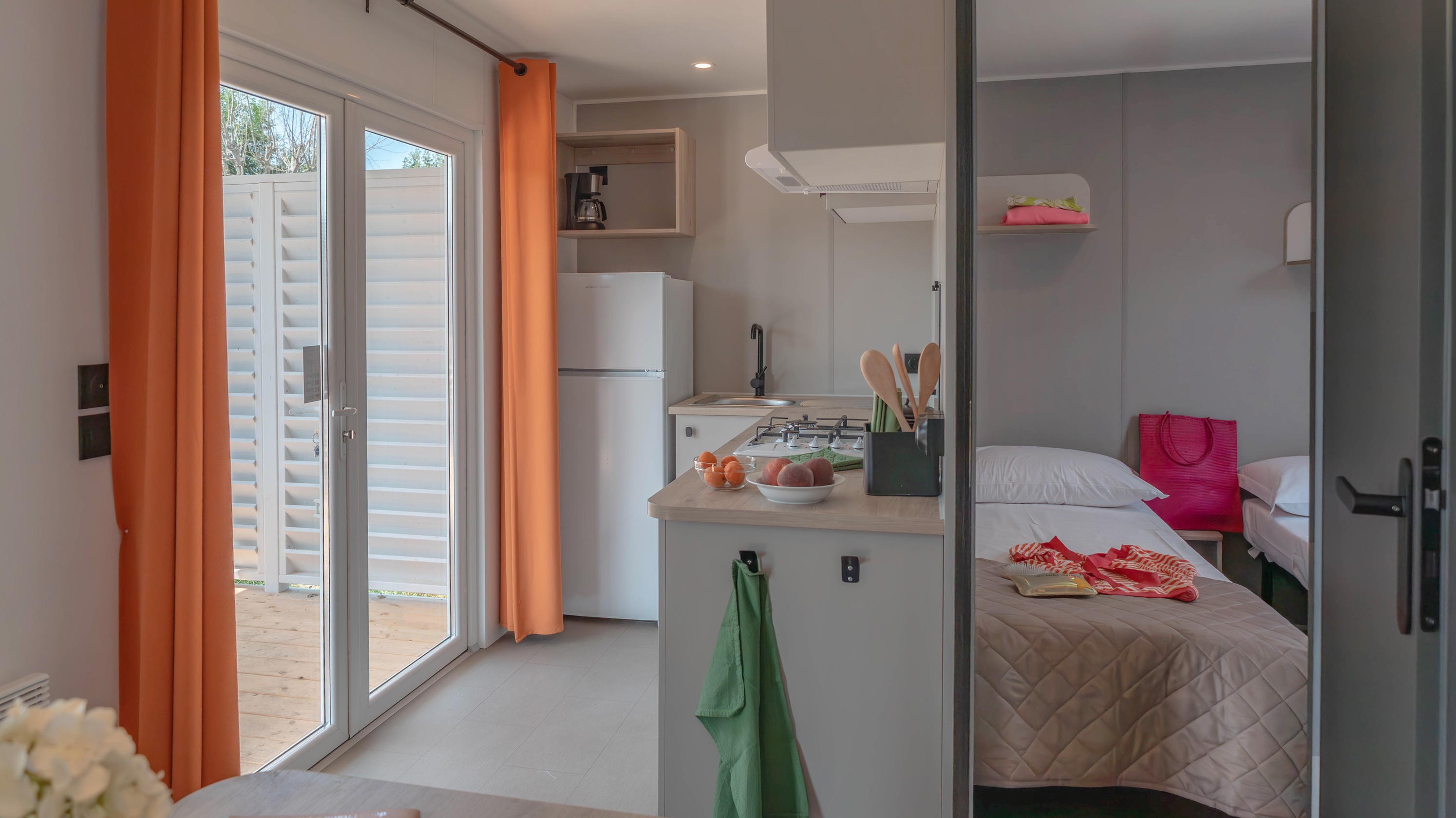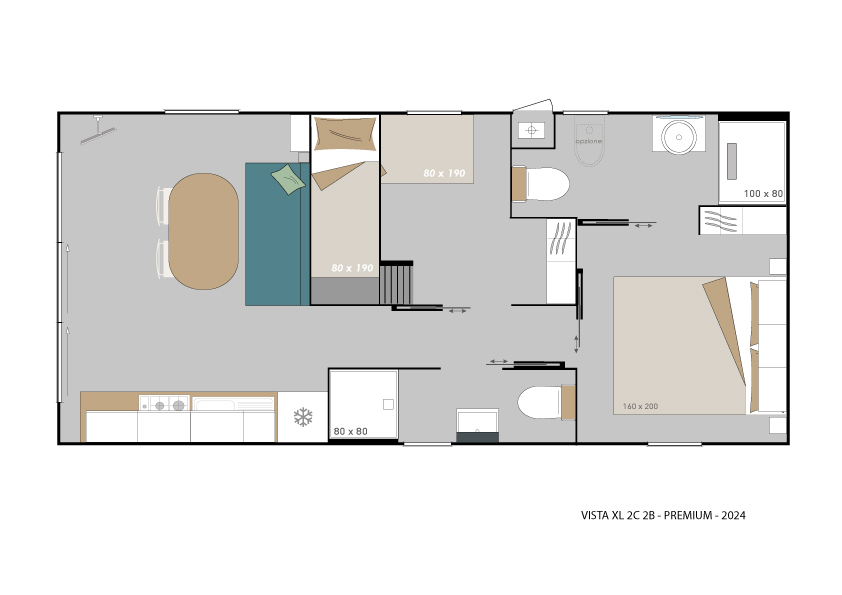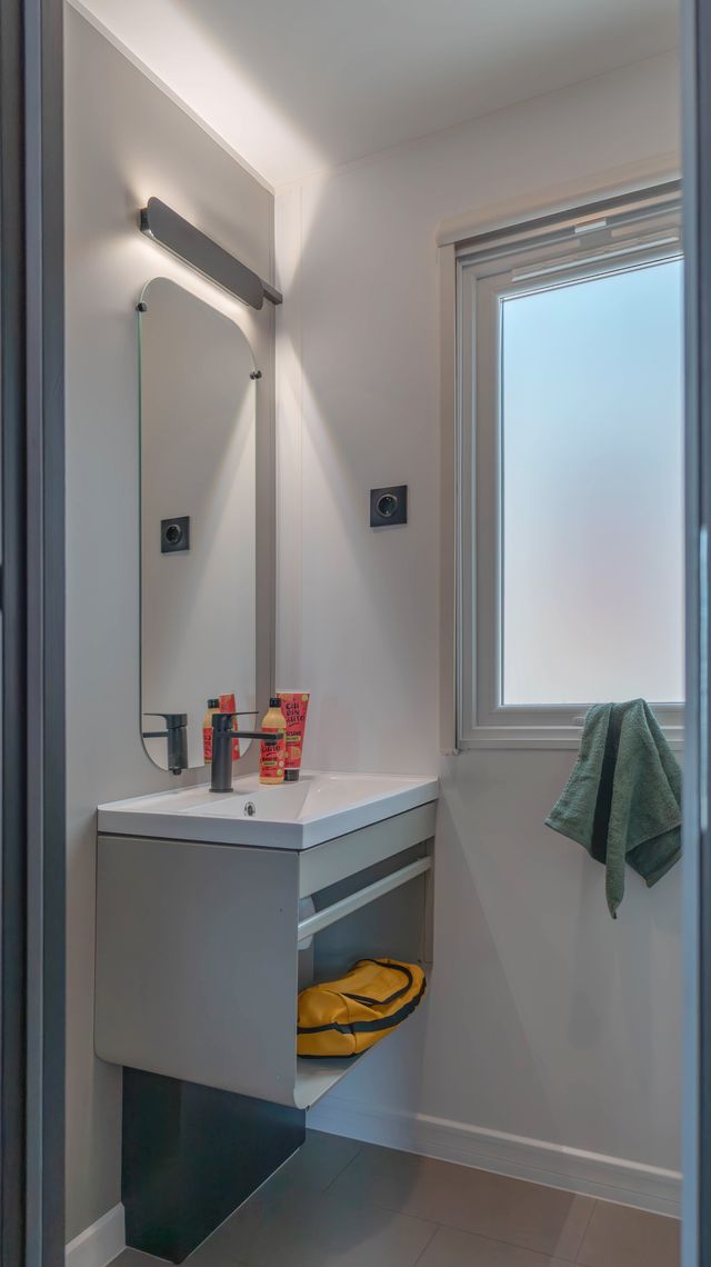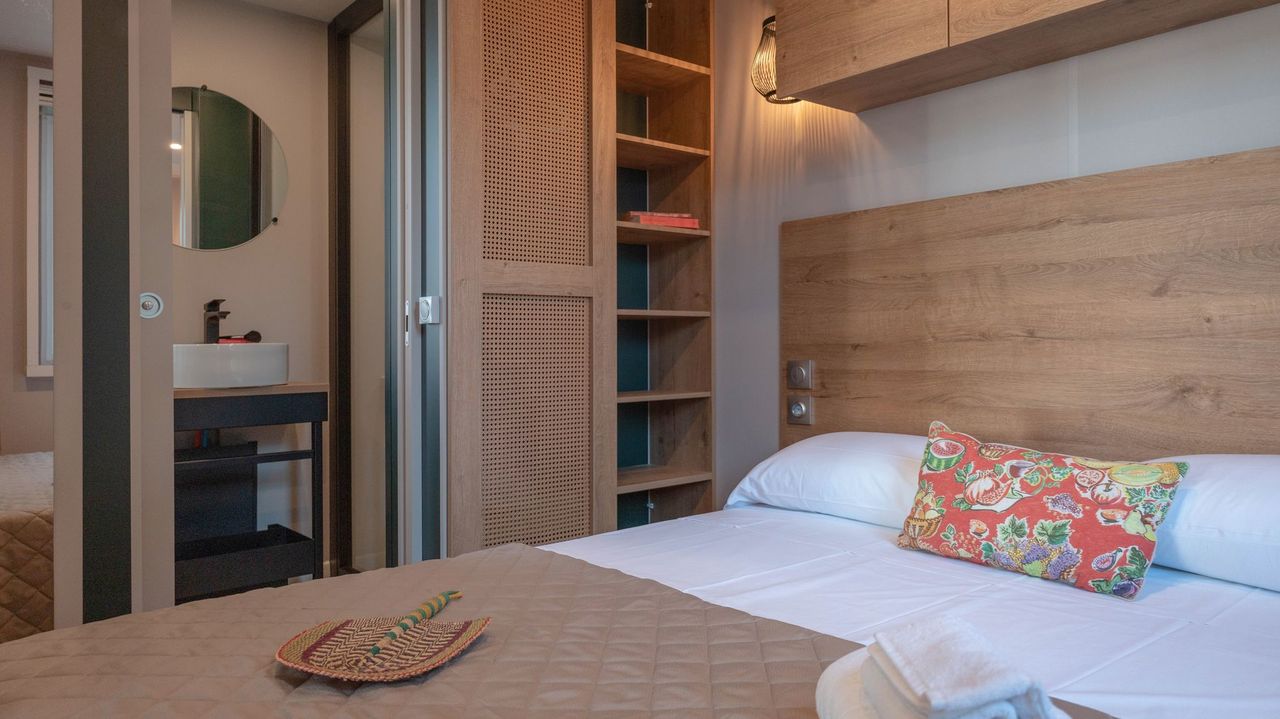 Spaziosa e moderna, la nostra mobile home da 30 m² è ideale per coppie o famiglie fino a 4 persone. Il bagno alla francese, con wc separato, garantisce praticità, mentre la zona giorno con cucina attrezzata consente di gustare i pasti in tranquillità, anche all’aperto sulla terrazza coperta da 15 m².