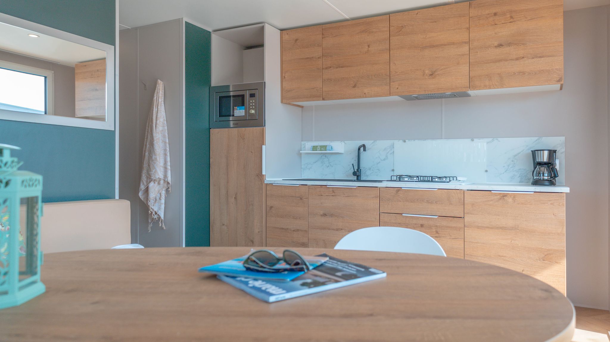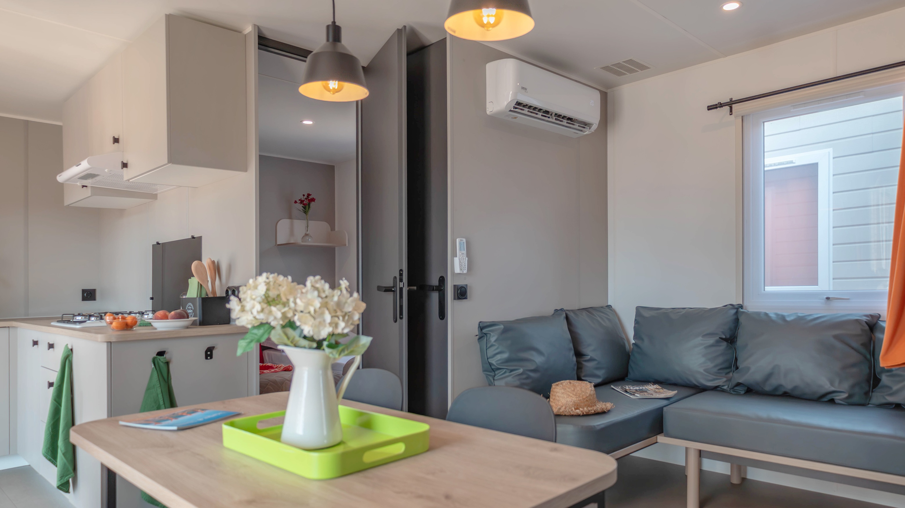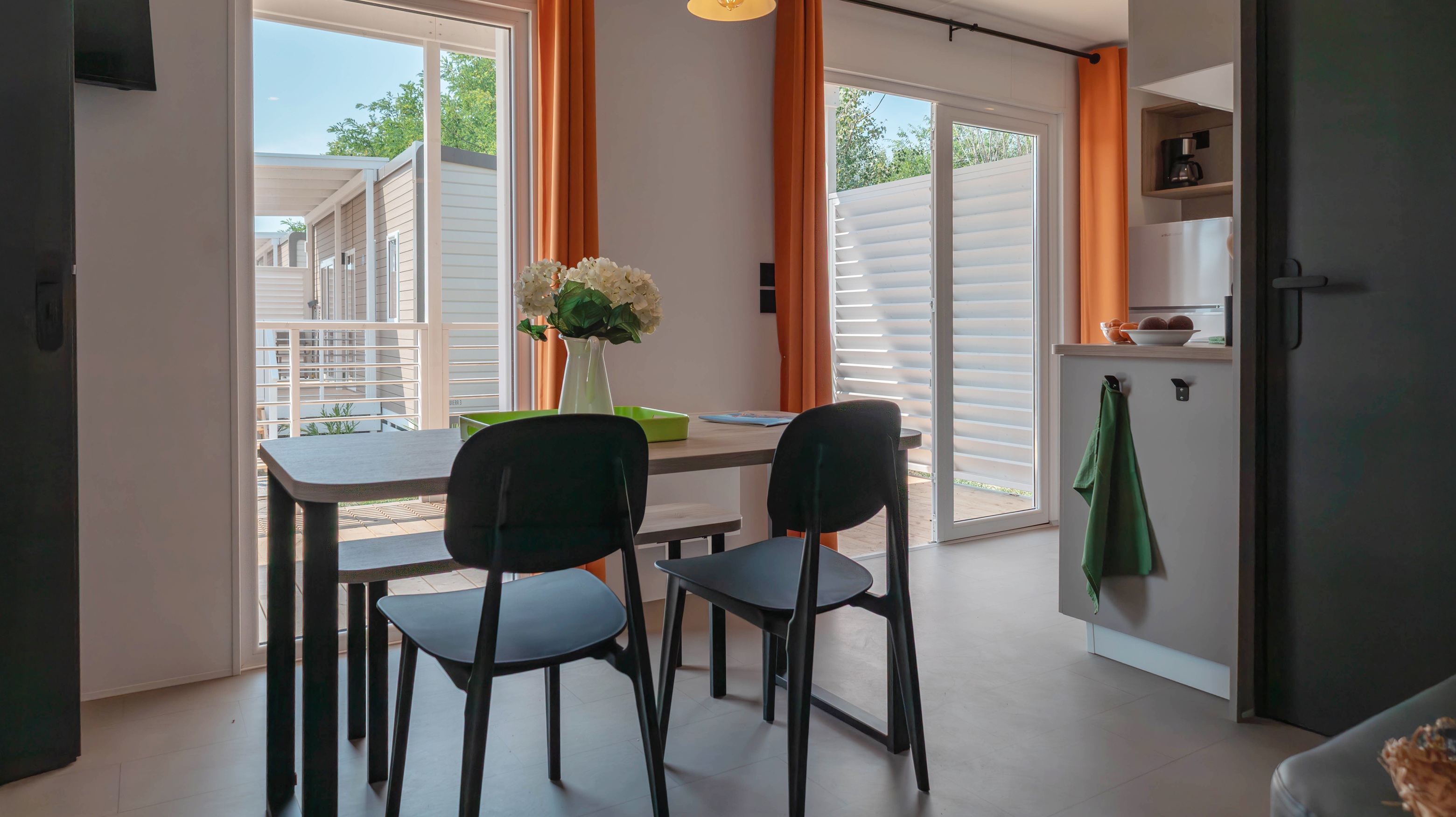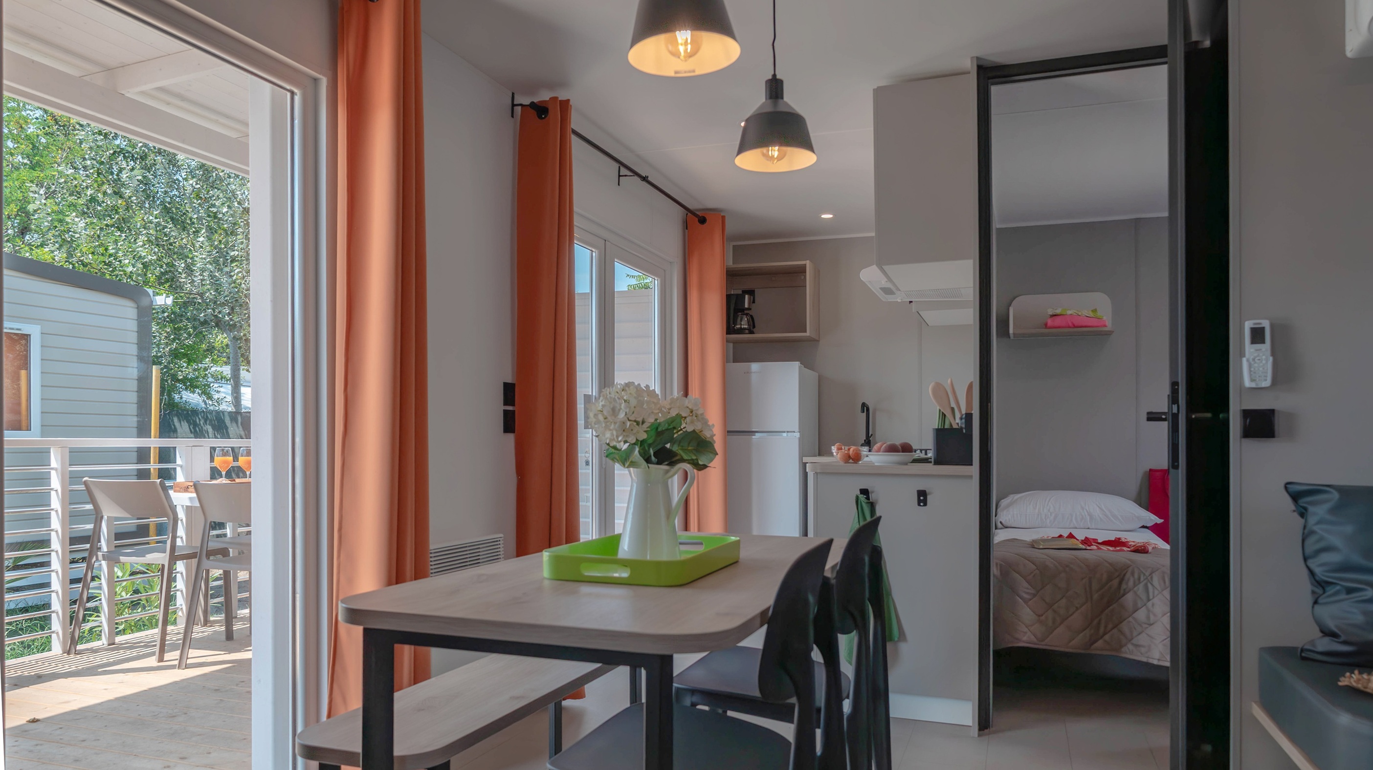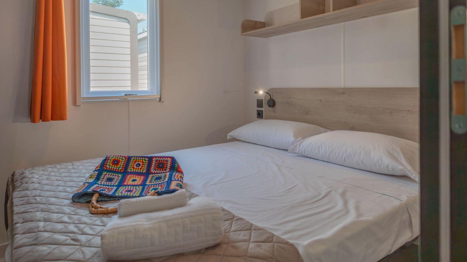 Spaziosa e moderna, la nostra mobile home da 30 m² è ideale per coppie o famiglie fino a 4 persone. Il bagno alla francese, con wc separato, garantisce praticità, mentre la zona giorno con cucina attrezzata consente di gustare i pasti in tranquillità, anche all’aperto sulla terrazza coperta da 15 m².