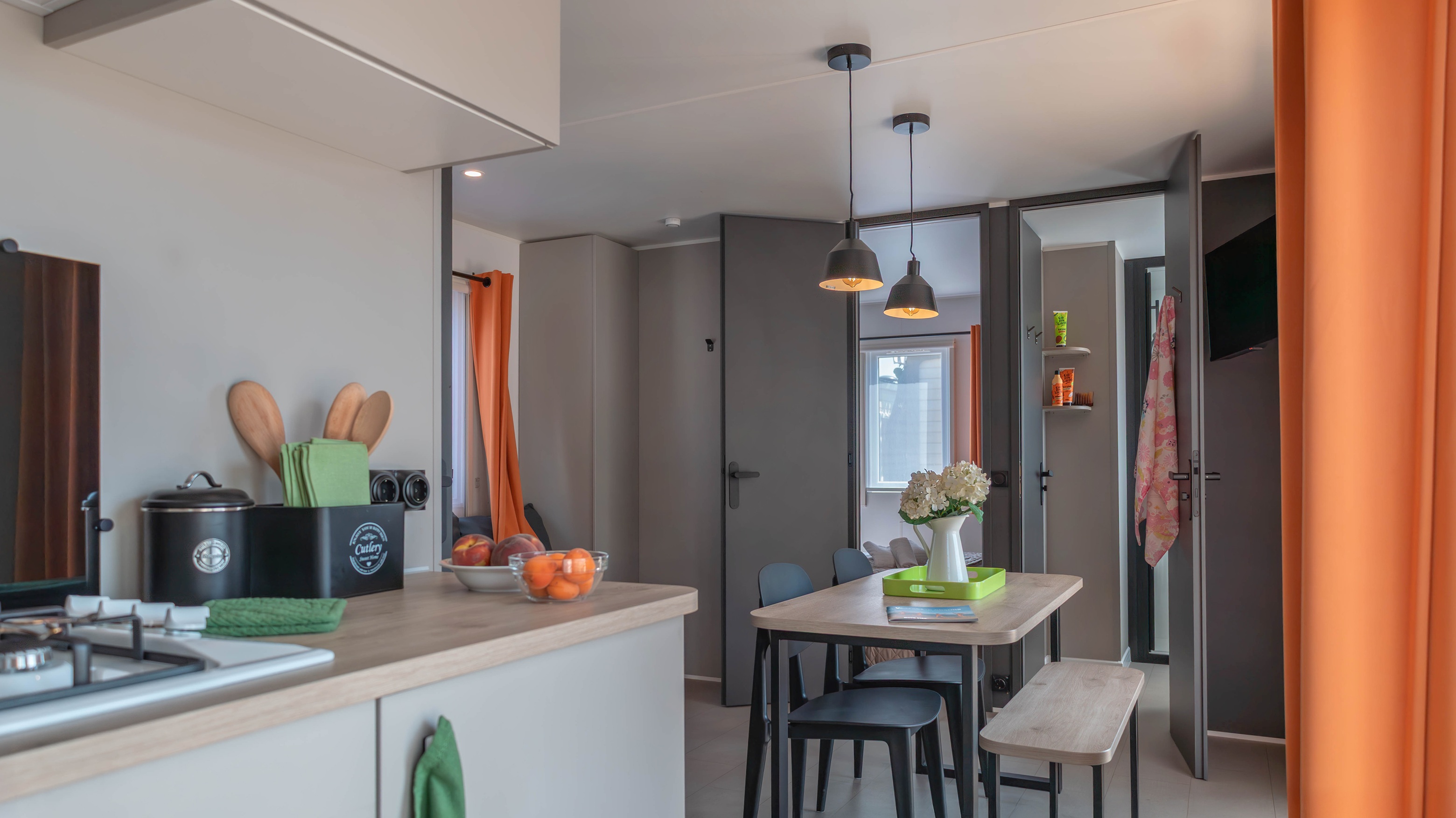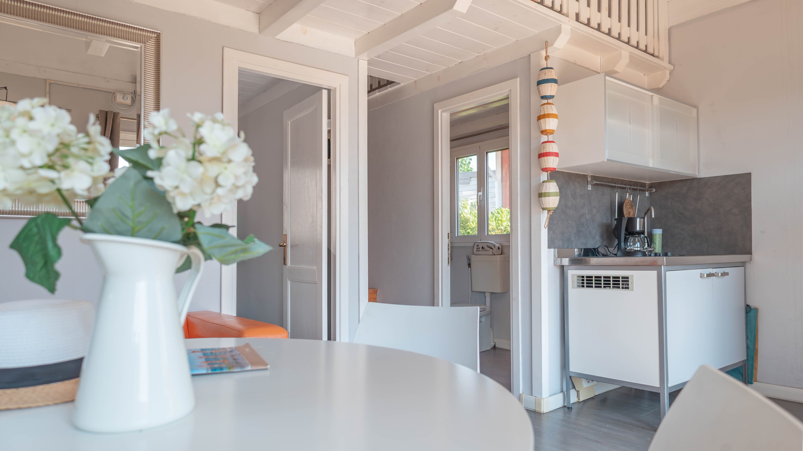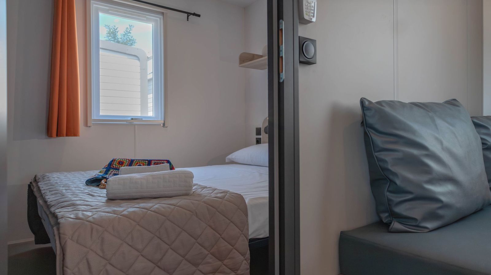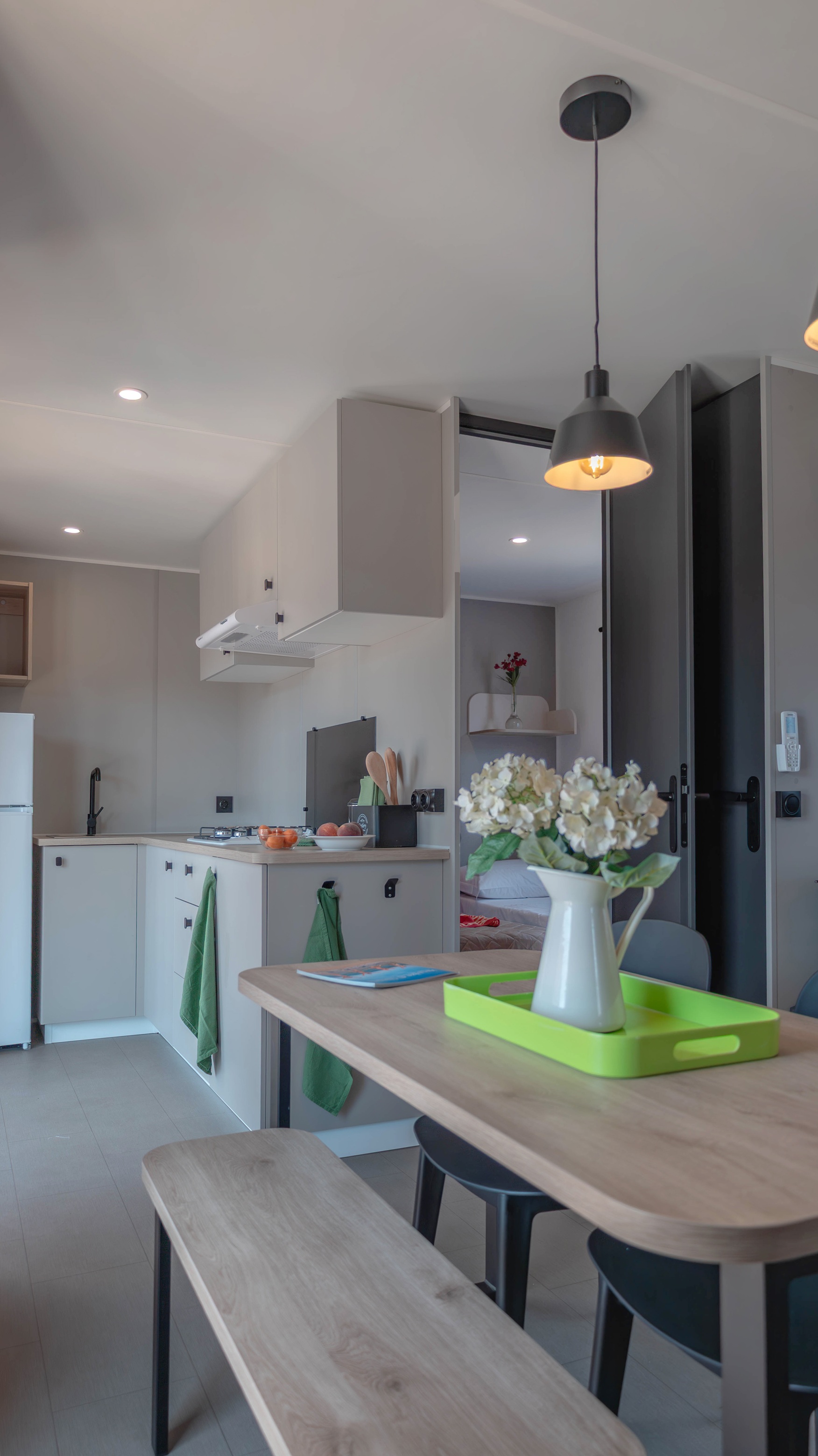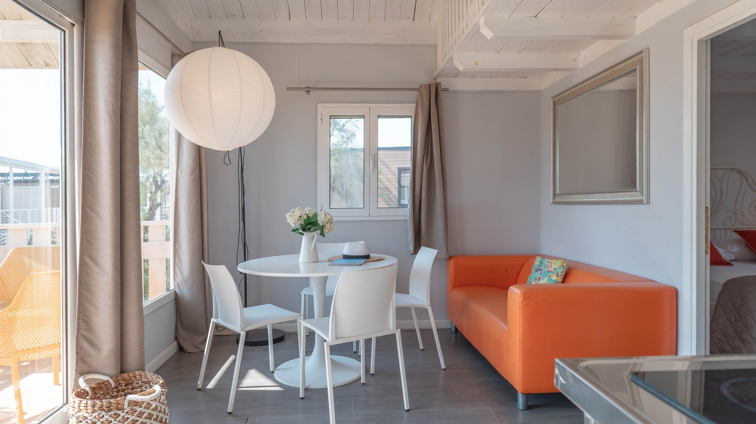 Spaziosa e moderna, la nostra mobile home da 30 m² è ideale per coppie o famiglie fino a 4 persone. Il bagno alla francese, con wc separato, garantisce praticità, mentre la zona giorno con cucina attrezzata consente di gustare i pasti in tranquillità, anche all’aperto sulla terrazza coperta da 15 m².