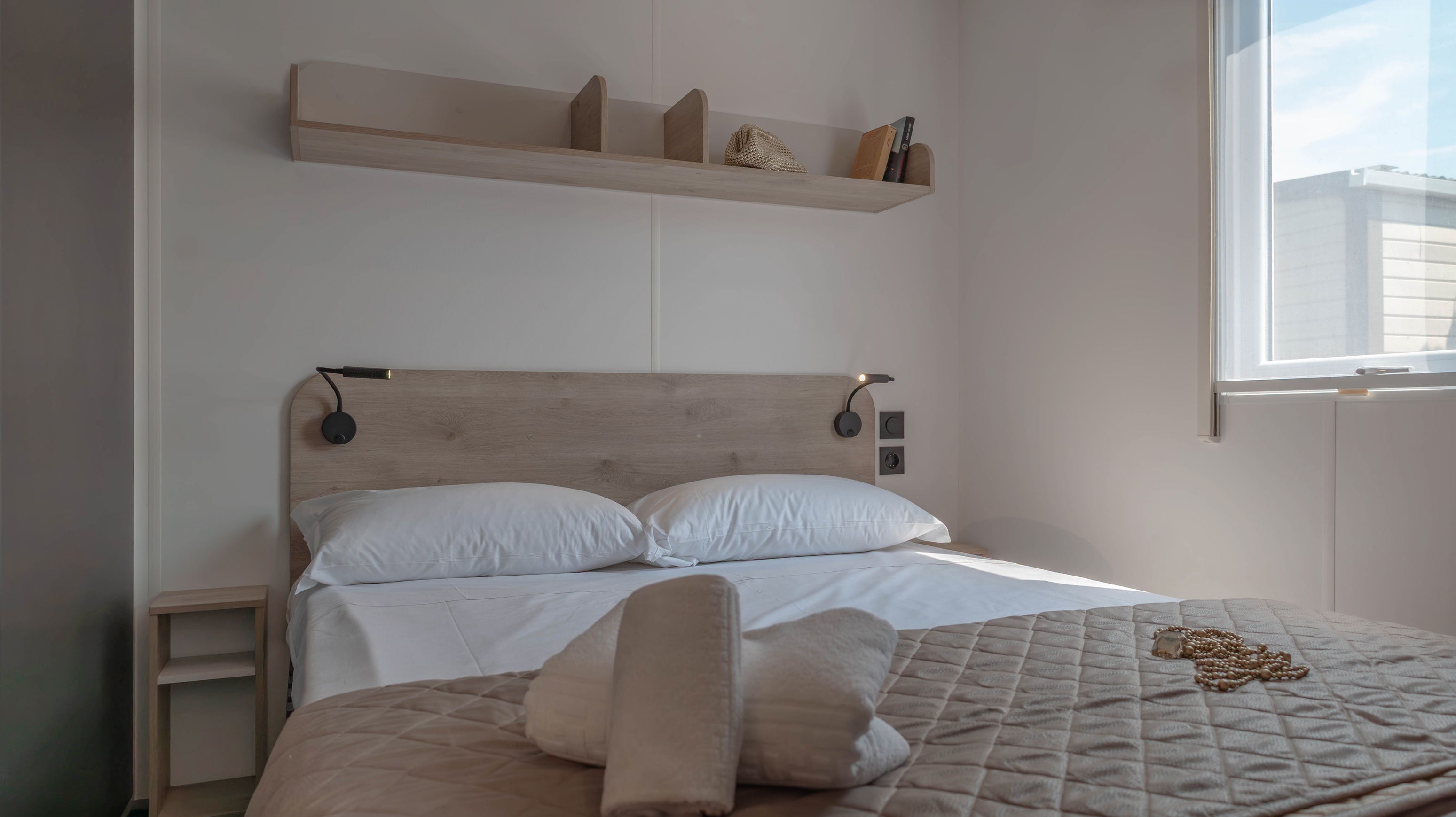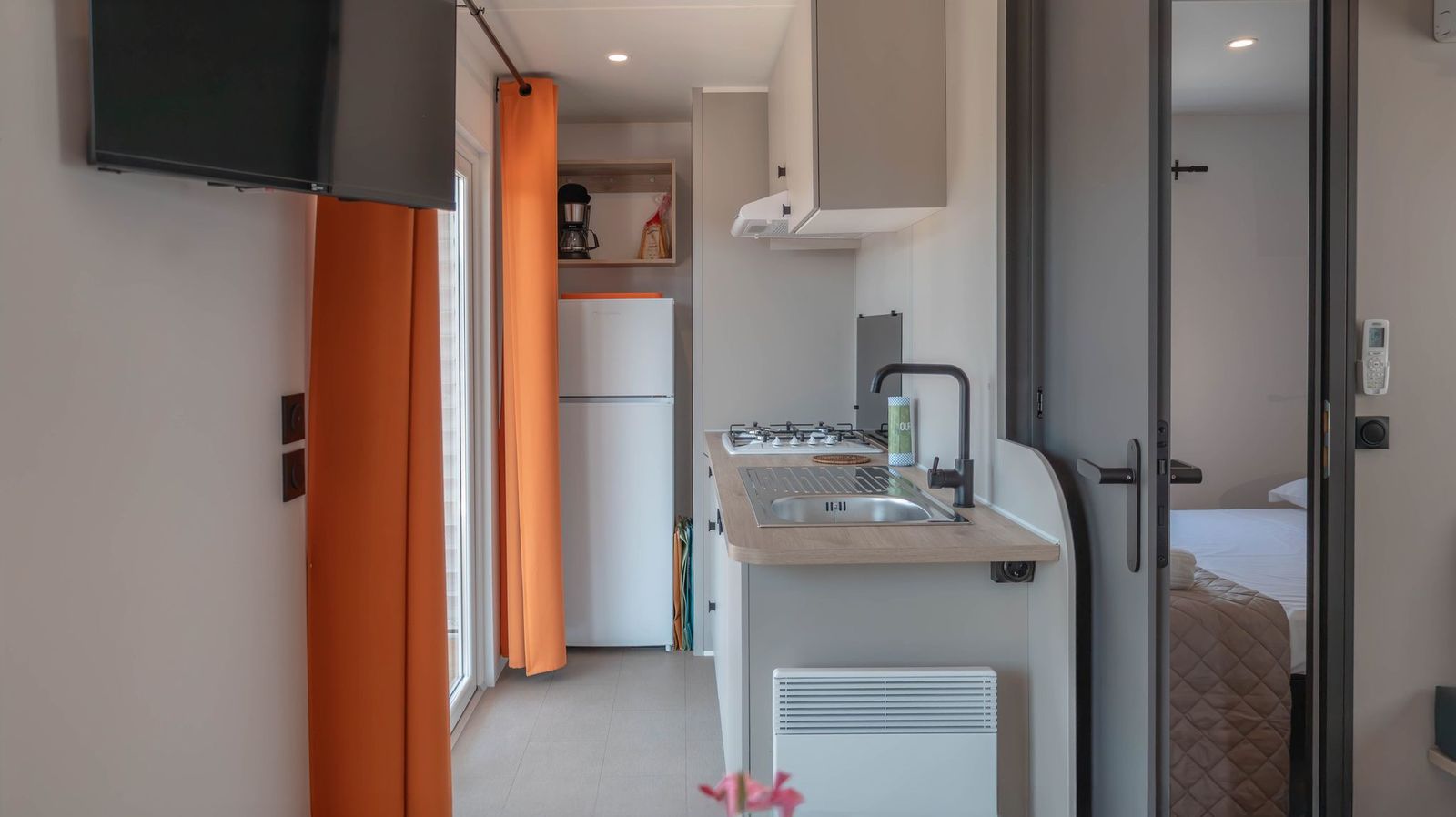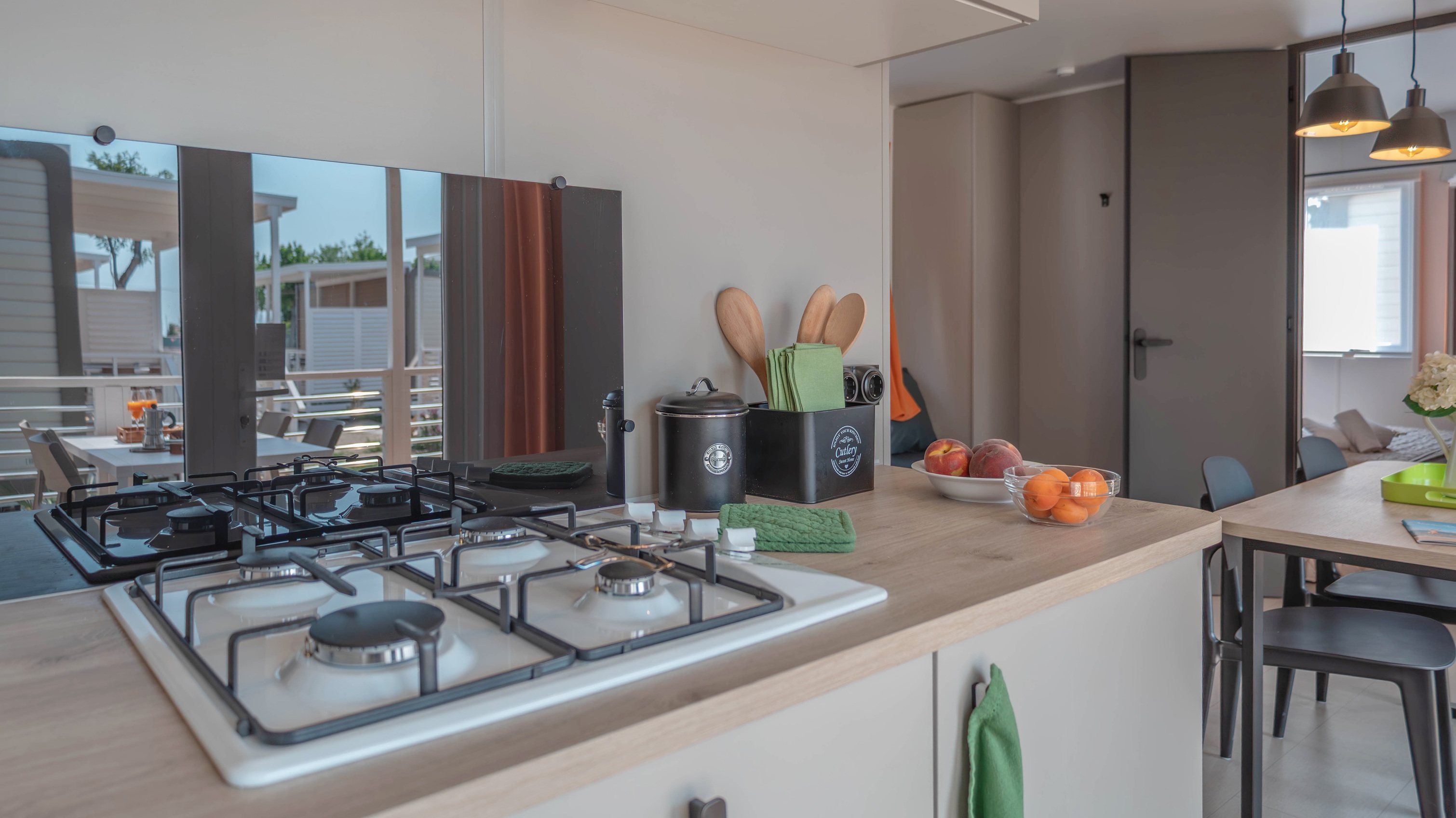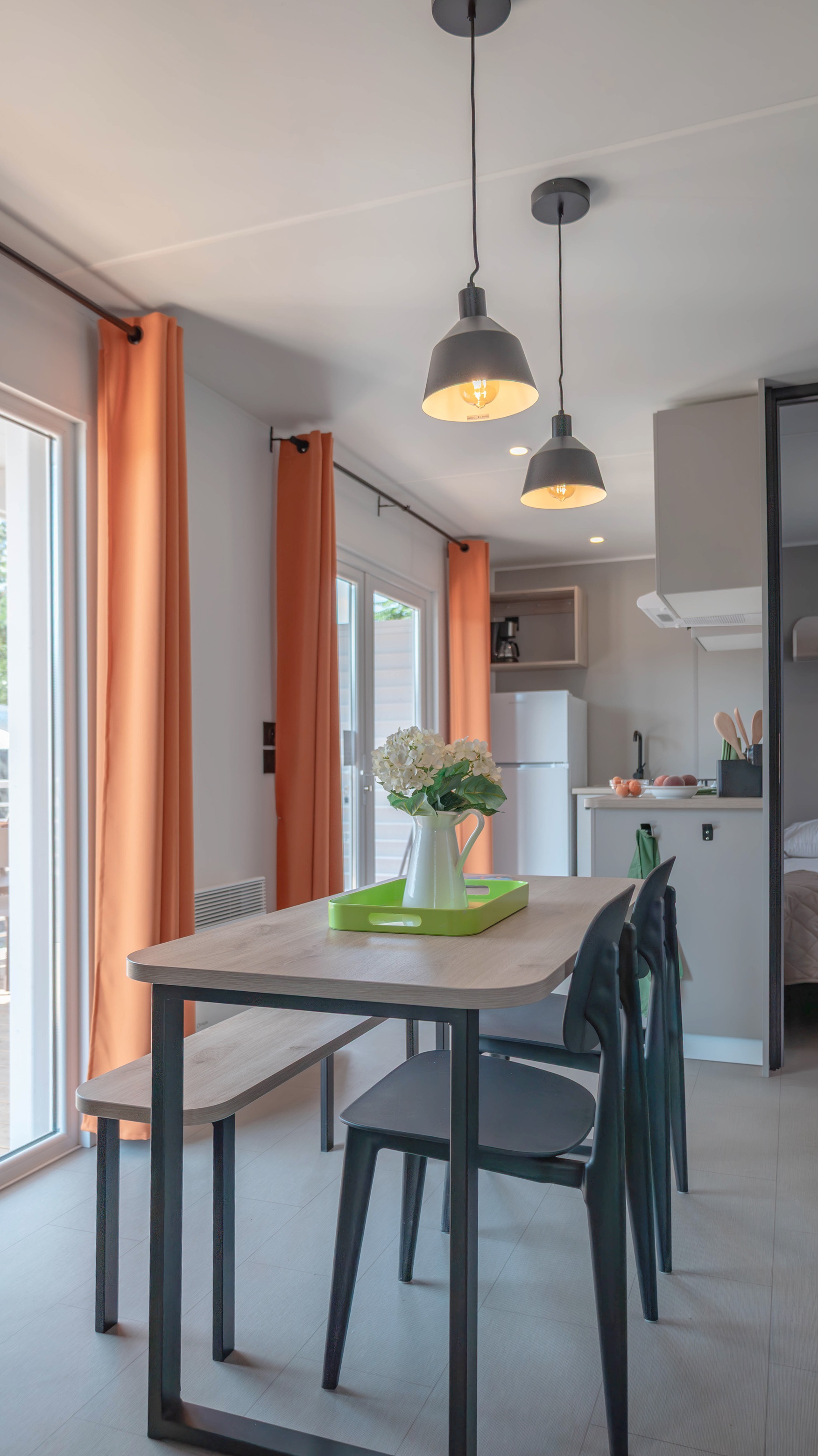 Spaziosa e moderna, la nostra mobile home da 30 m² è ideale per coppie o famiglie fino a 4 persone. Il bagno alla francese, con wc separato, garantisce praticità, mentre la zona giorno con cucina attrezzata consente di gustare i pasti in tranquillità, anche all’aperto sulla terrazza coperta da 15 m².