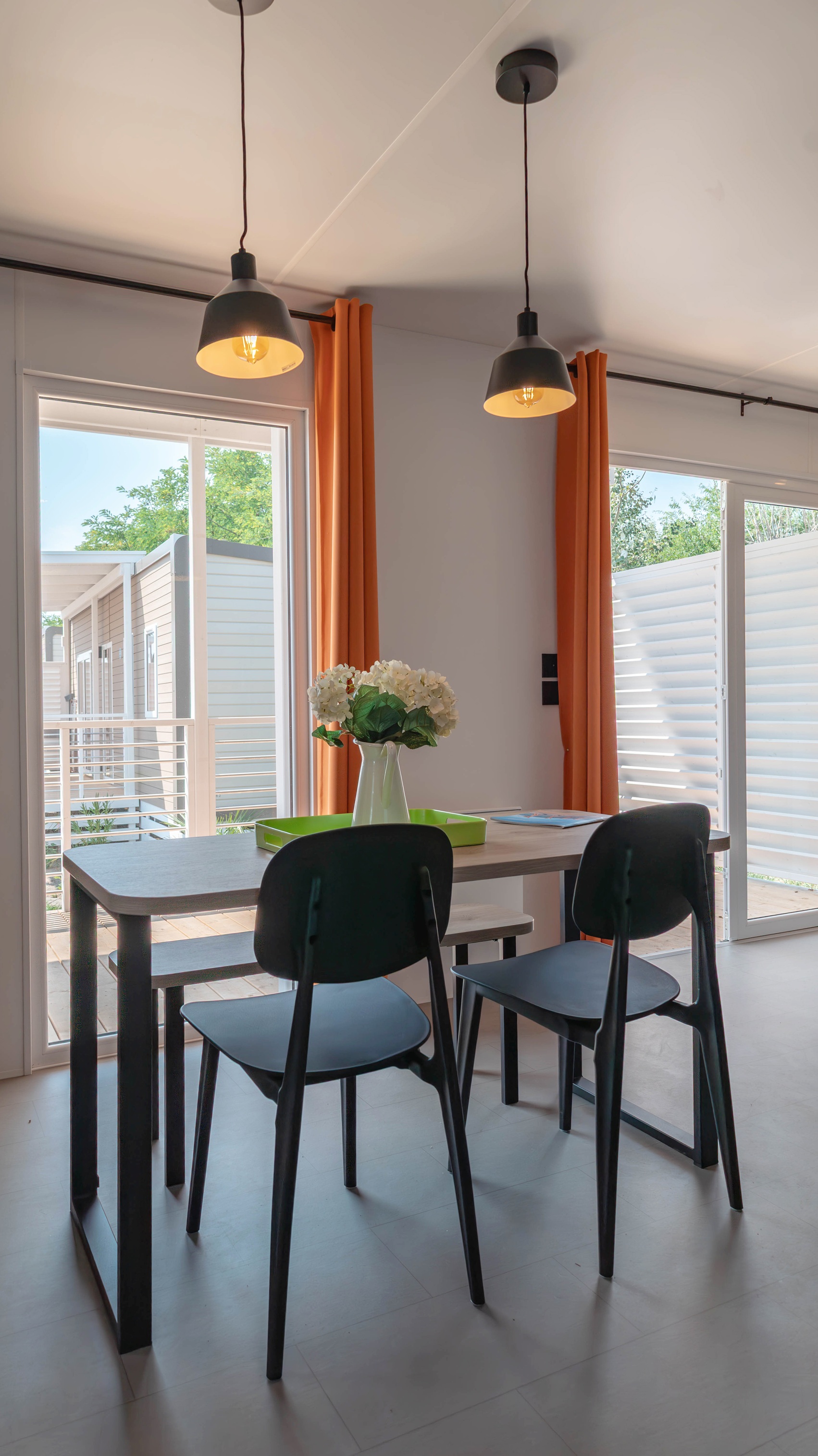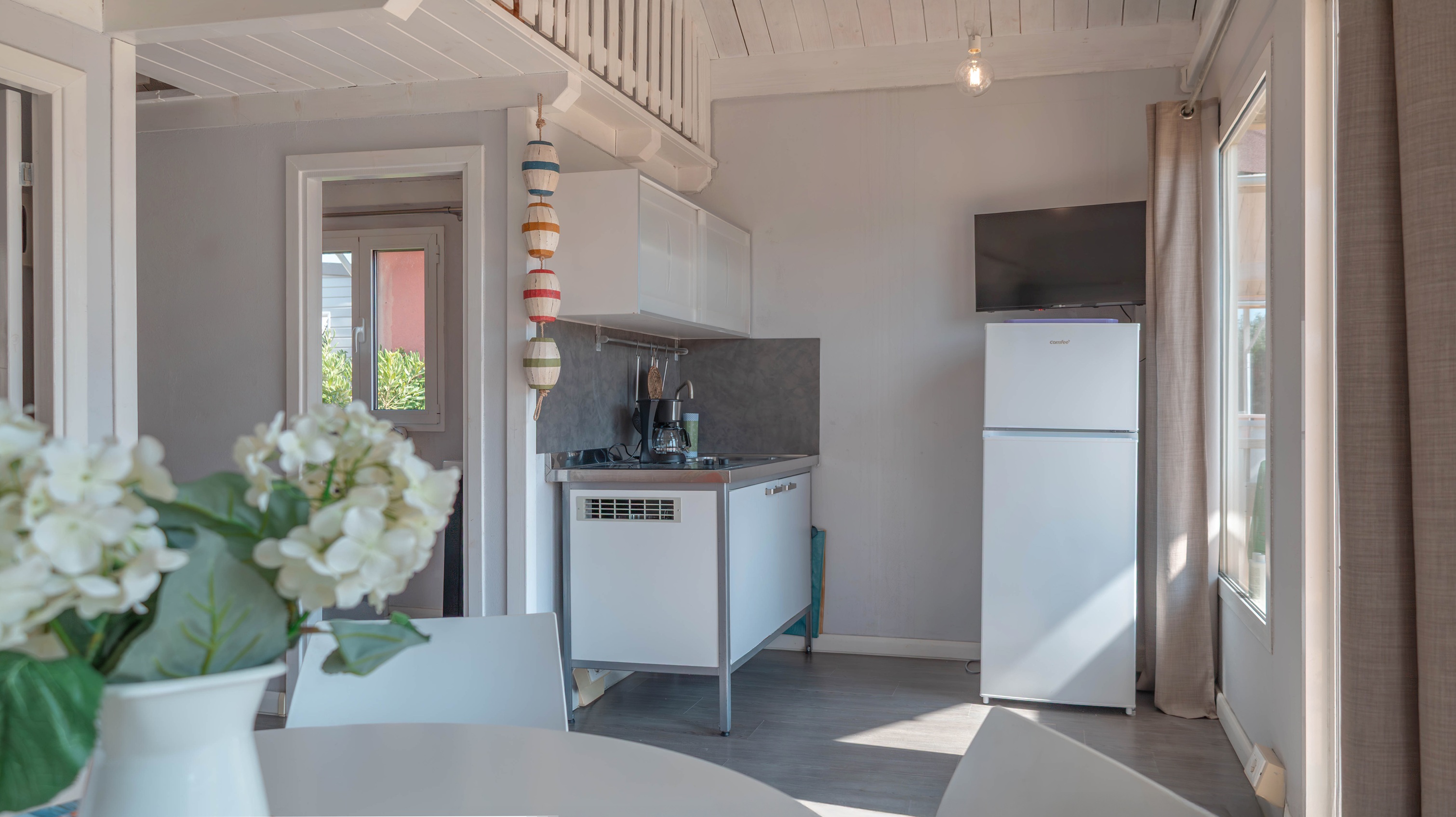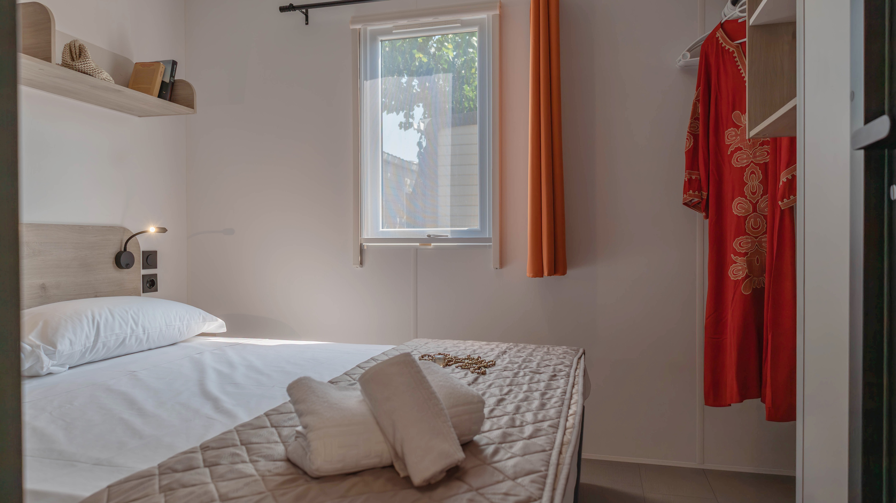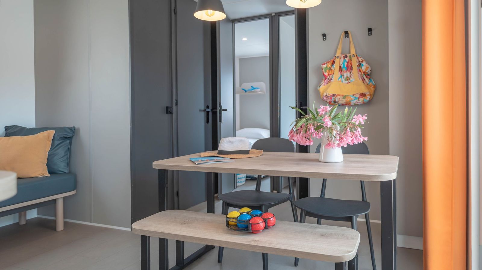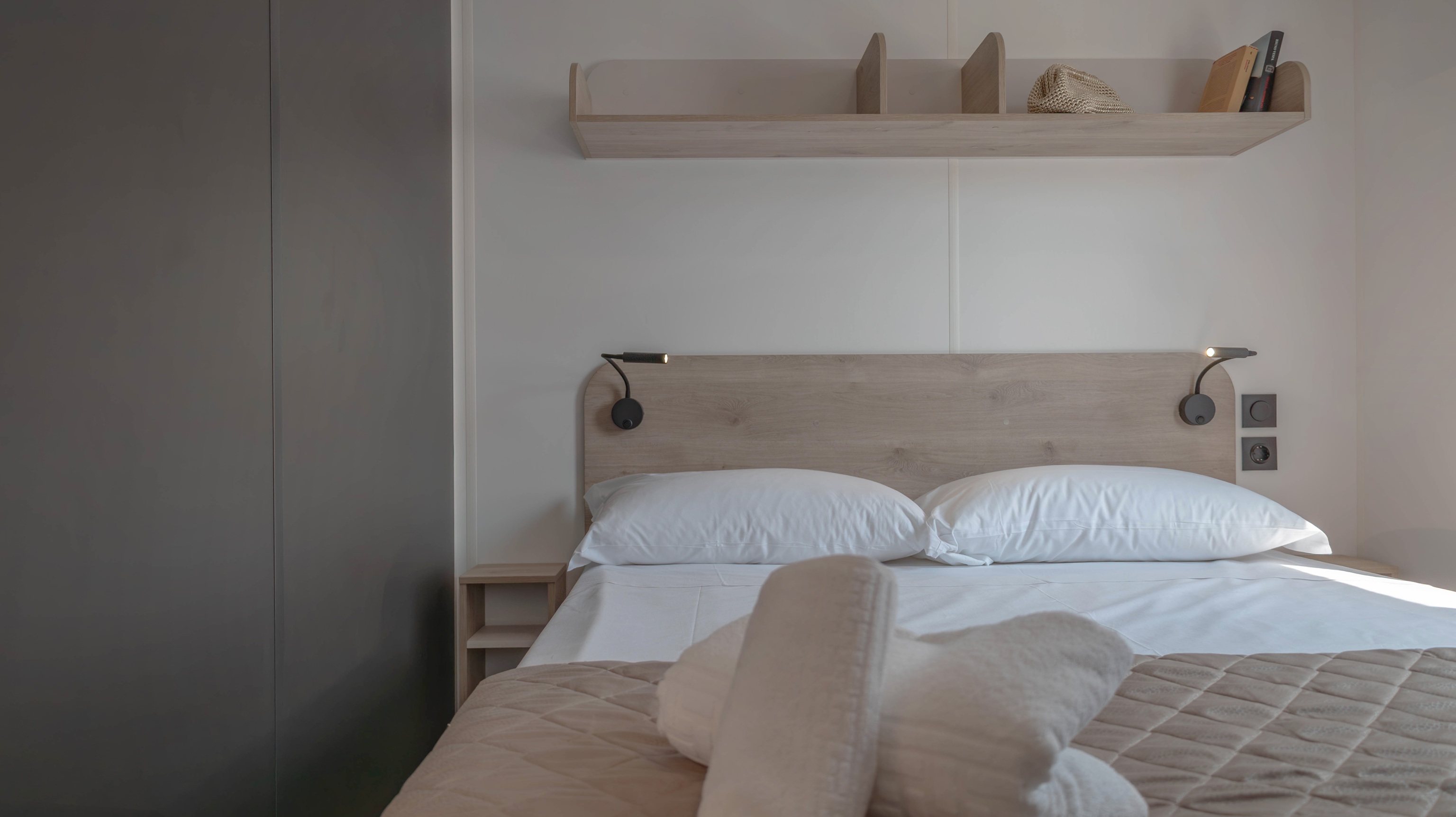 Spaziosa e moderna, la nostra mobile home da 30 m² è ideale per coppie o famiglie fino a 4 persone. Il bagno alla francese, con wc separato, garantisce praticità, mentre la zona giorno con cucina attrezzata consente di gustare i pasti in tranquillità, anche all’aperto sulla terrazza coperta da 15 m².