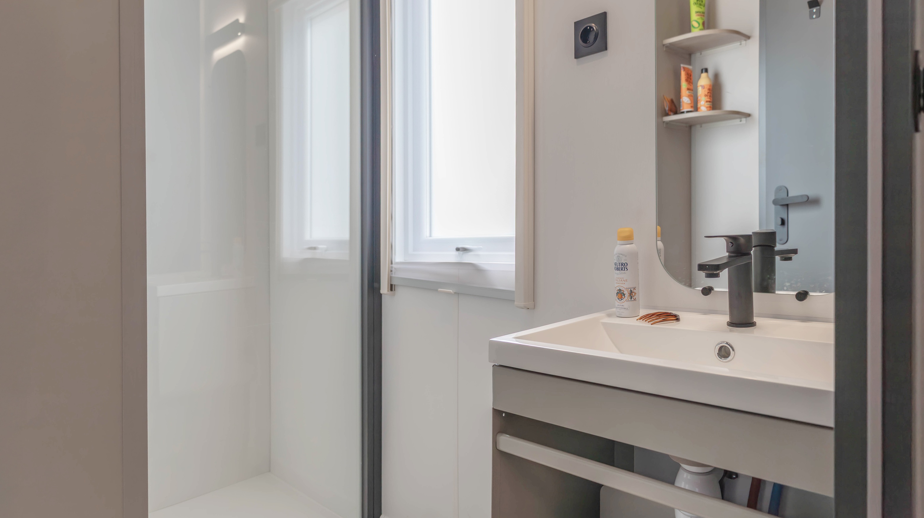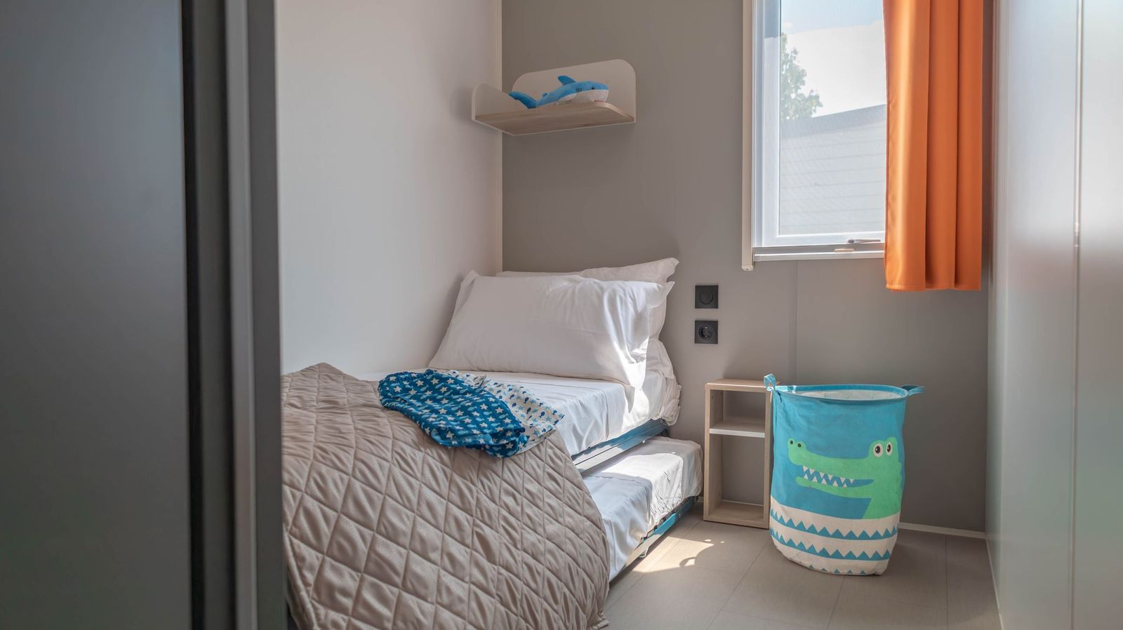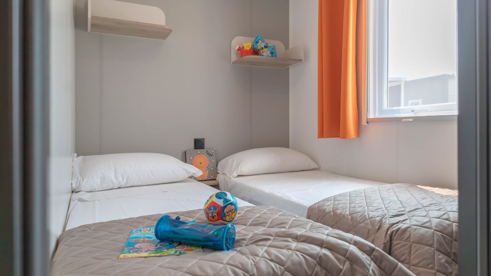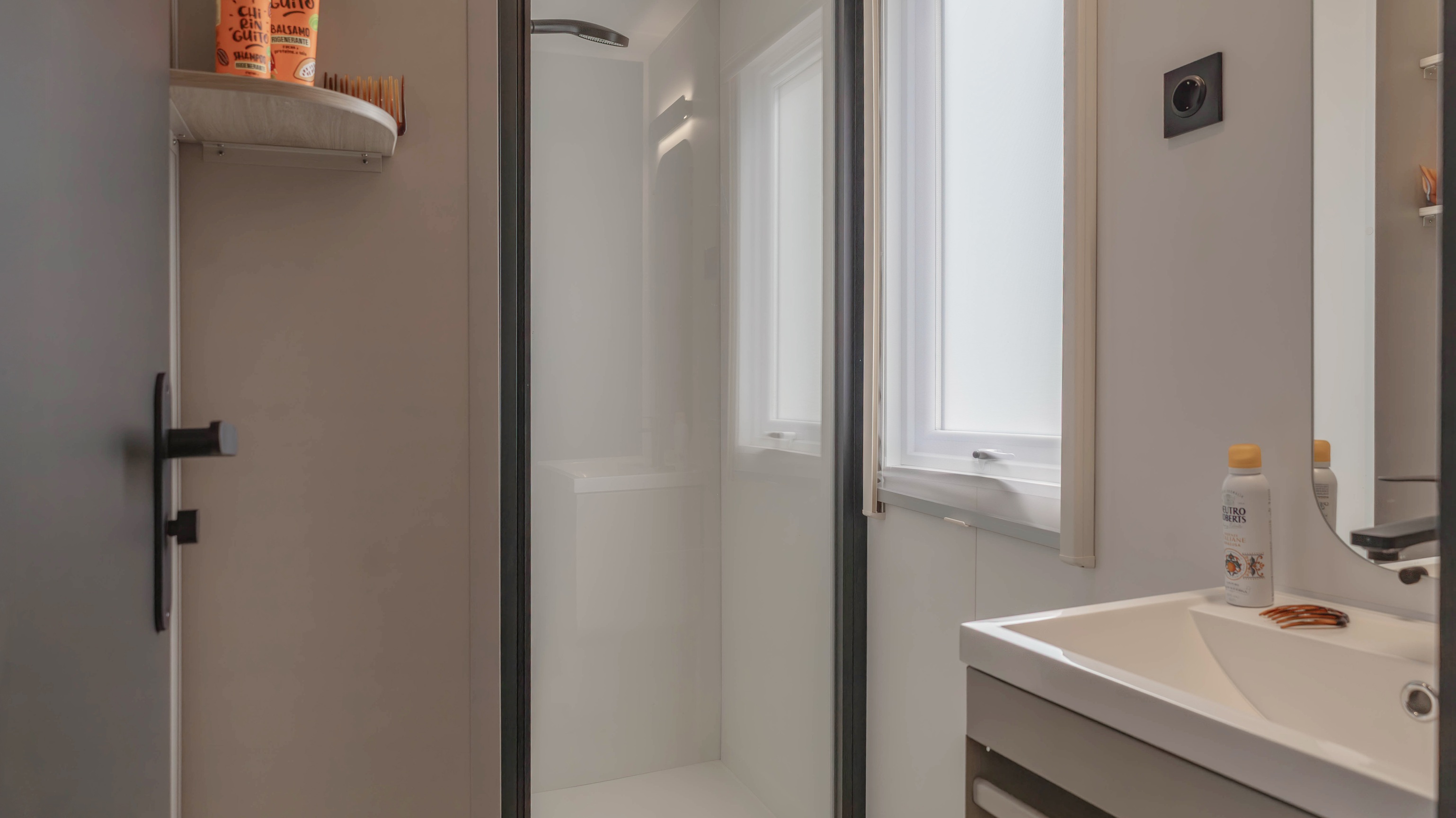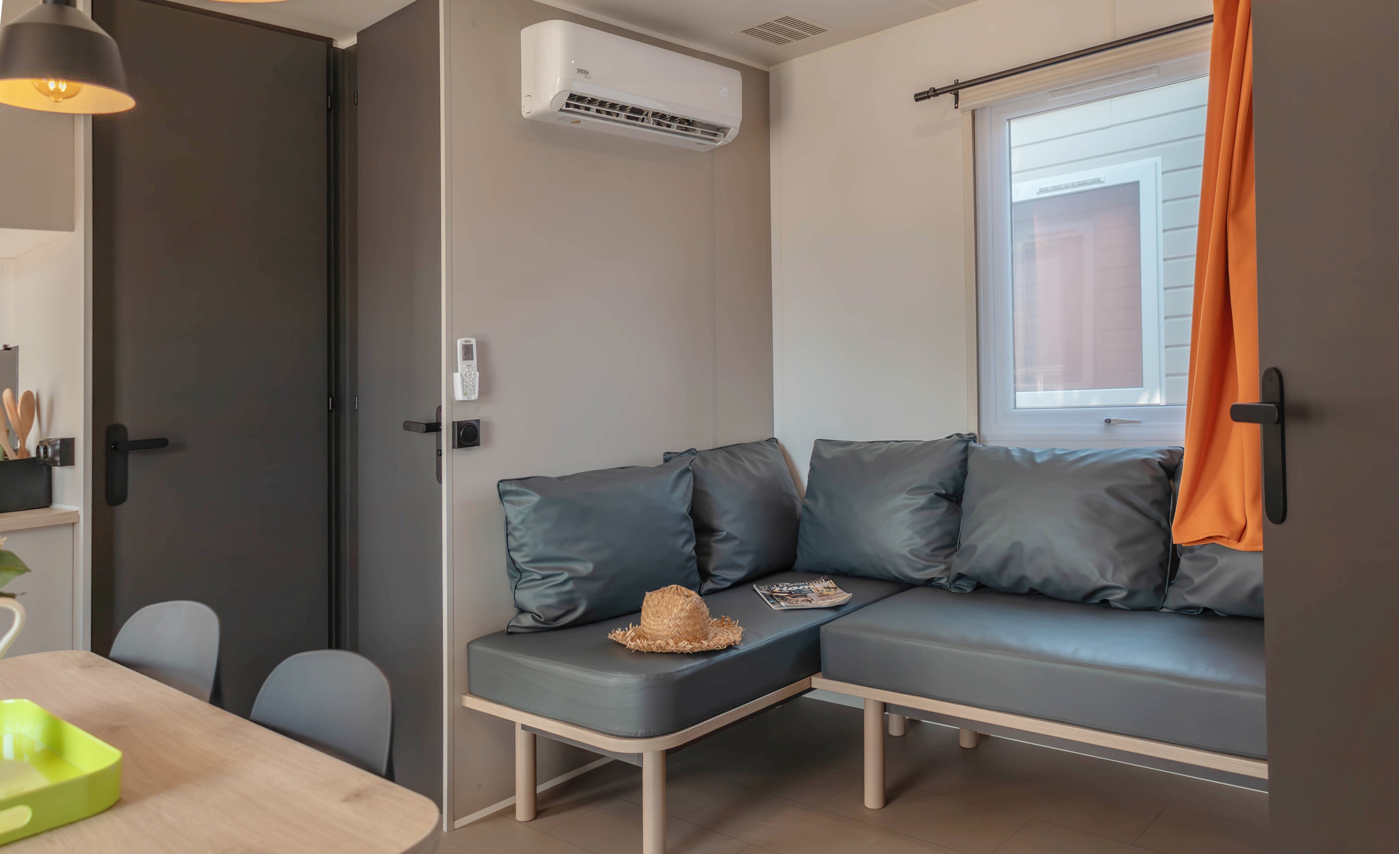 Spaziosa e moderna, la nostra mobile home da 30 m² è ideale per coppie o famiglie fino a 4 persone. Il bagno alla francese, con wc separato, garantisce praticità, mentre la zona giorno con cucina attrezzata consente di gustare i pasti in tranquillità, anche all’aperto sulla terrazza coperta da 15 m².