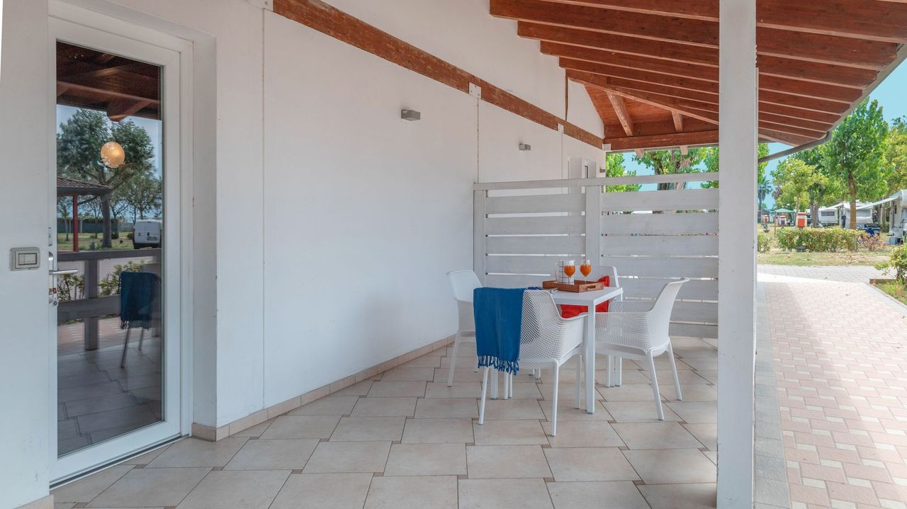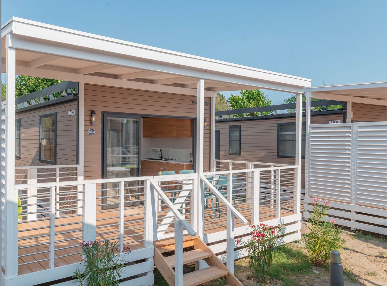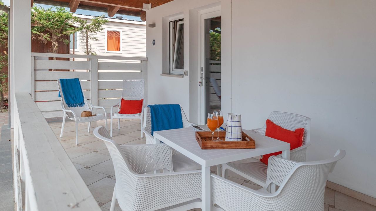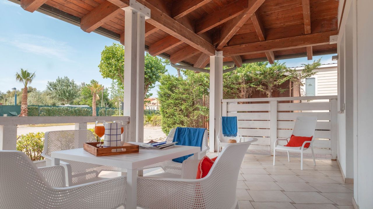 Mobile home di 33 m² di nuova concezione a direttamente sul mare, può ospitare da 2 a 5 persone, ottima sia in coppia che in famiglia con doppio bagno. Si potrà pranzare nella zona giorno in tranquillità grazie alla cucina attrezzata, o in alternativa sulla terrazza coperta di 15 m² . Presenti in dotazione: microonde, tv satellitare e aria condizionata. Nel prezzo sono inclusi i consumi di acqua, luce e gas, lenzuola, aria condizionata , 1 ombrellone e 2 lettini nella nostra spiaggia privata, accesso alla piscina e 1 posto auto. Su richiesta e in base a disponibilità: cancello per chiudere la veranda, culla, spondina da letto e seggiolone.