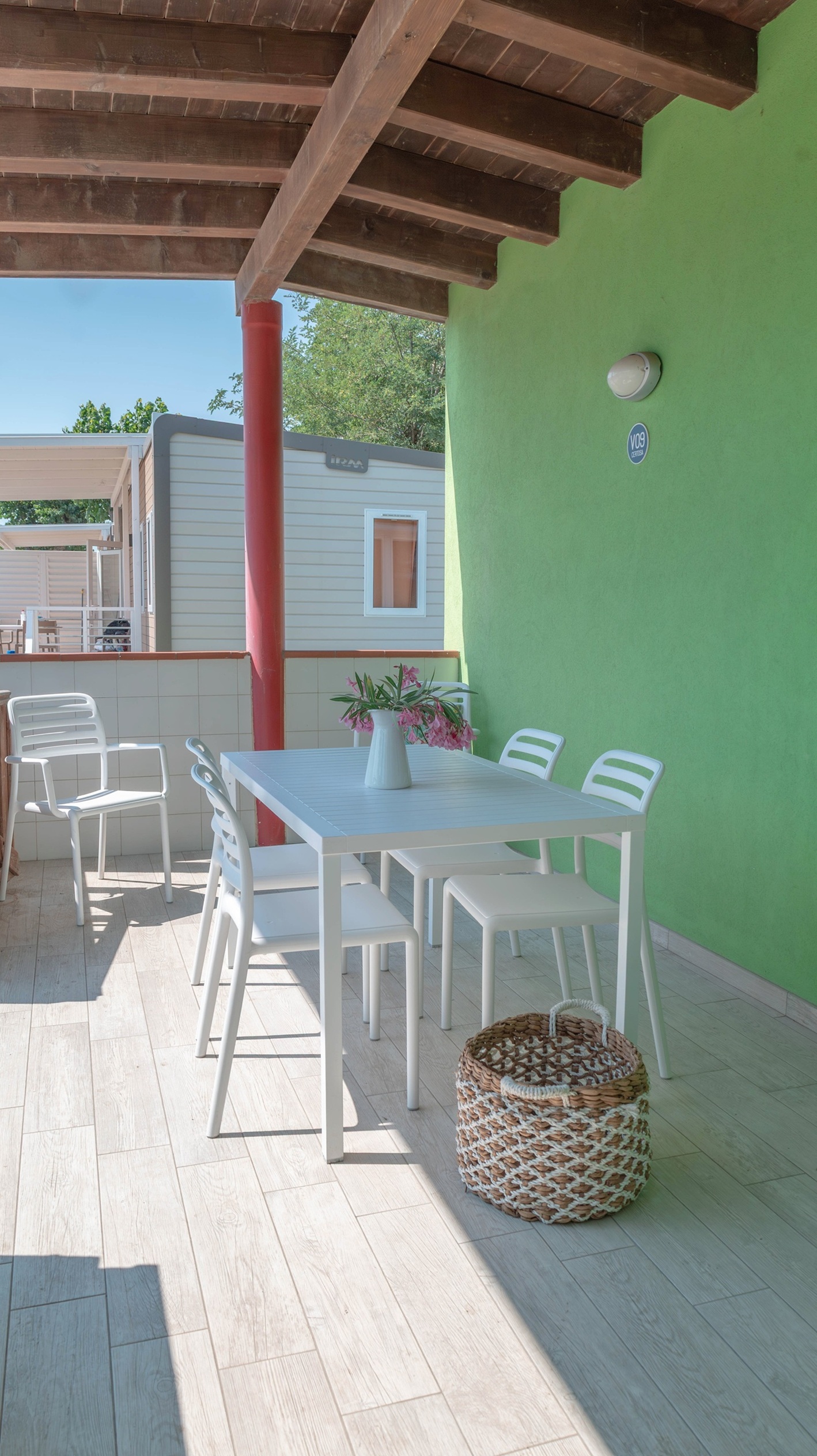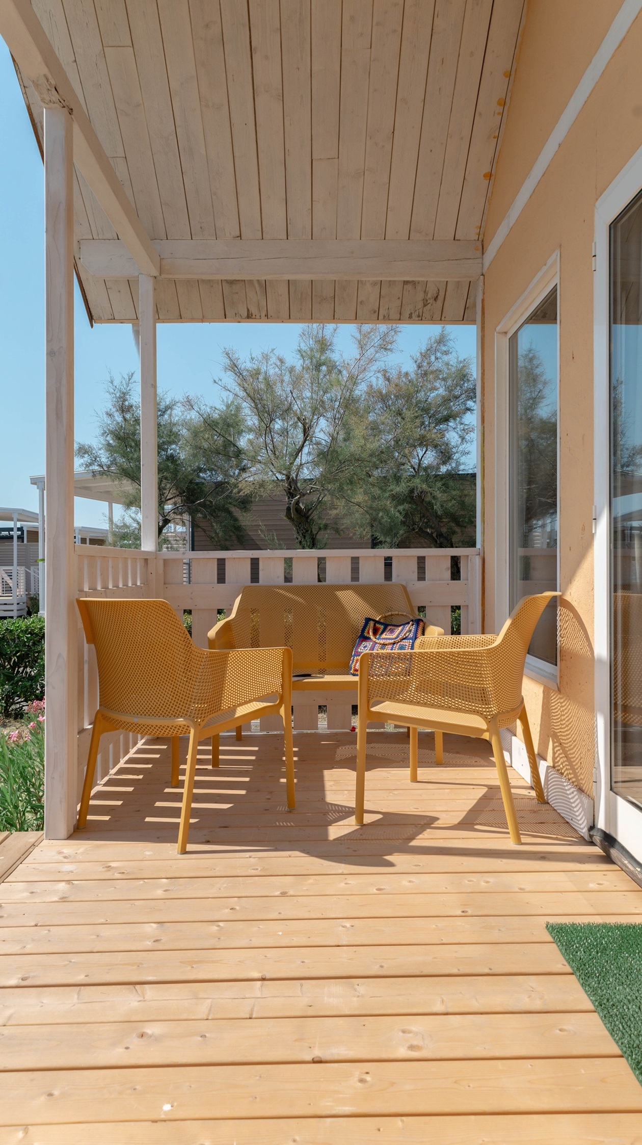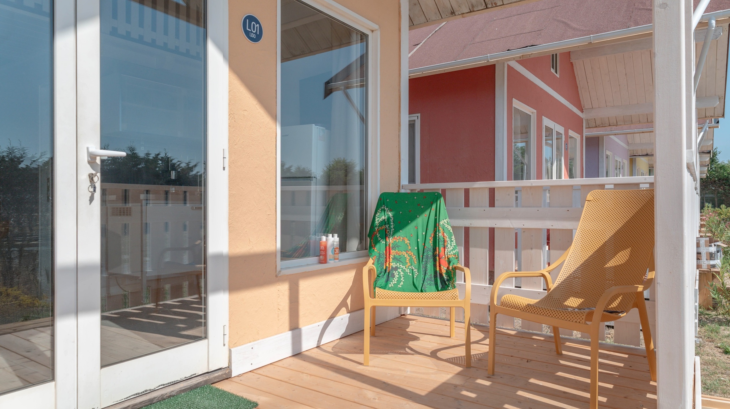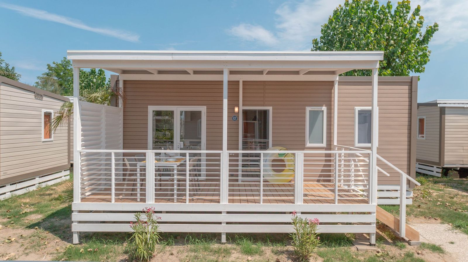 Mobile home di 33 m² di nuova concezione a direttamente sul mare, può ospitare da 2 a 5 persone, ottima sia in coppia che in famiglia con doppio bagno. Si potrà pranzare nella zona giorno in tranquillità grazie alla cucina attrezzata, o in alternativa sulla terrazza coperta di 15 m² . Presenti in dotazione: microonde, tv satellitare e aria condizionata. Nel prezzo sono inclusi i consumi di acqua, luce e gas, lenzuola, aria condizionata , 1 ombrellone e 2 lettini nella nostra spiaggia privata, accesso alla piscina e 1 posto auto. Su richiesta e in base a disponibilità: cancello per chiudere la veranda, culla, spondina da letto e seggiolone.