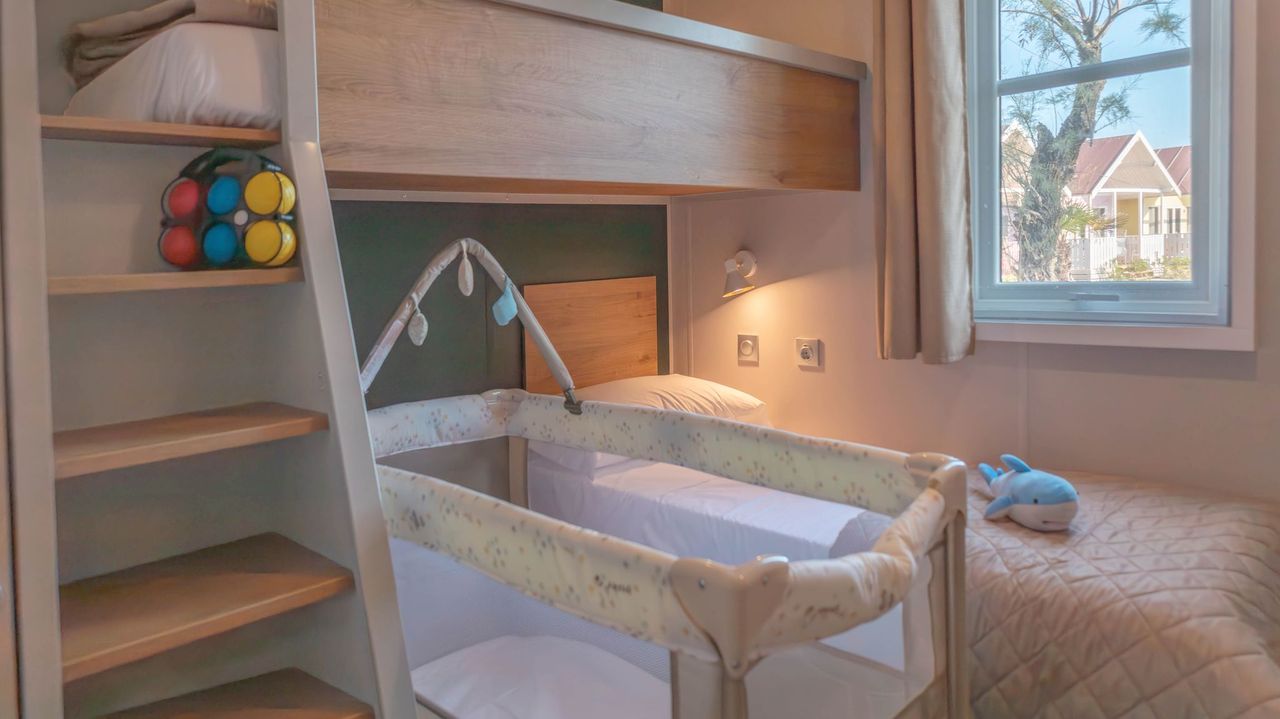 Mobile home di 31 m² di nuova concezione, può ospitare da 2 a 6 persone, ottima sia in coppia che in famiglia con bagno alla francese (wc separato). Si potrà pranzare nella zona giorno in tranquillità grazie alla cucina attrezzata, o in alternativa sulla terrazza coperta di 15 m². Presenti in dotazione: