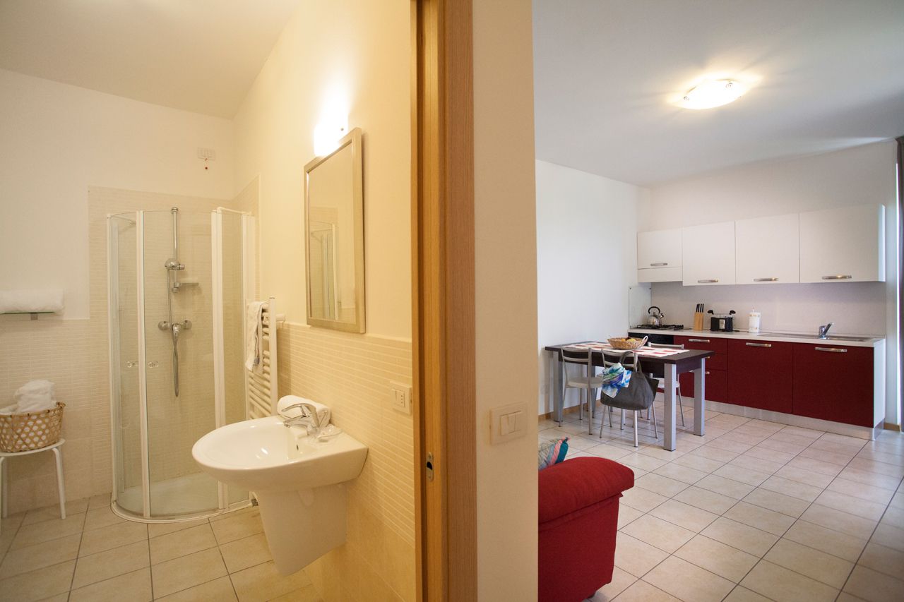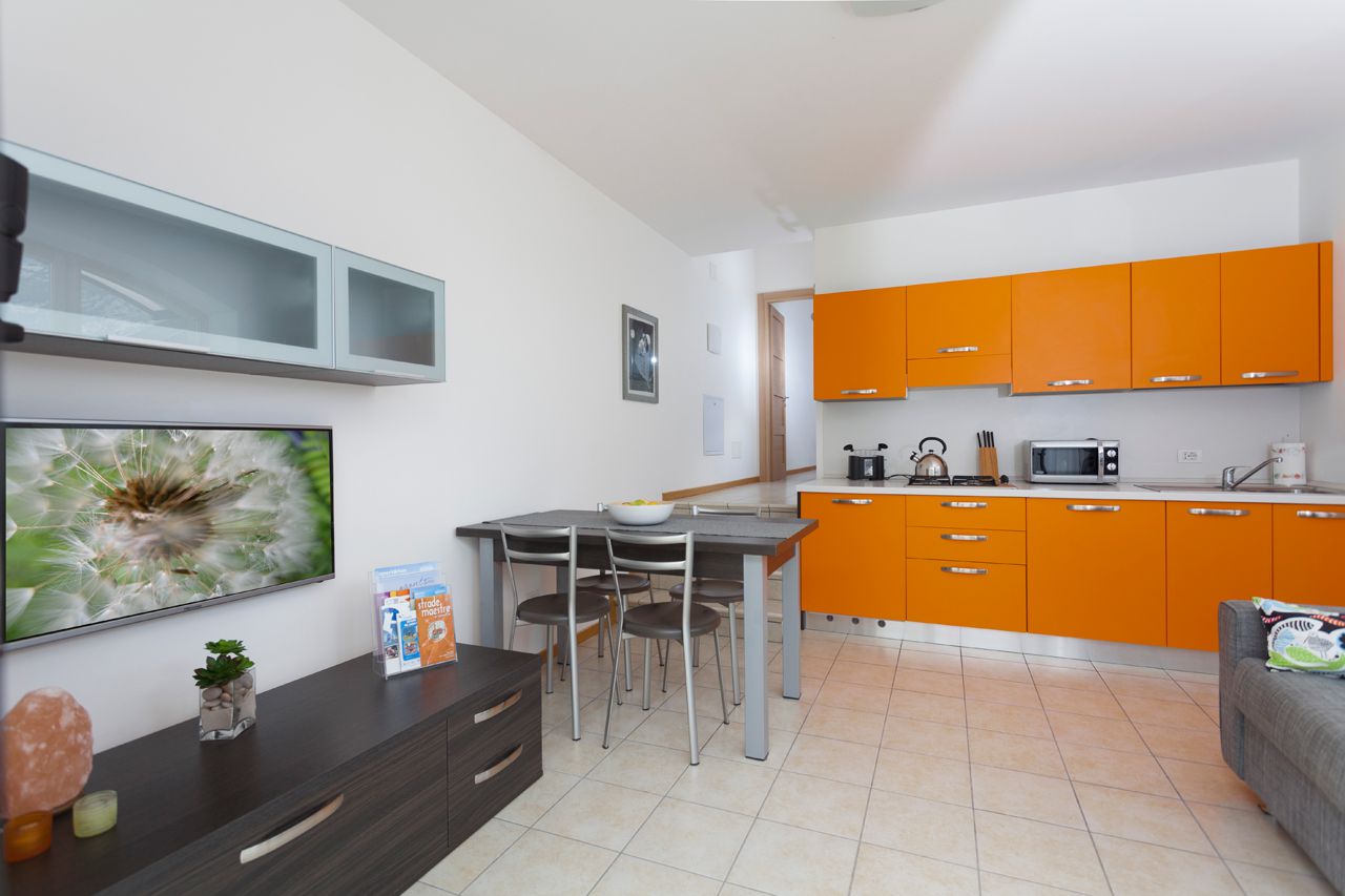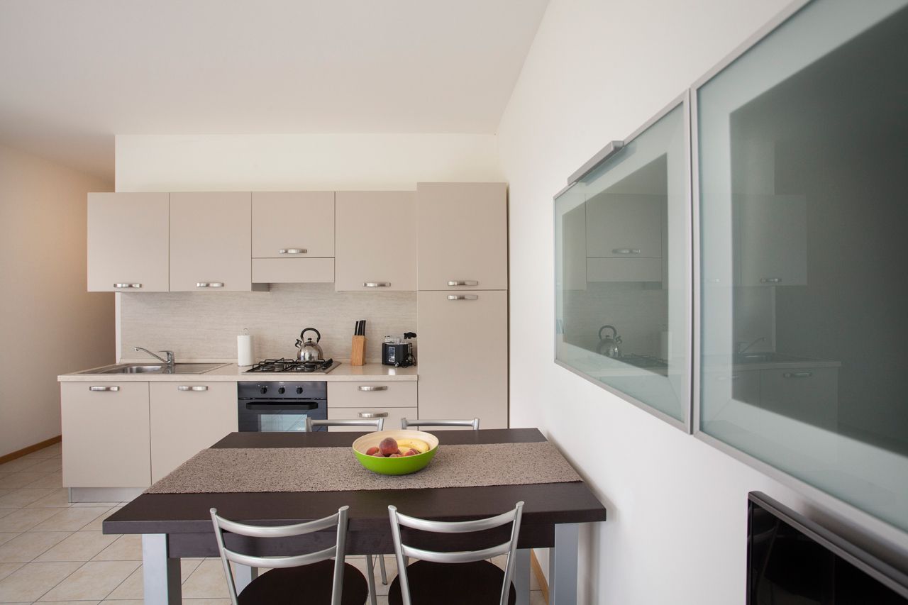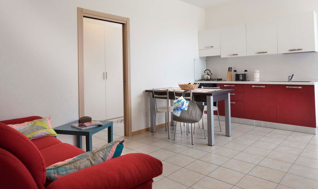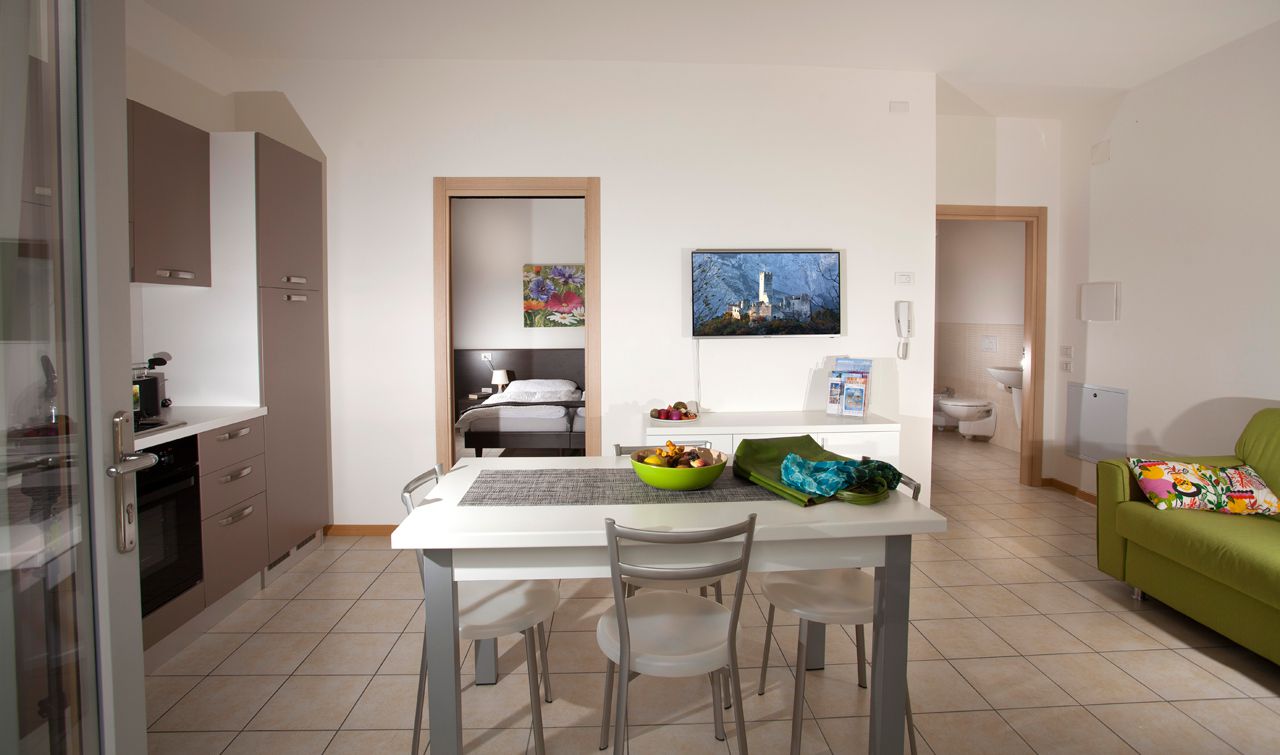 L' appartamento è composto da un soggiorno con angolo cottura, divano letto, camera da letto, bagno con doccia e ripostiglio.