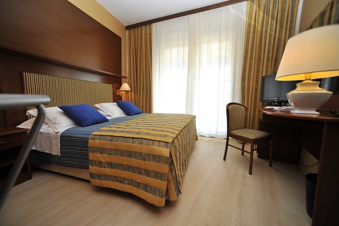Eleganti camere doppie o a uso singola, con balcone fronte mare e pavimento in parquet. Godetevi il massimo di una vacanza di fronte al mare Adriatico, con una vista spettacolare.