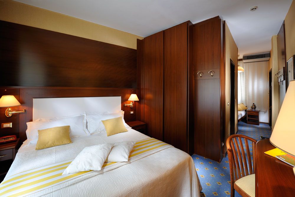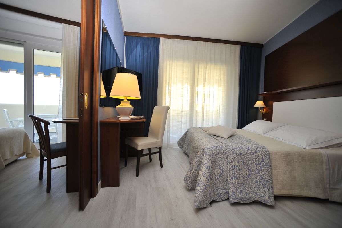 Camere doppie con letto matrimoniale e due lettini, con balcone e pavimento in moquette o parquet, ideali per famiglie con bambini fino a 10 anni.