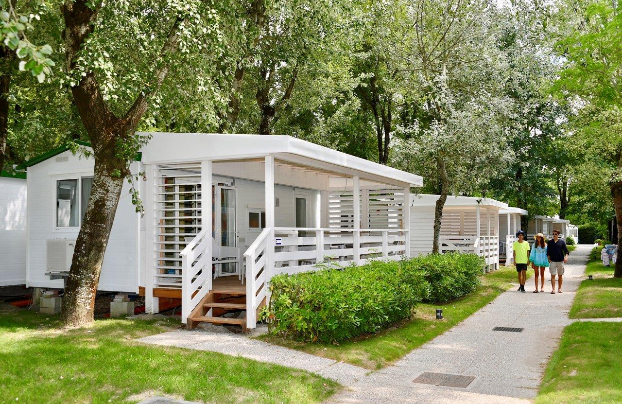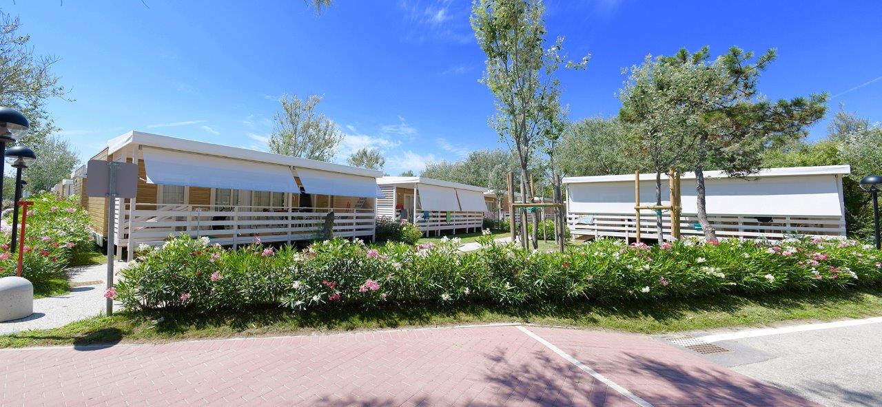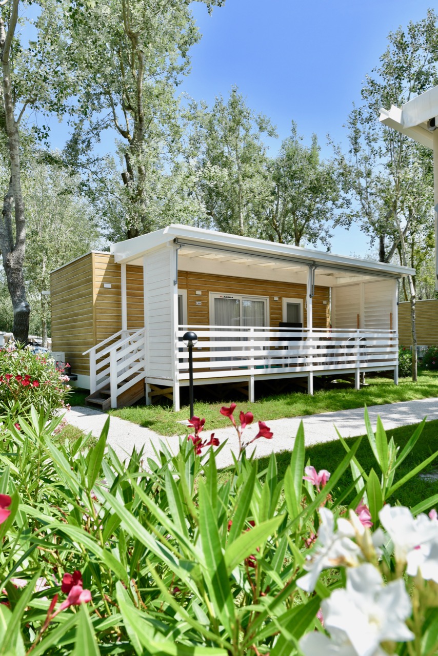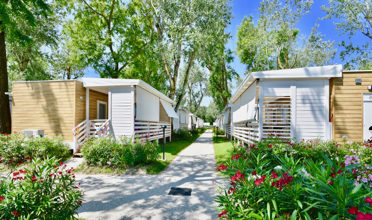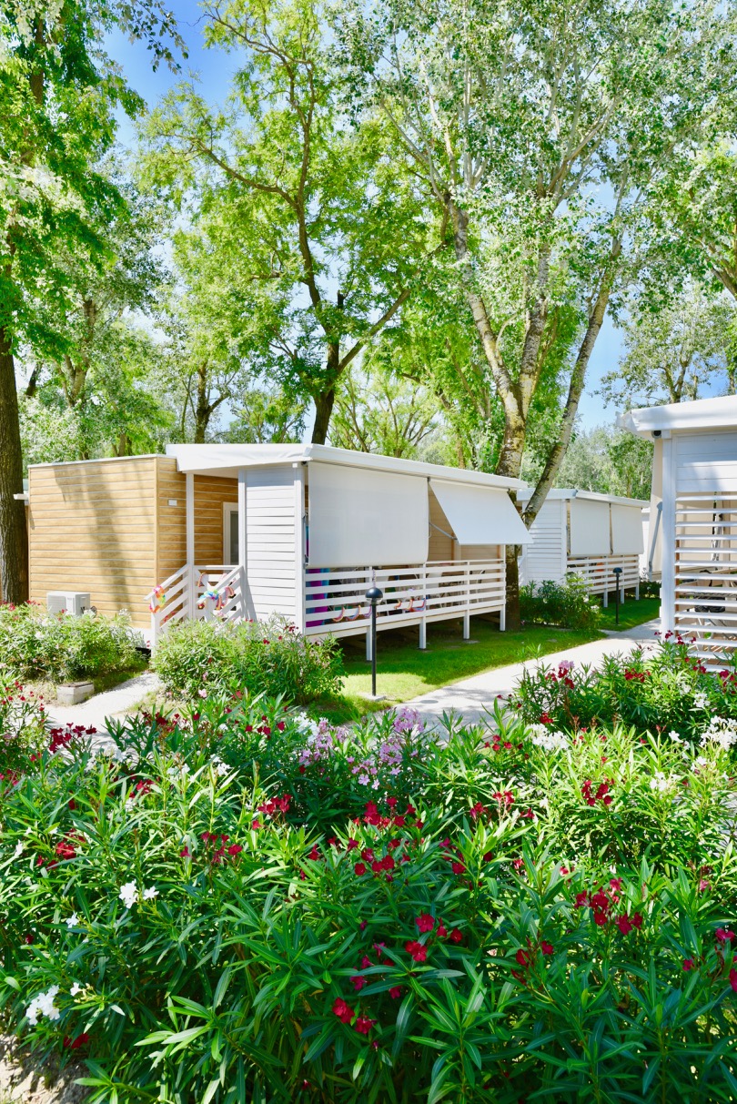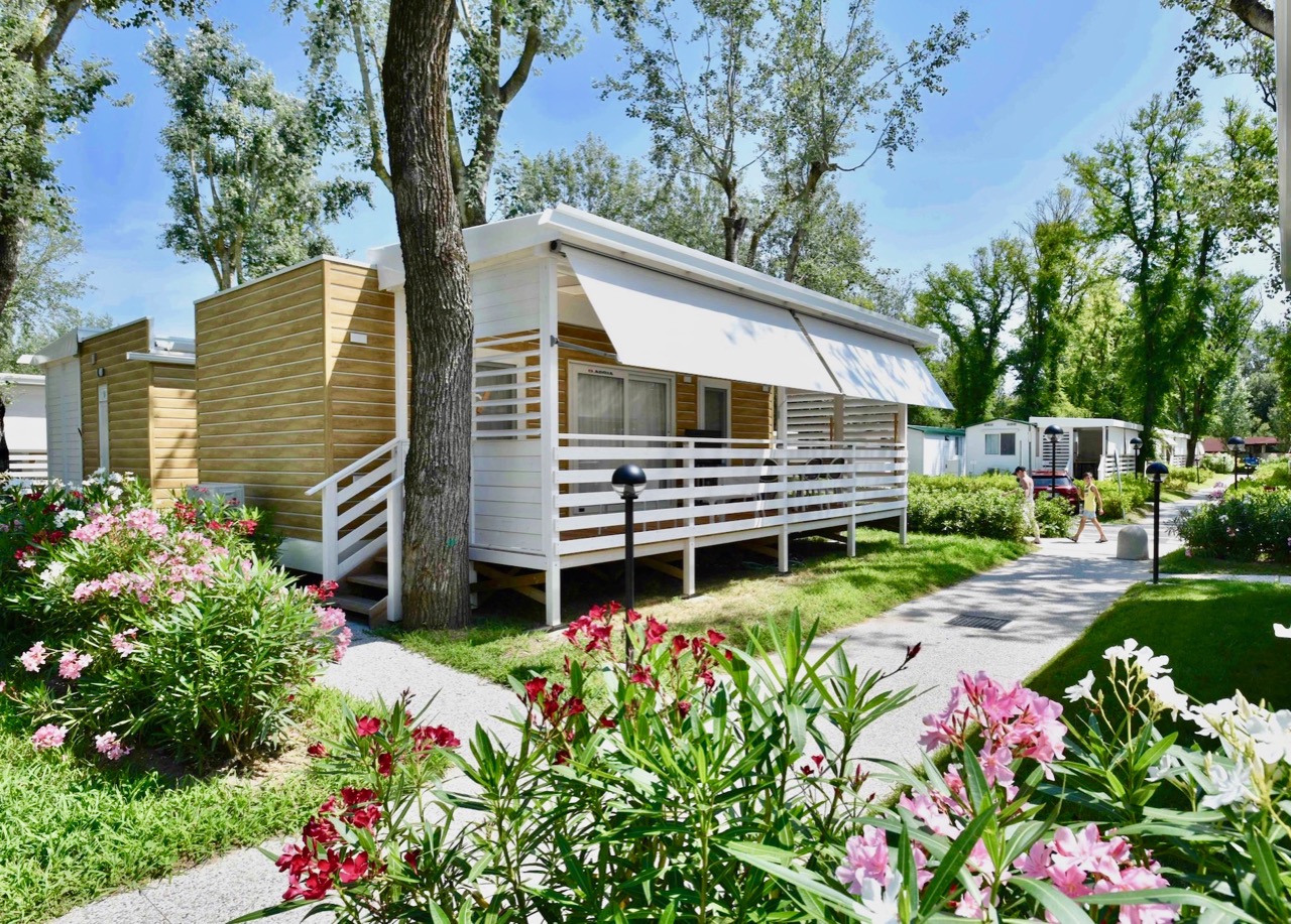 Elegante casa mobile posizionata nella zona iniziale del villaggio, tra viali pedonali alberati e fioriti.