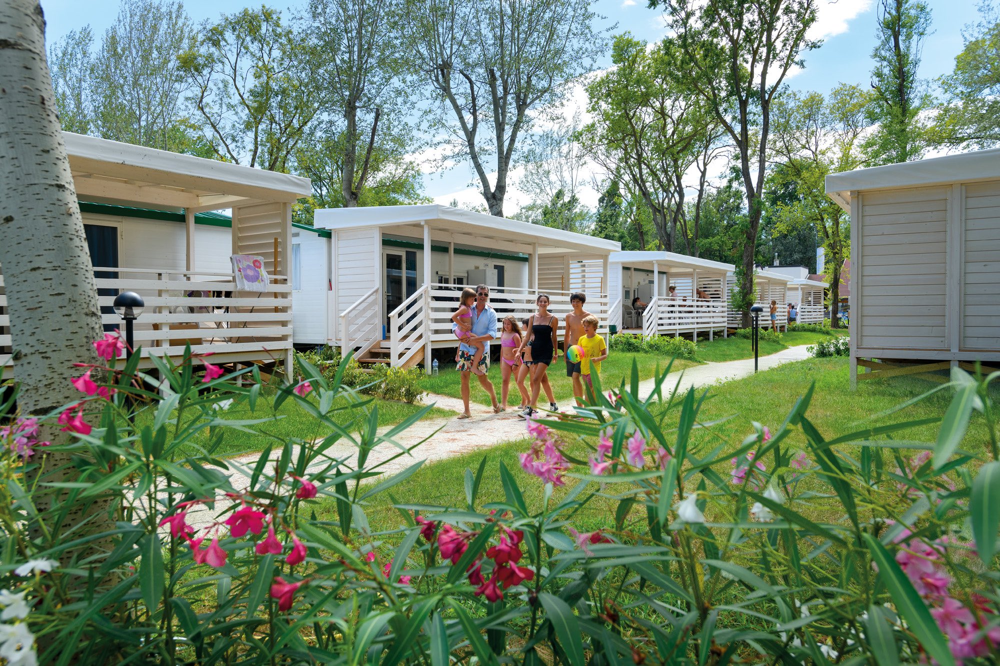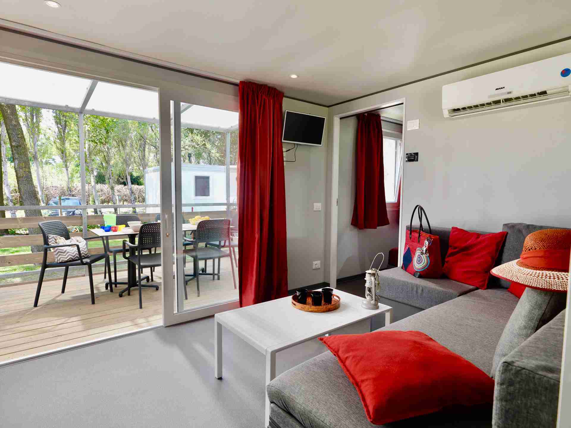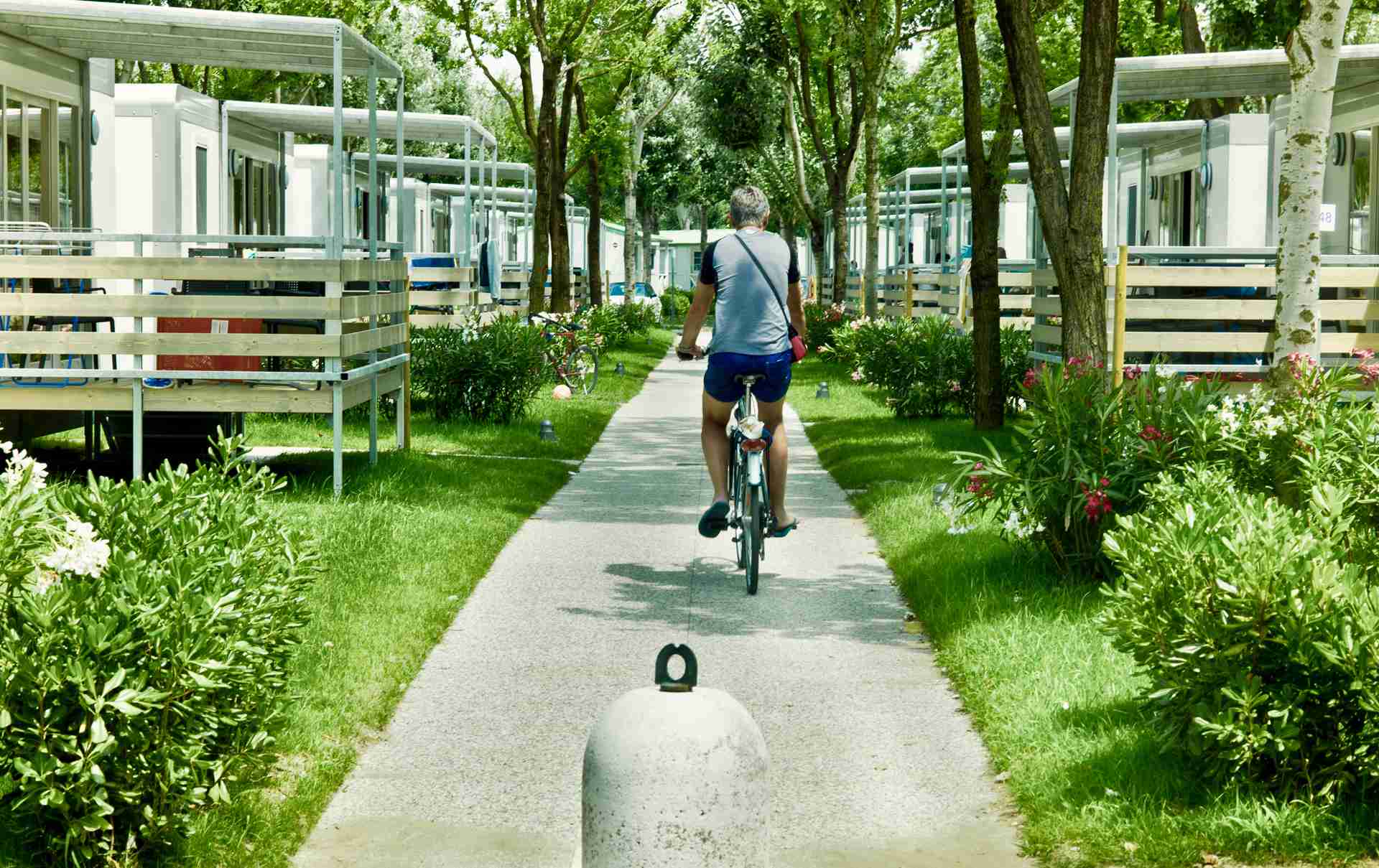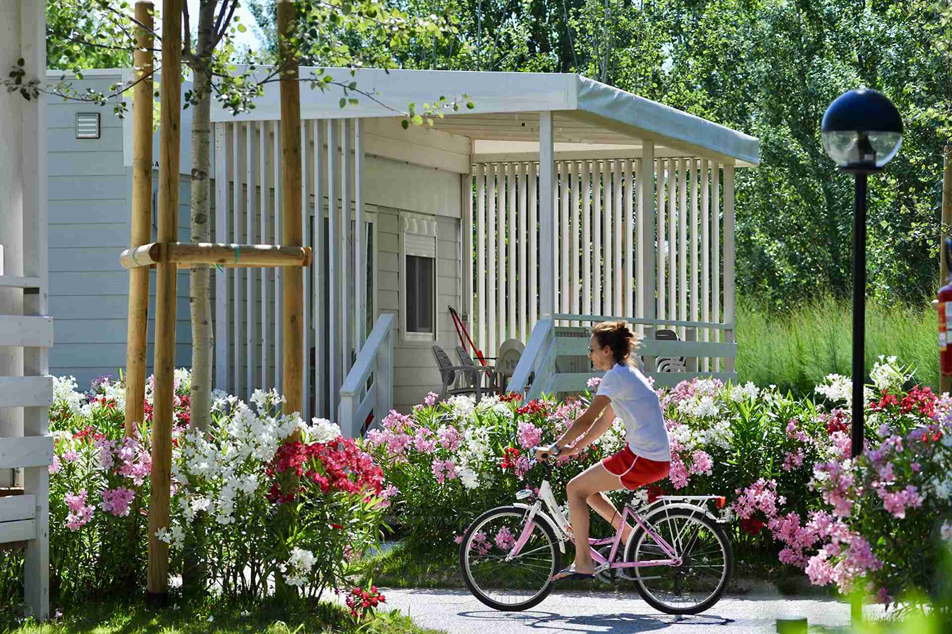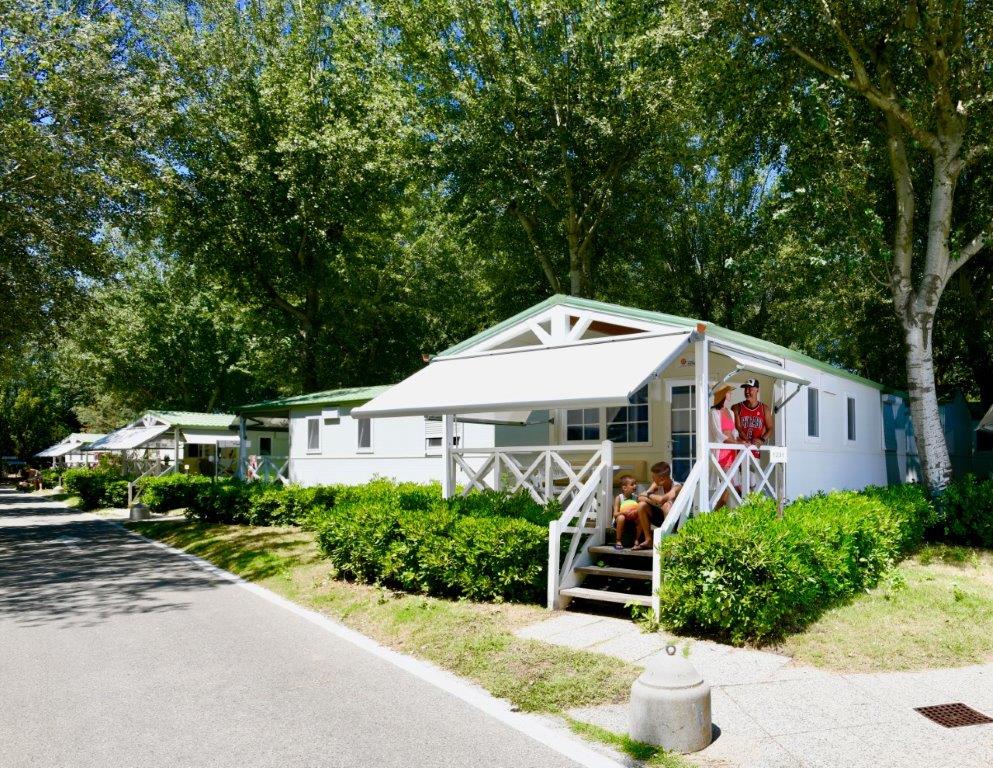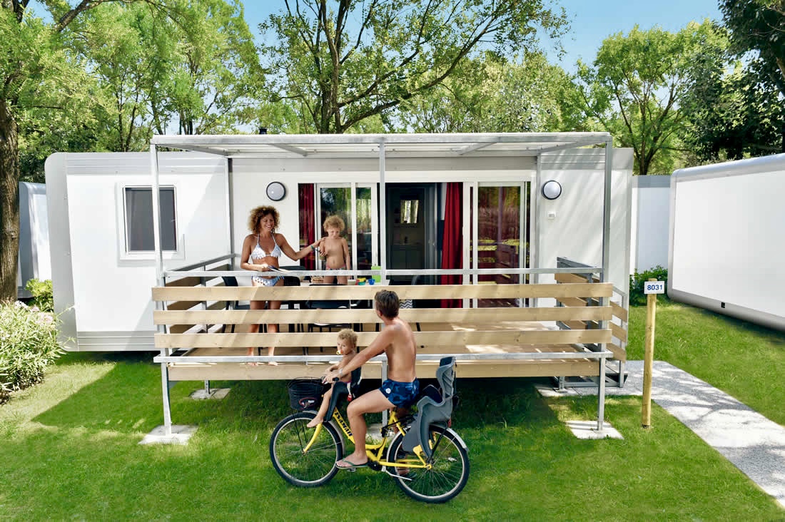 Elegante casa mobile posizionata nella zona iniziale del villaggio, tra viali pedonali alberati e fioriti.