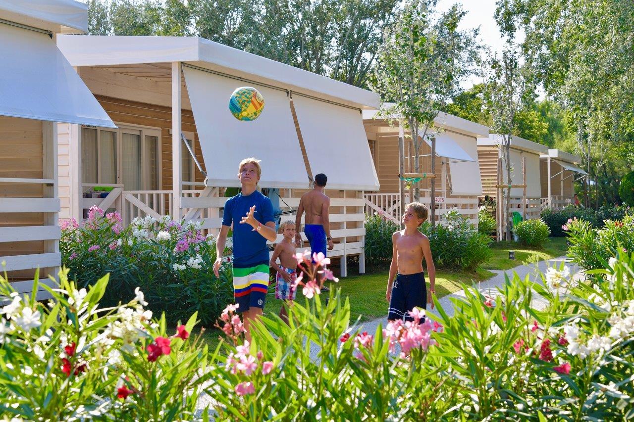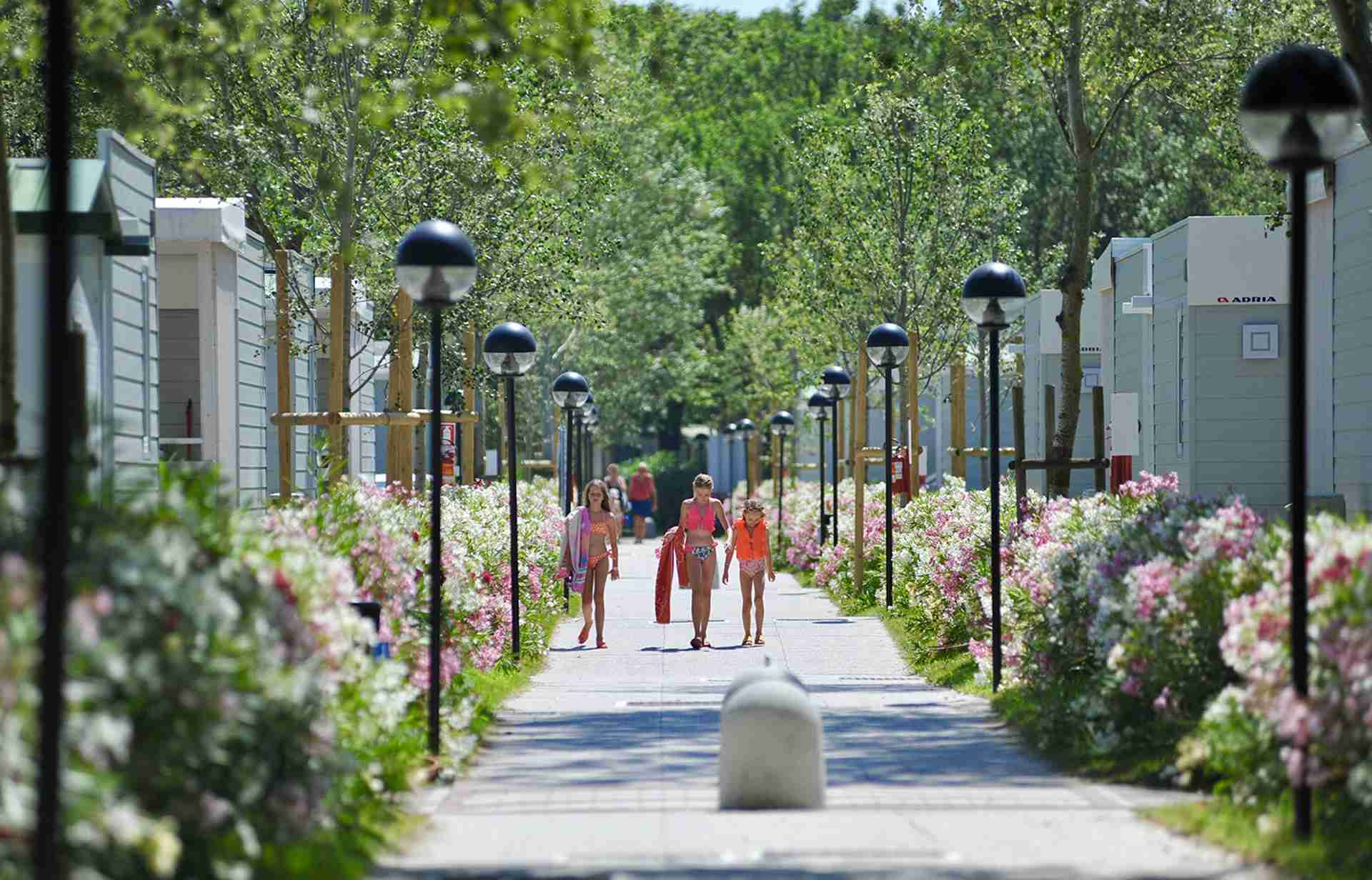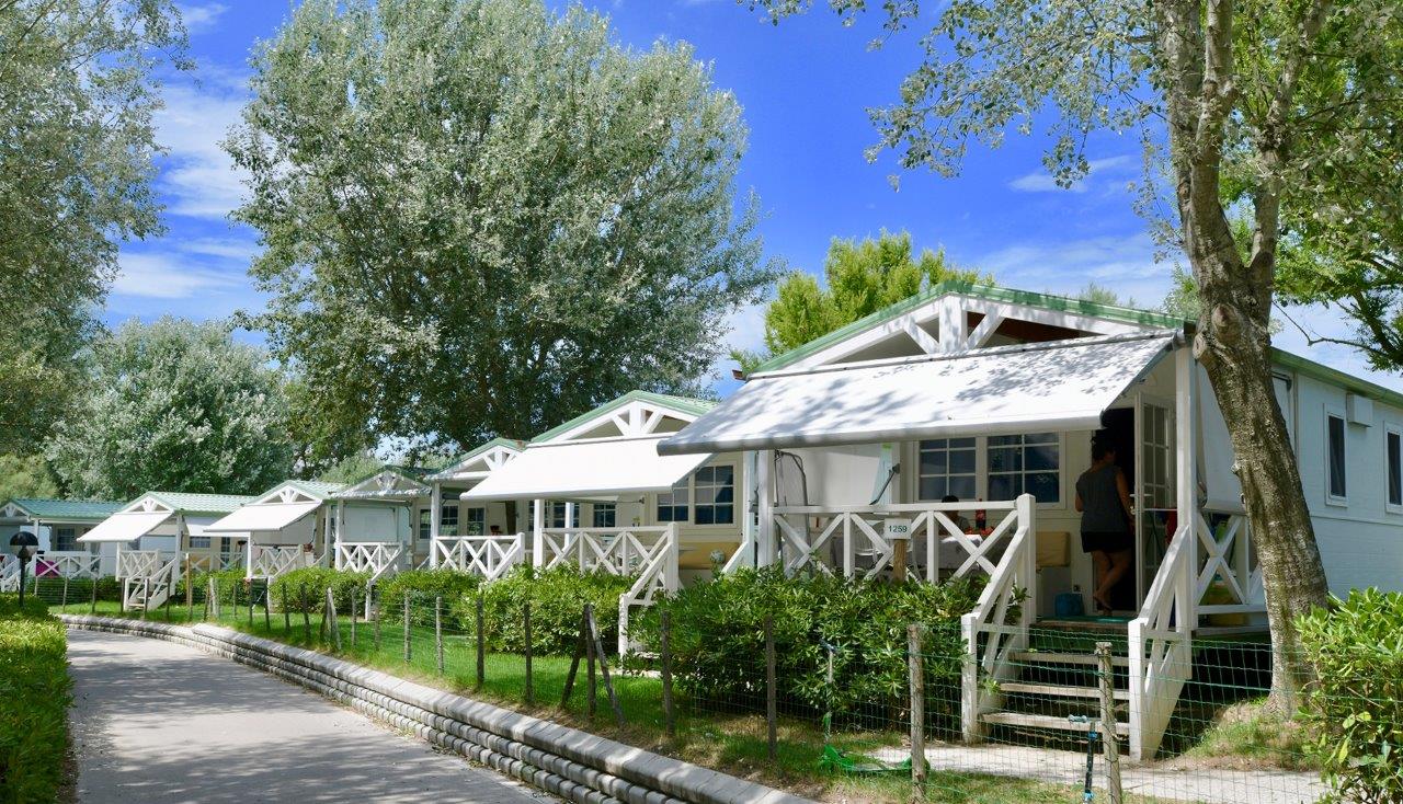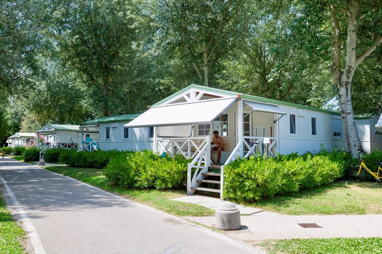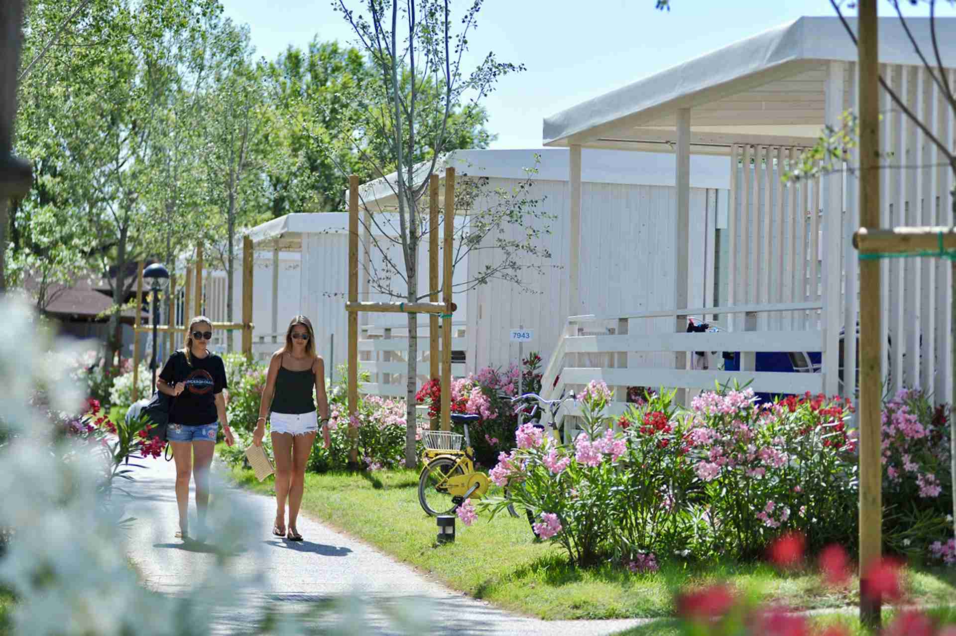 Elegante casa mobile posizionata nella zona iniziale del villaggio, tra viali pedonali alberati e fioriti.