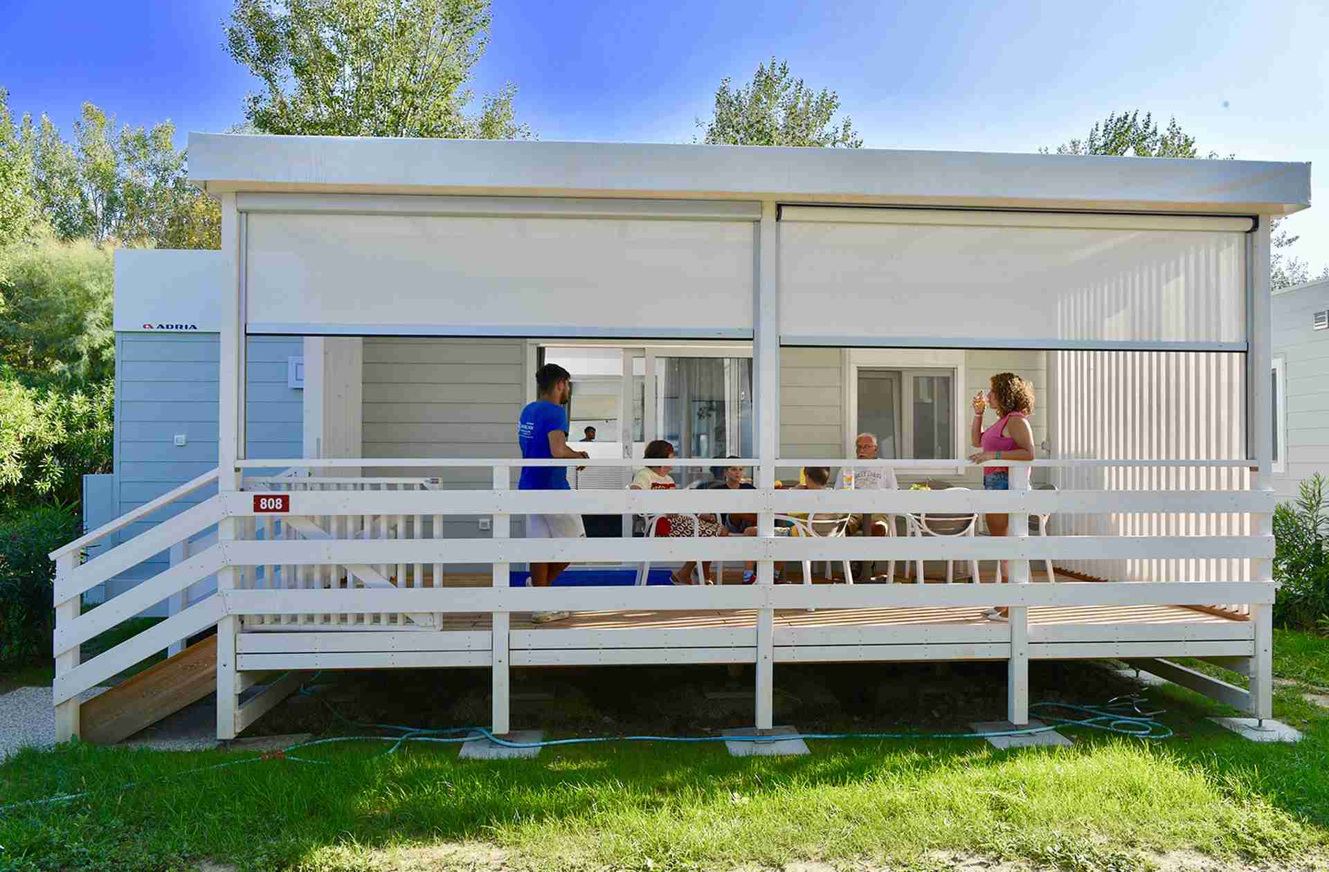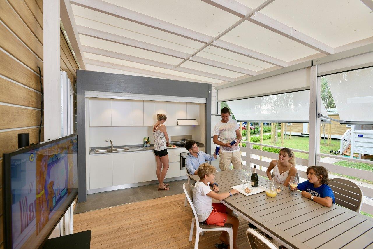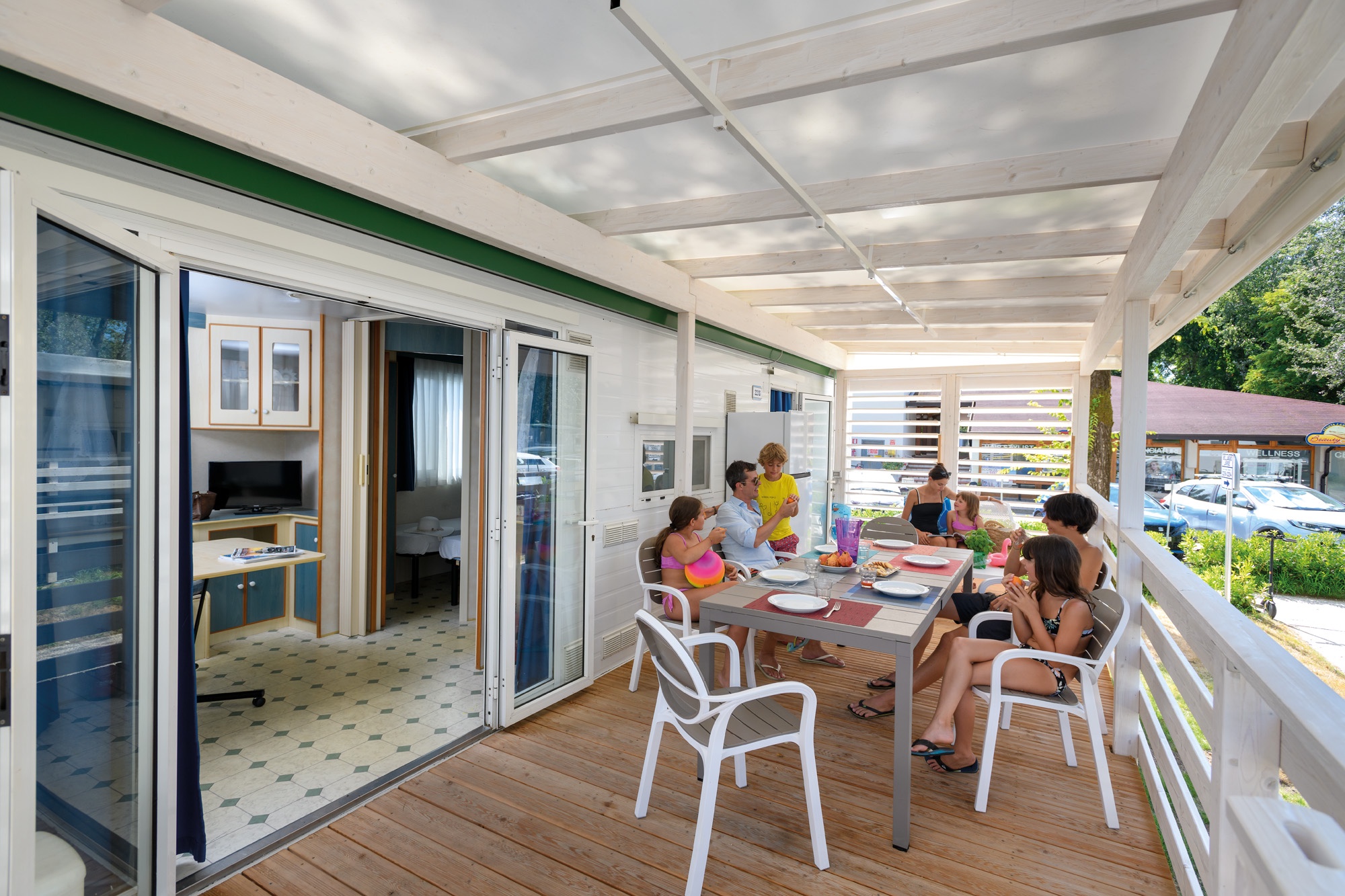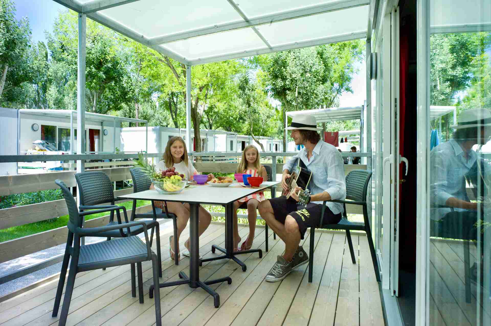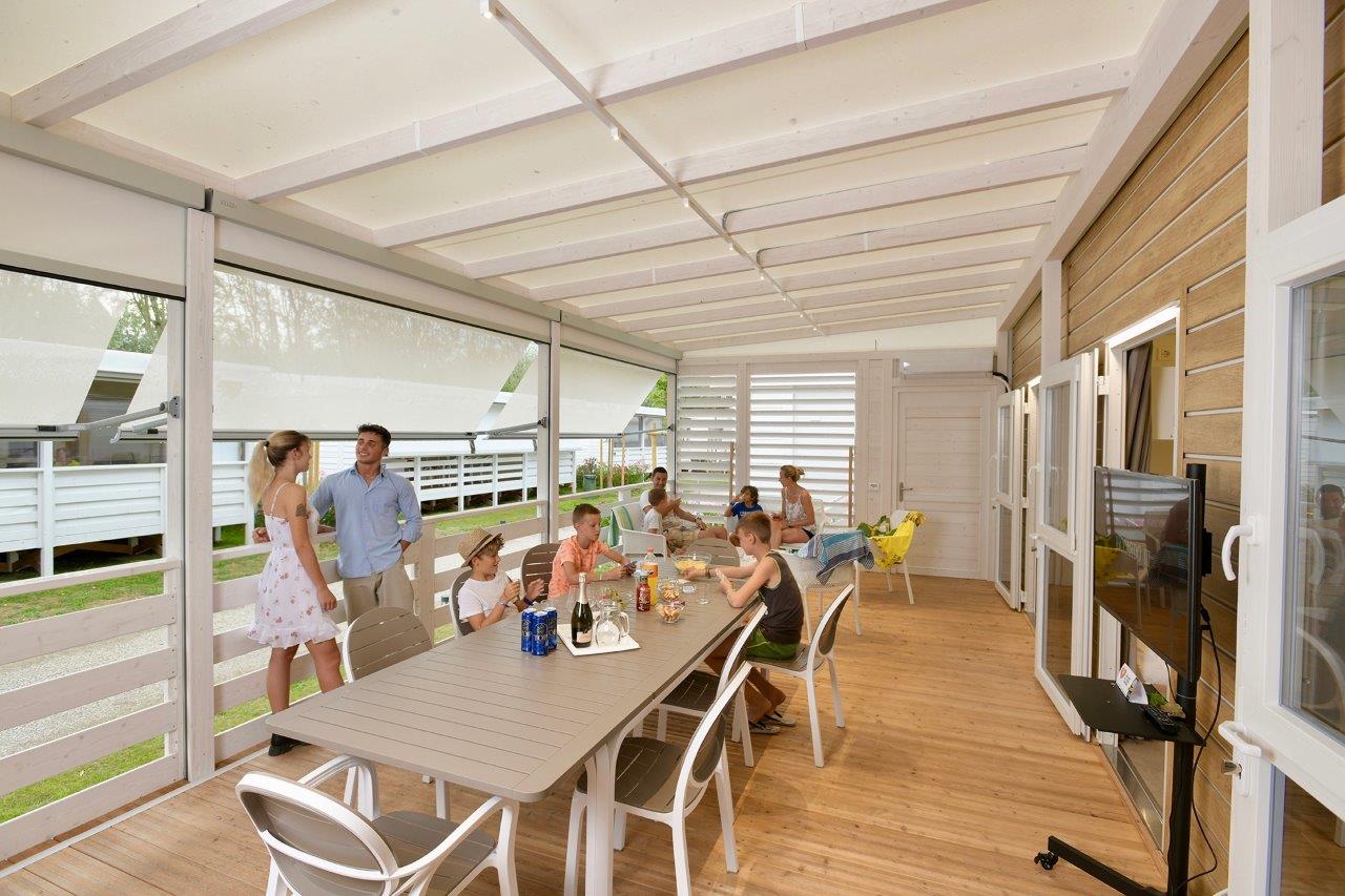 A completamento dell'esperienza di vita in famiglia, spicca l'elegante terrazza, dotata di tende ombreggianti e protetta sui 2 lati da una parete di pannelli di legno orientabili, che è diventata il segno distintivo delle più recenti mobil home Isaholidays. Il luogo ideale dove rilassarsi, cenare all'aperto e godersi la privacy della propria famiglia.