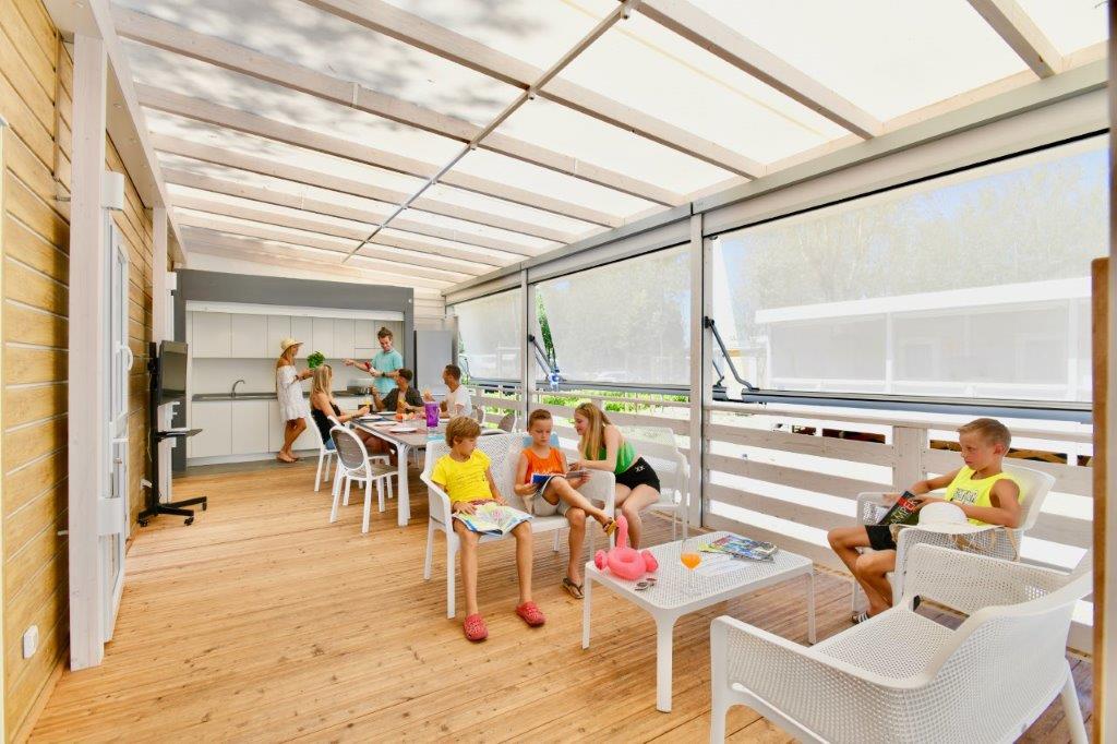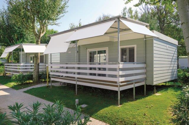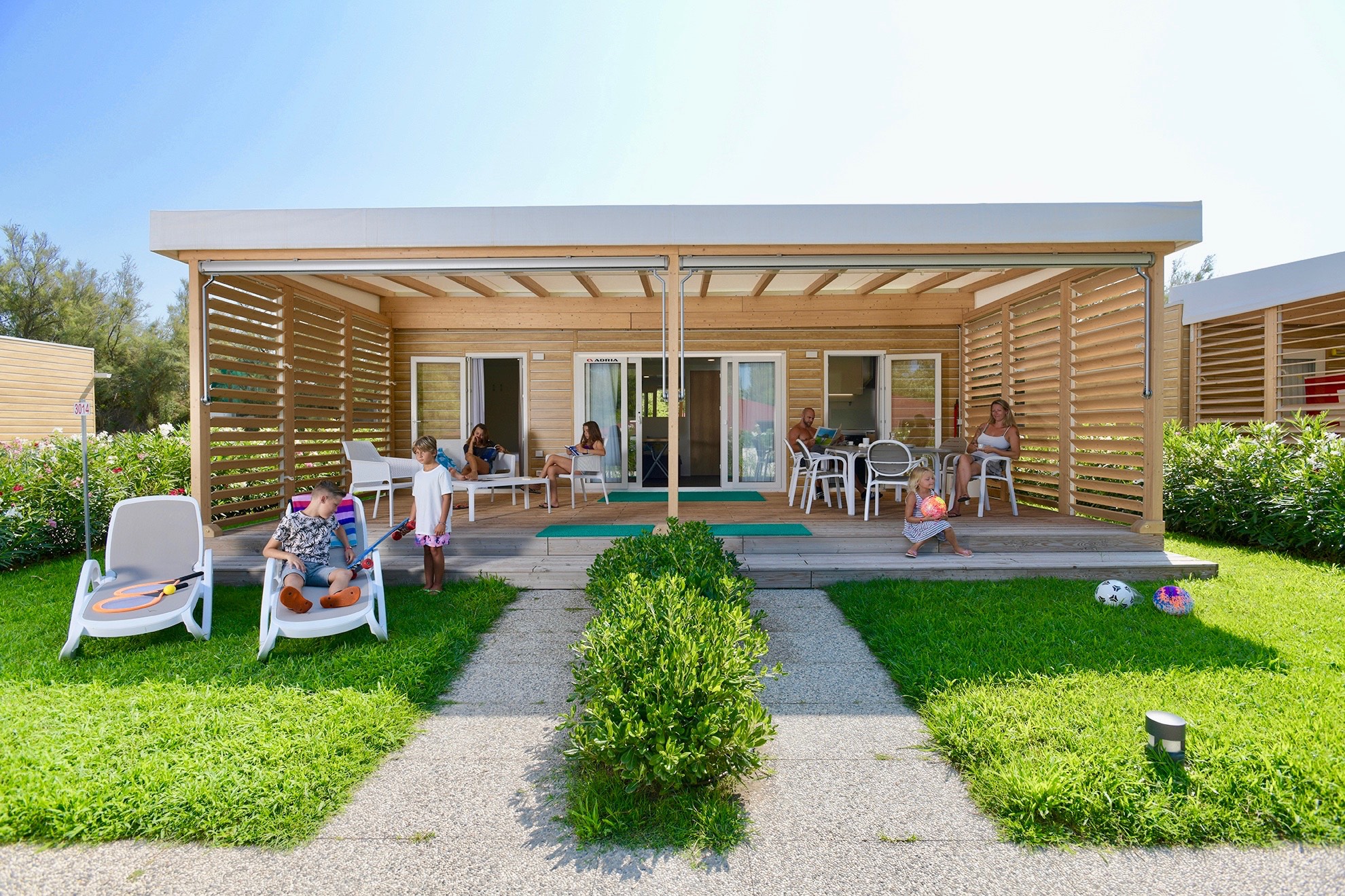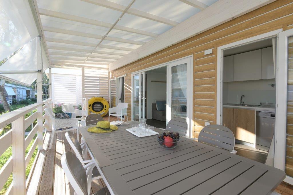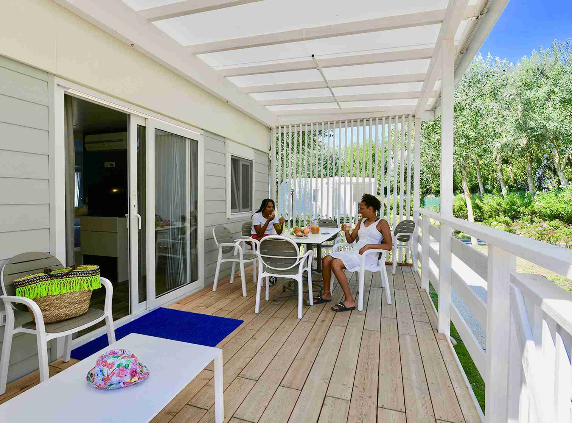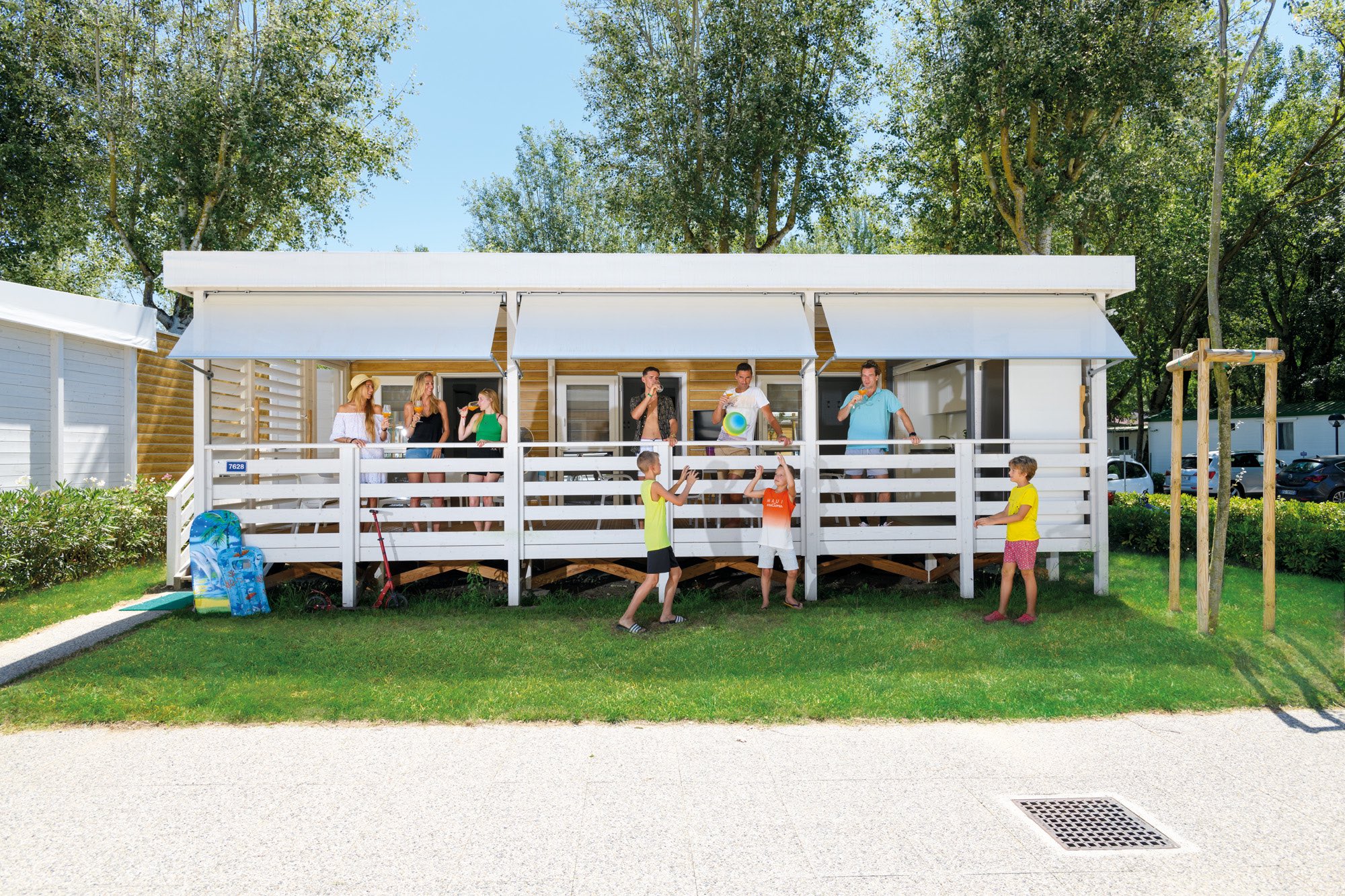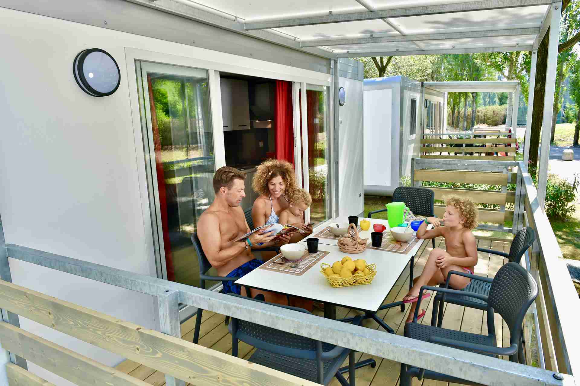 A completamento dell'esperienza di vita in famiglia, spicca l'elegante terrazza, dotata di tende ombreggianti e protetta sui 2 lati da una parete di pannelli di legno orientabili, che è diventata il segno distintivo delle più recenti mobil home Isaholidays. Il luogo ideale dove rilassarsi, cenare all'aperto e godersi la privacy della propria famiglia.