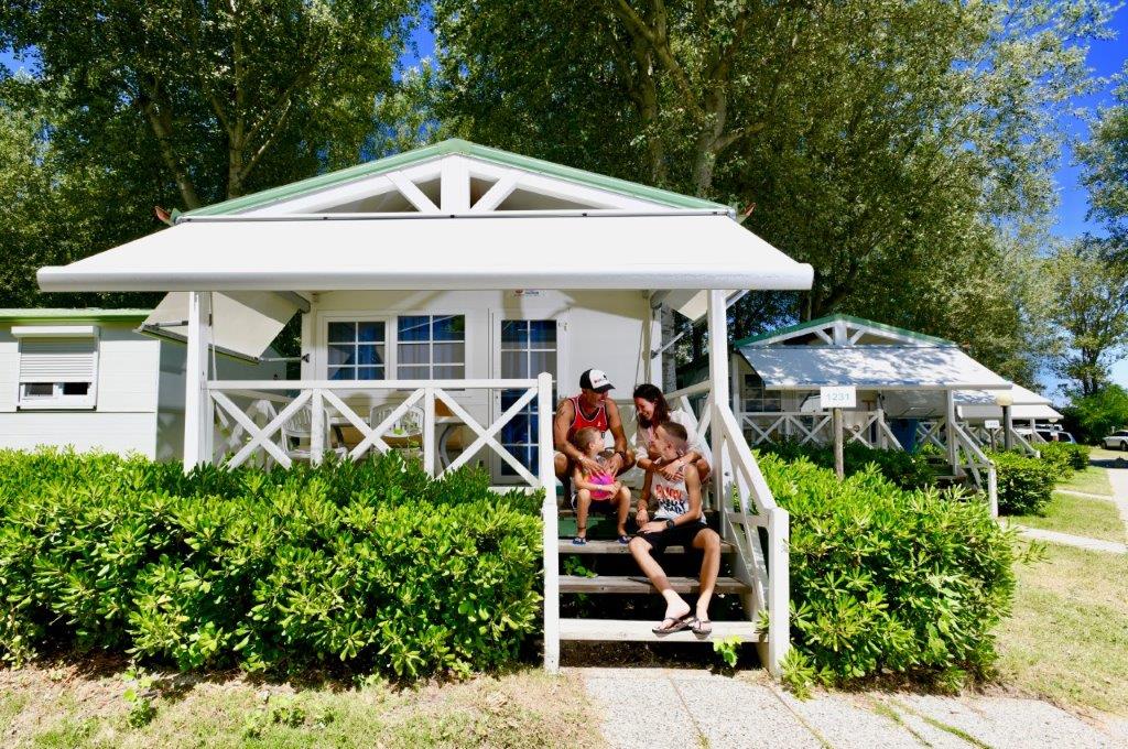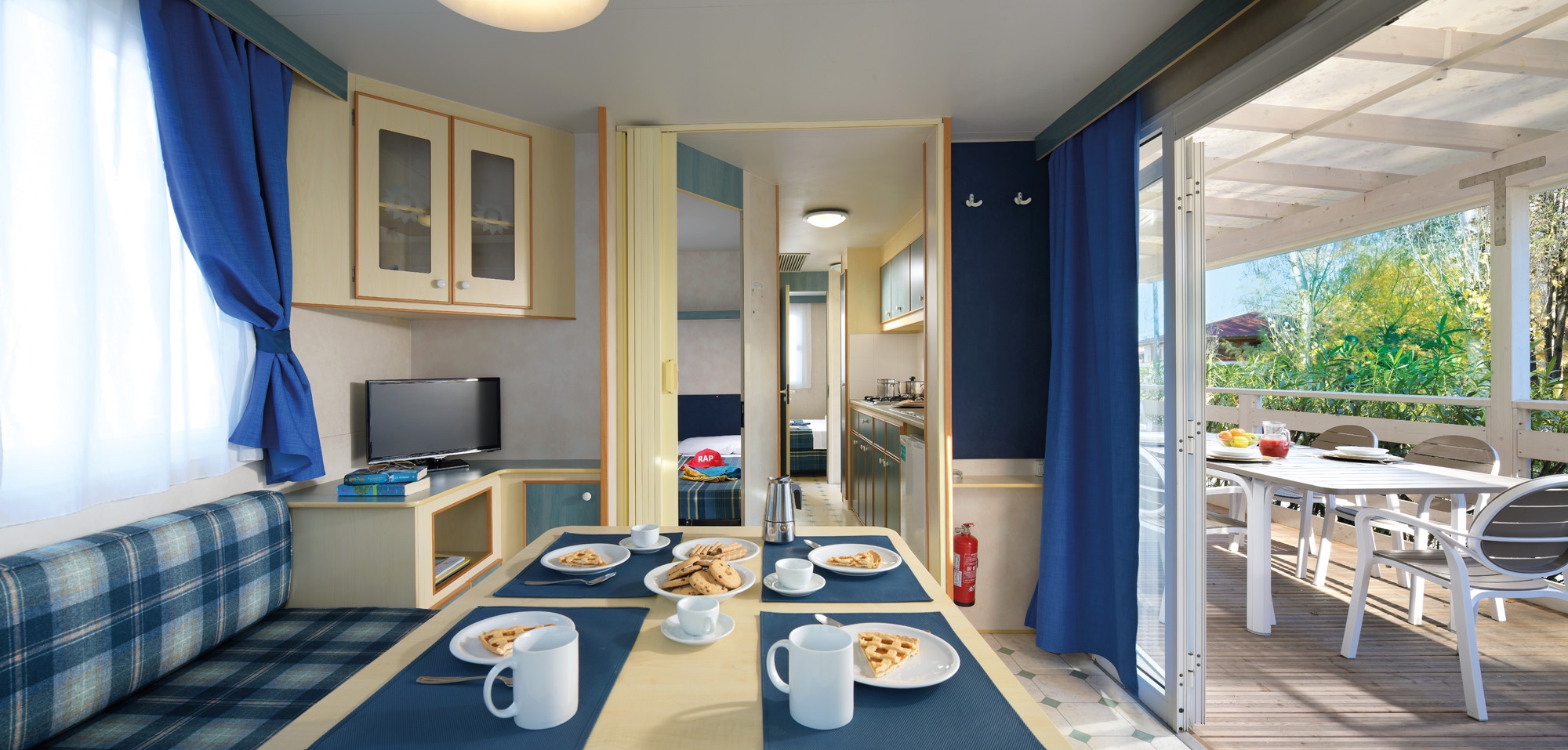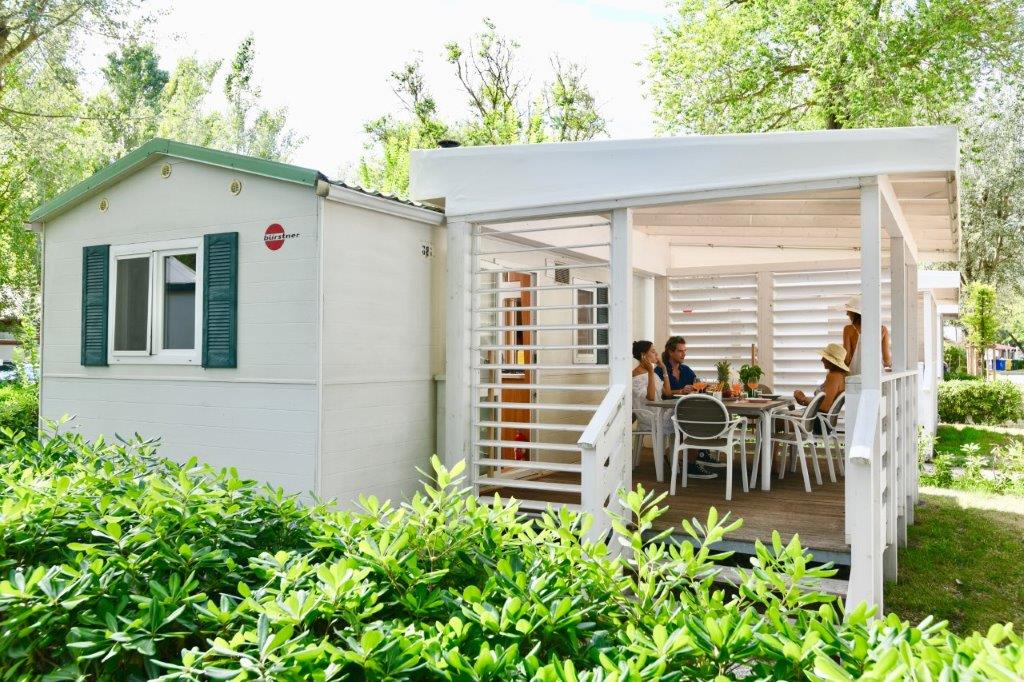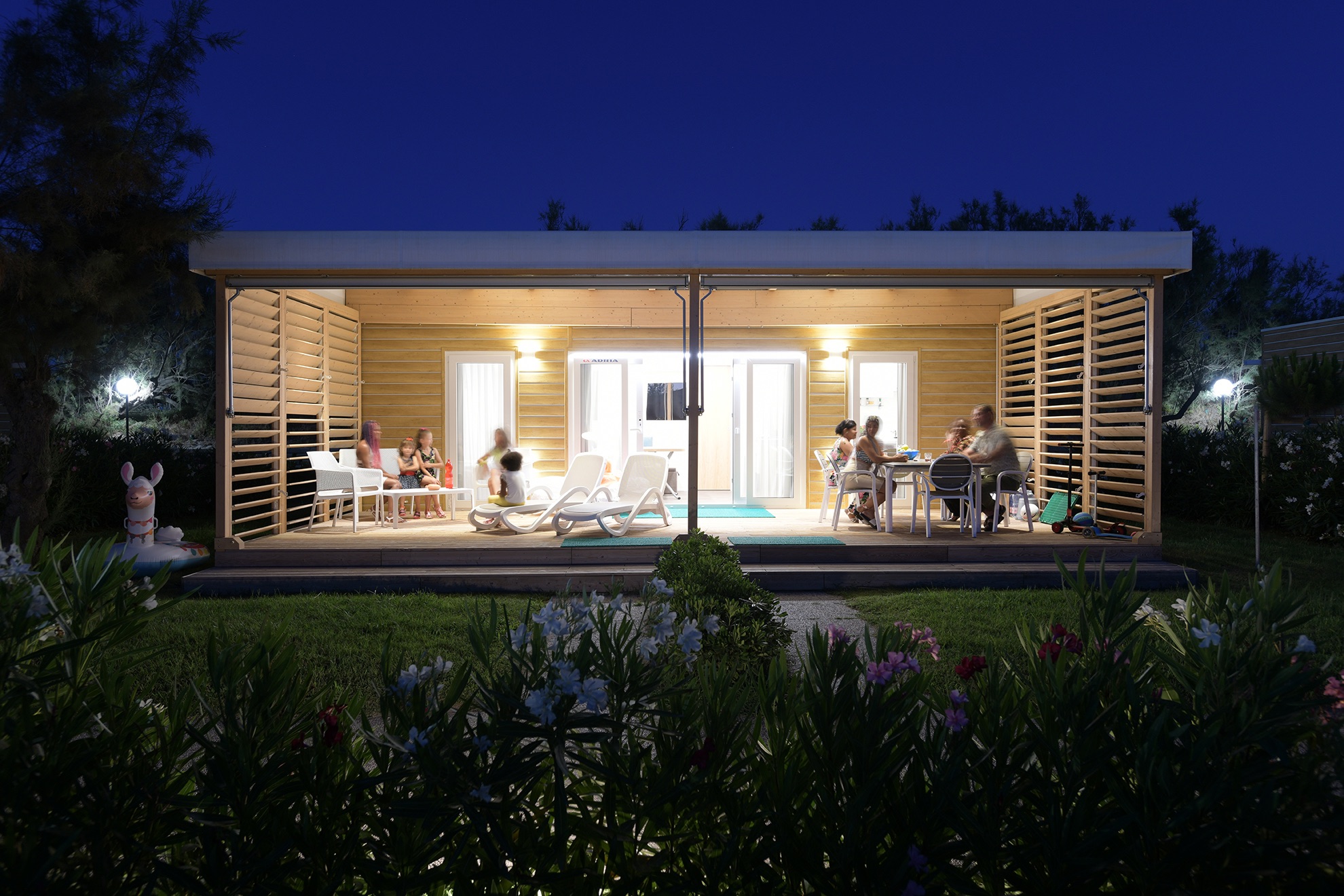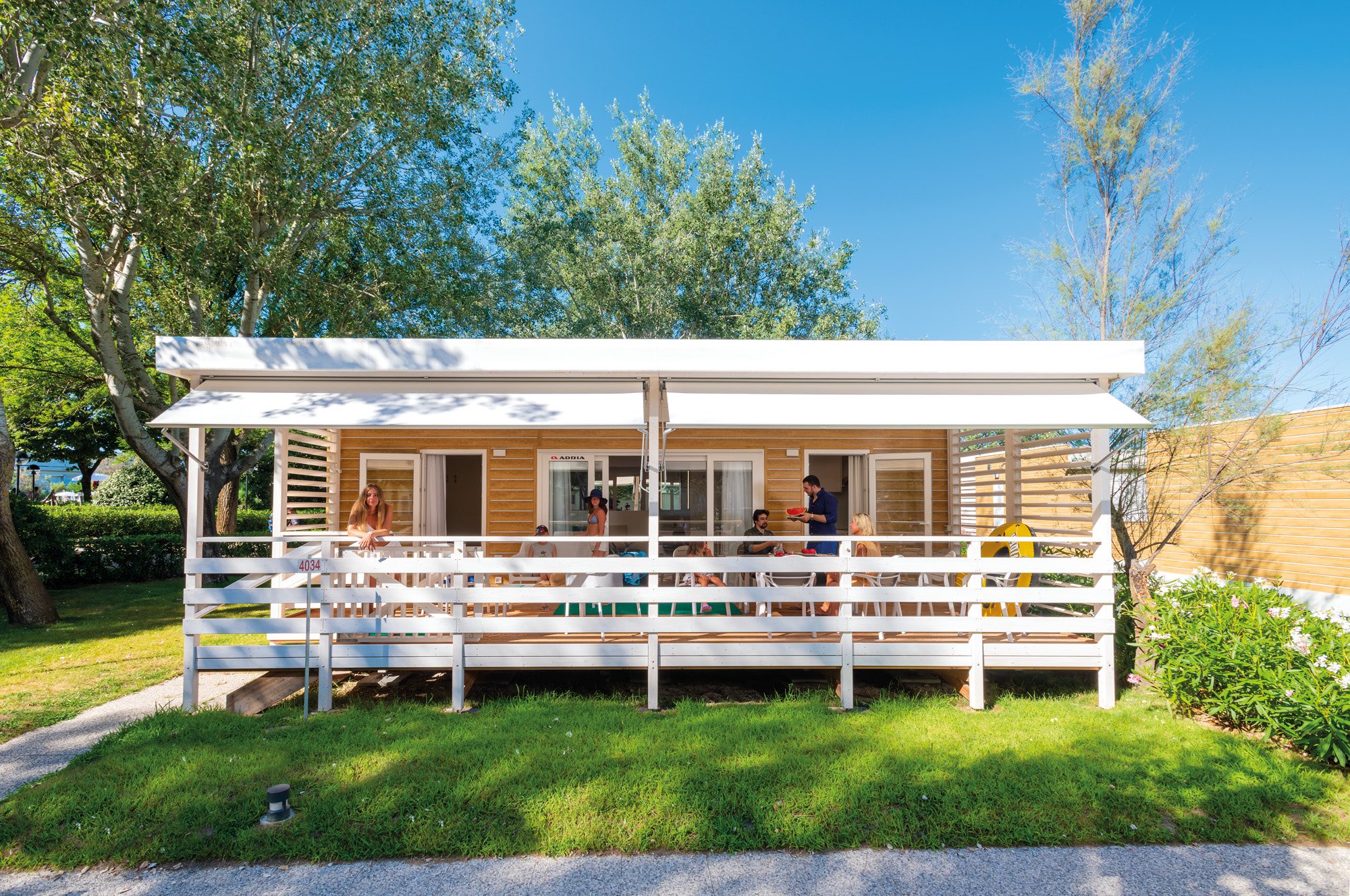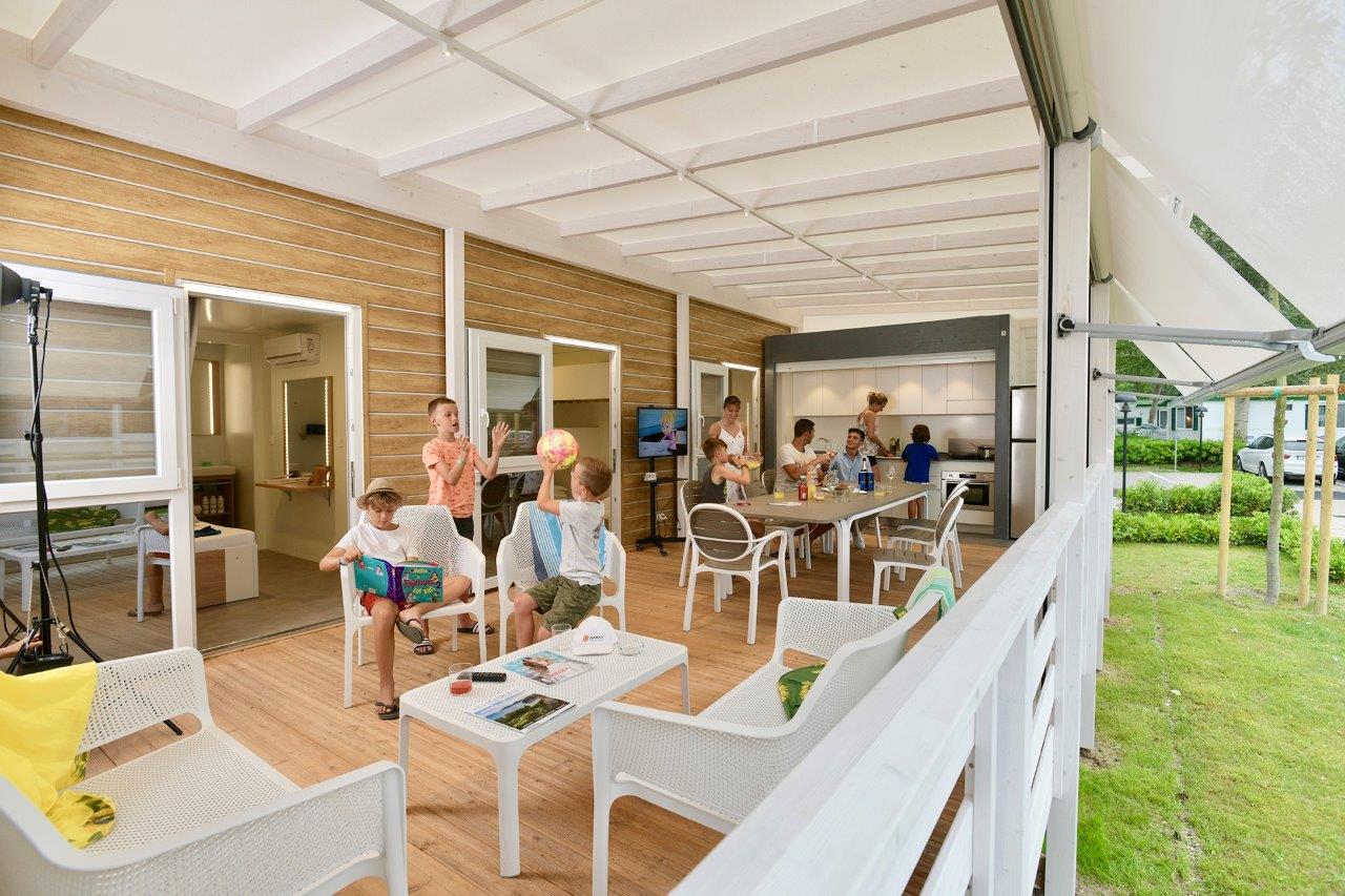 A completamento dell'esperienza di vita in famiglia, spicca l'elegante terrazza, dotata di tende ombreggianti e protetta sui 2 lati da una parete di pannelli di legno orientabili, che è diventata il segno distintivo delle più recenti mobil home Isaholidays. Il luogo ideale dove rilassarsi, cenare all'aperto e godersi la privacy della propria famiglia.