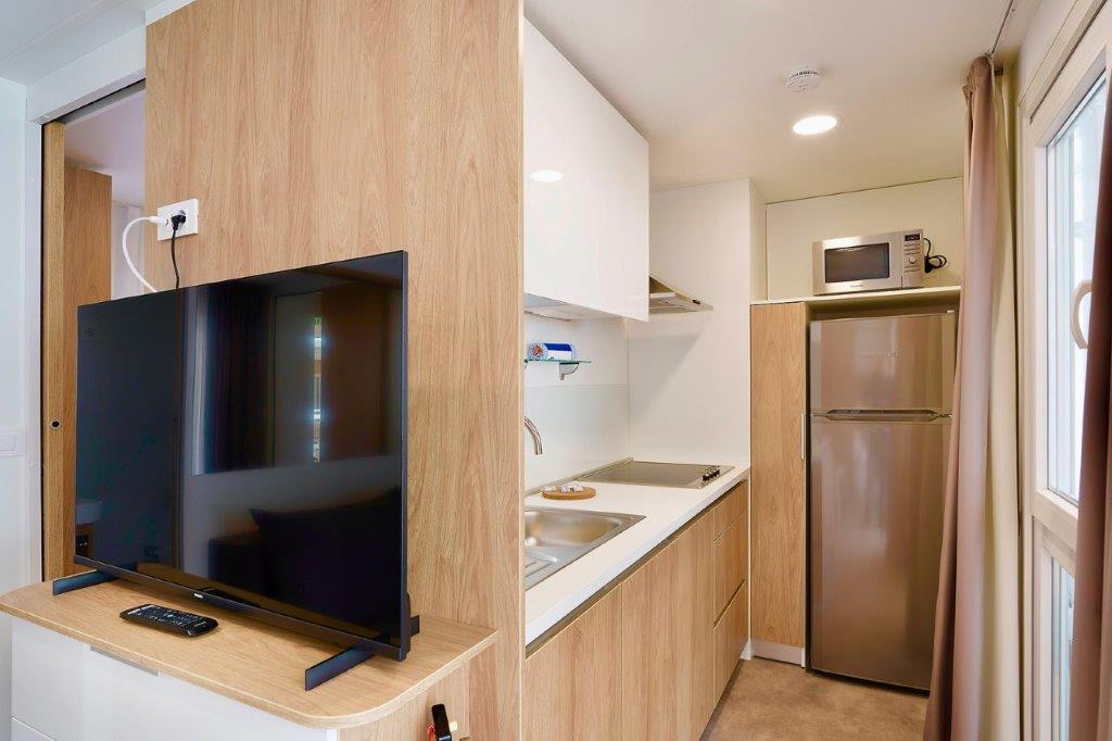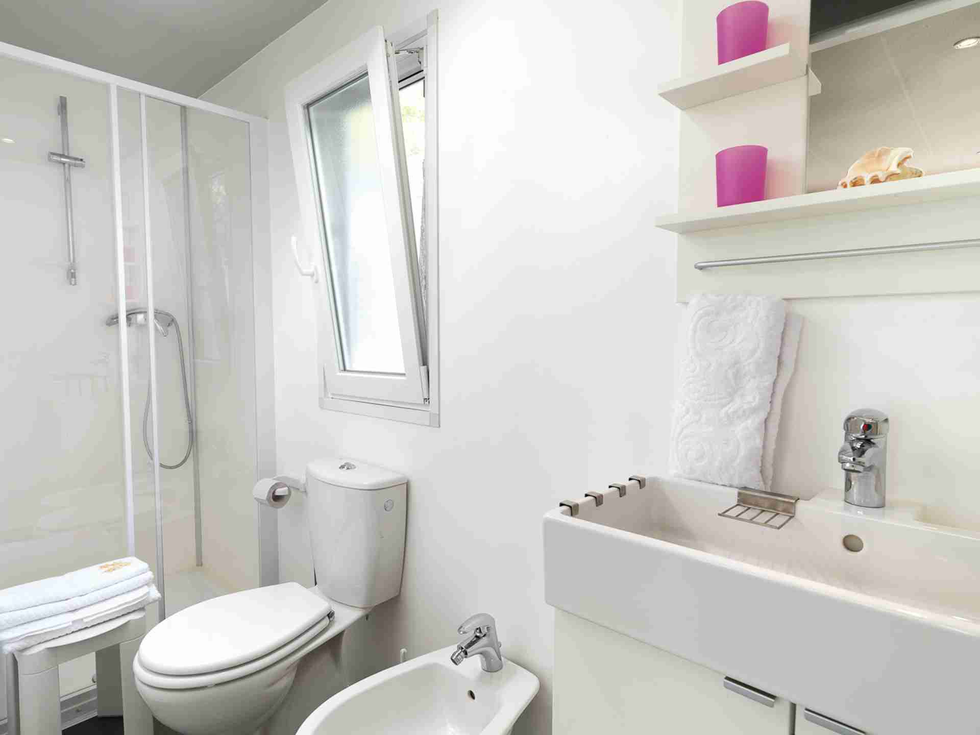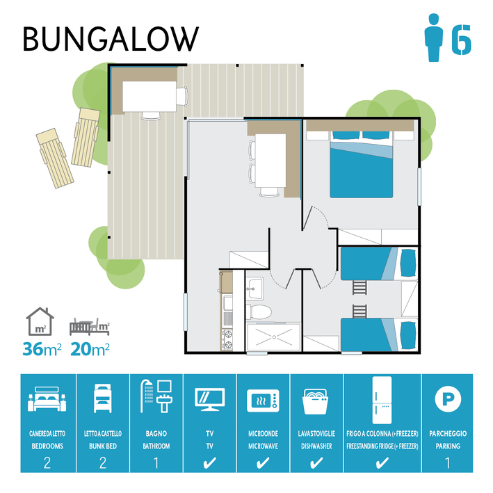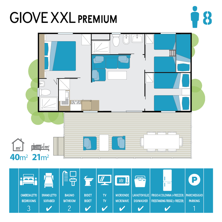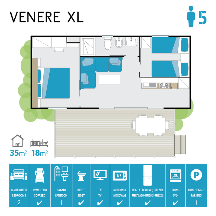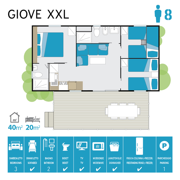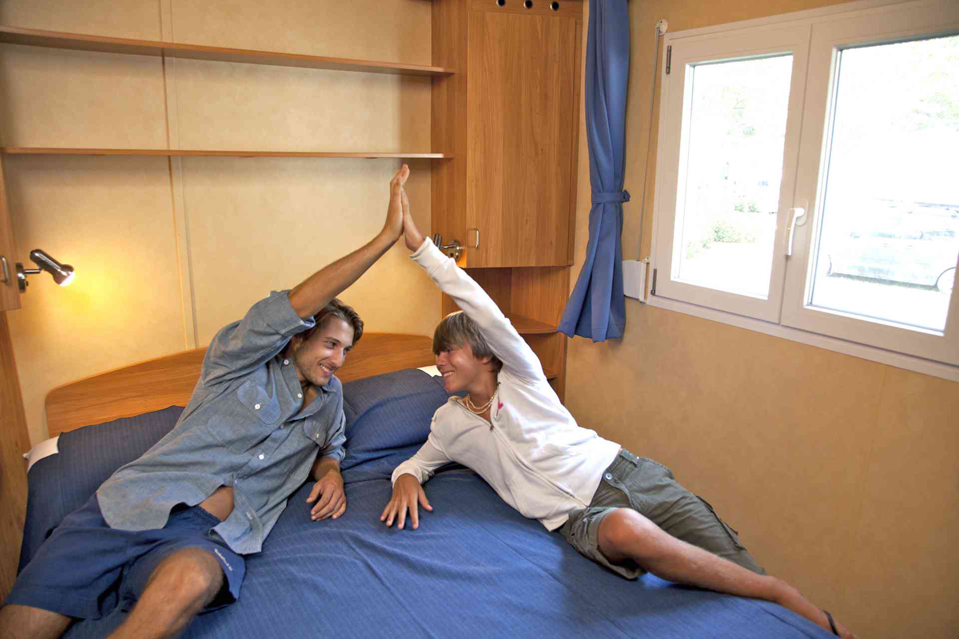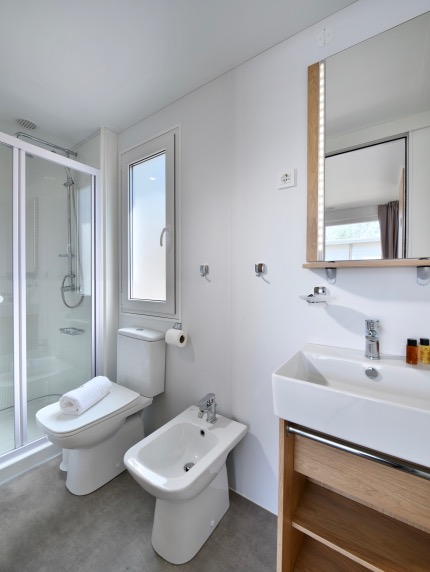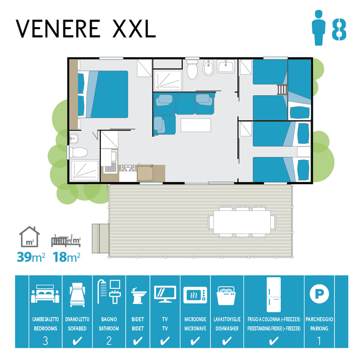 A completamento dell'esperienza di vita in famiglia, spicca l'elegante terrazza, dotata di tende ombreggianti e protetta sui 2 lati da una parete di pannelli di legno orientabili, che è diventata il segno distintivo delle più recenti mobil home Isaholidays. Il luogo ideale dove rilassarsi, cenare all'aperto e godersi la privacy della propria famiglia.