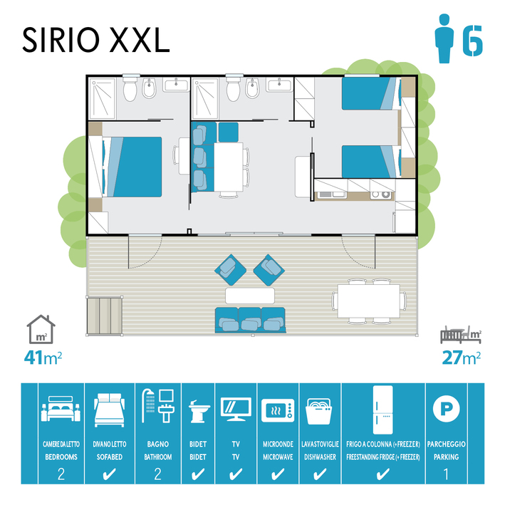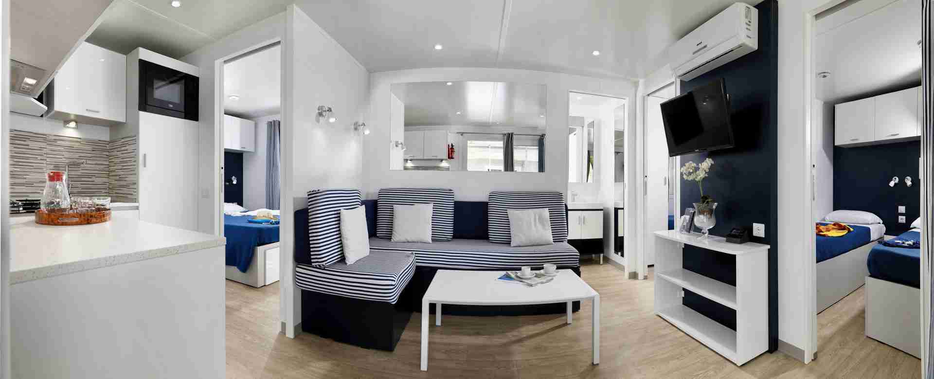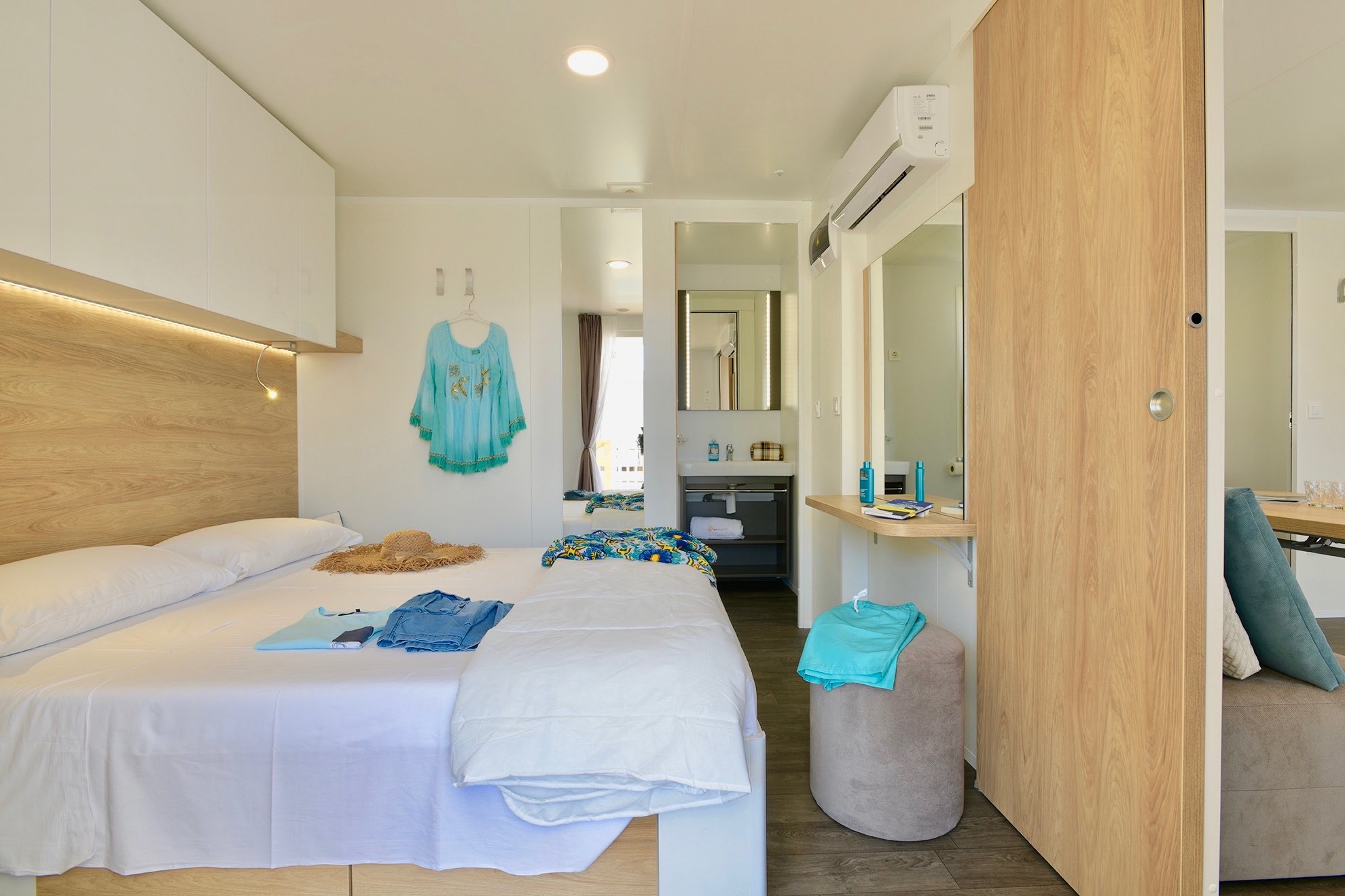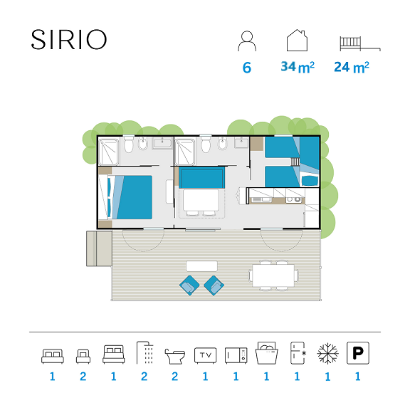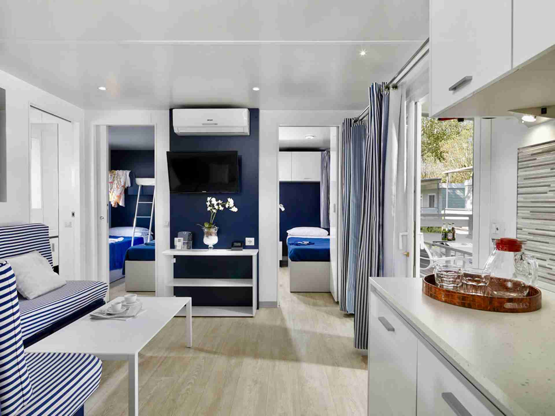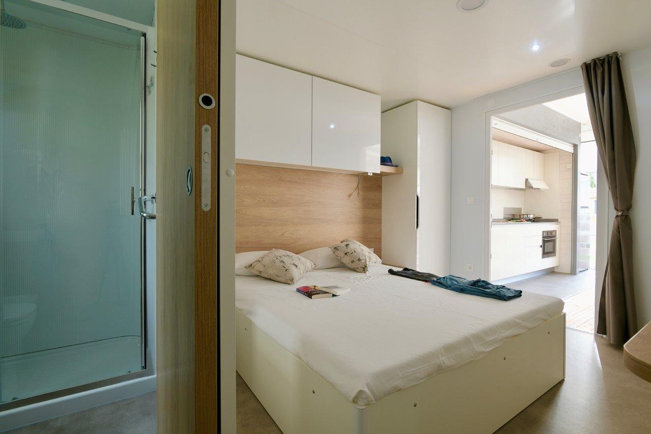 Sirio POOL è una lussuosa mobile home caratterizza da spazi generosi e arredi raffinati, dove trovano posto 1 camera matrimoniale con bagno en suite, una cameretta con secondo bagno, cucina e zona pranzo.