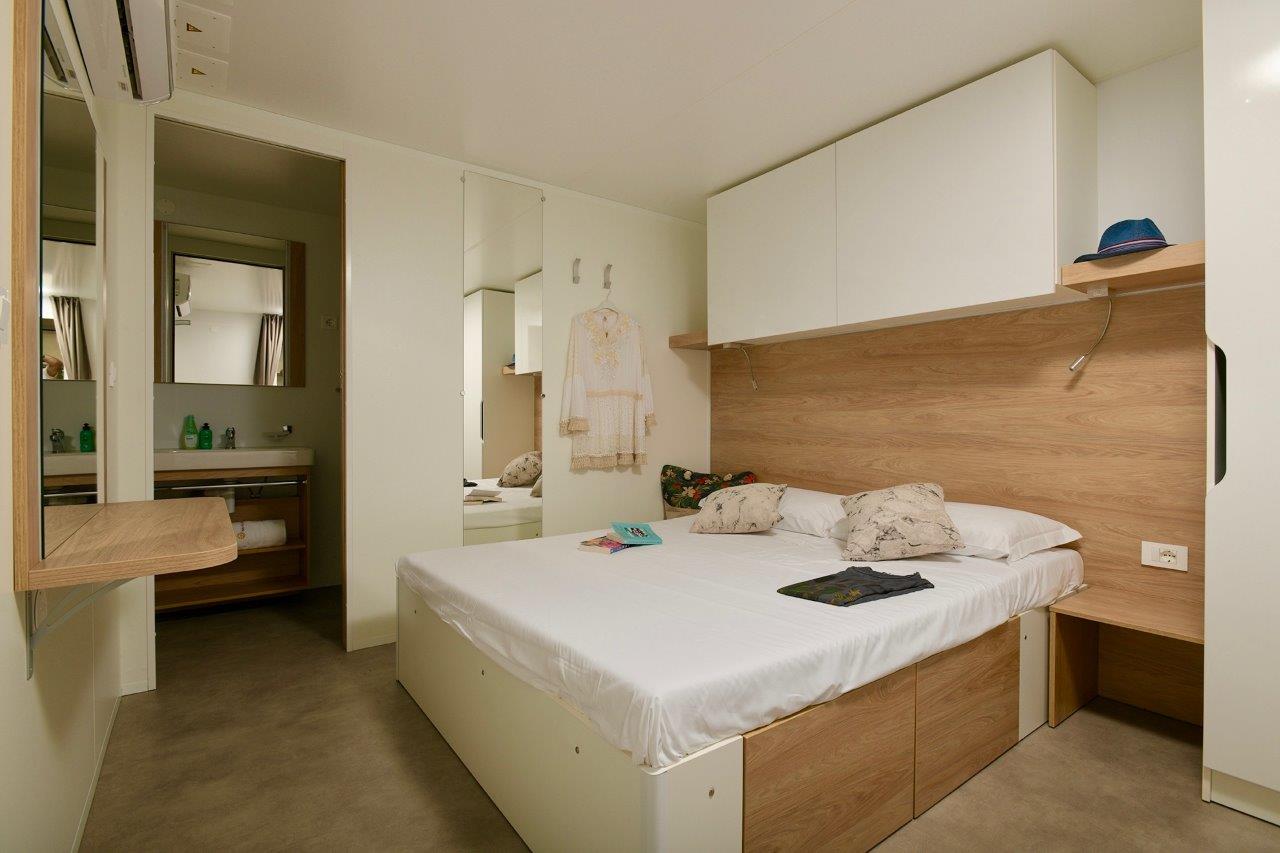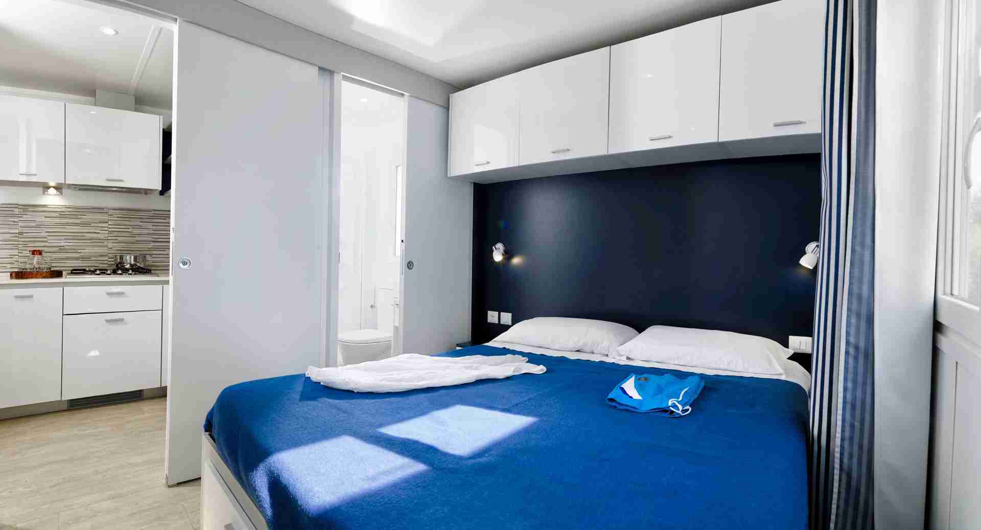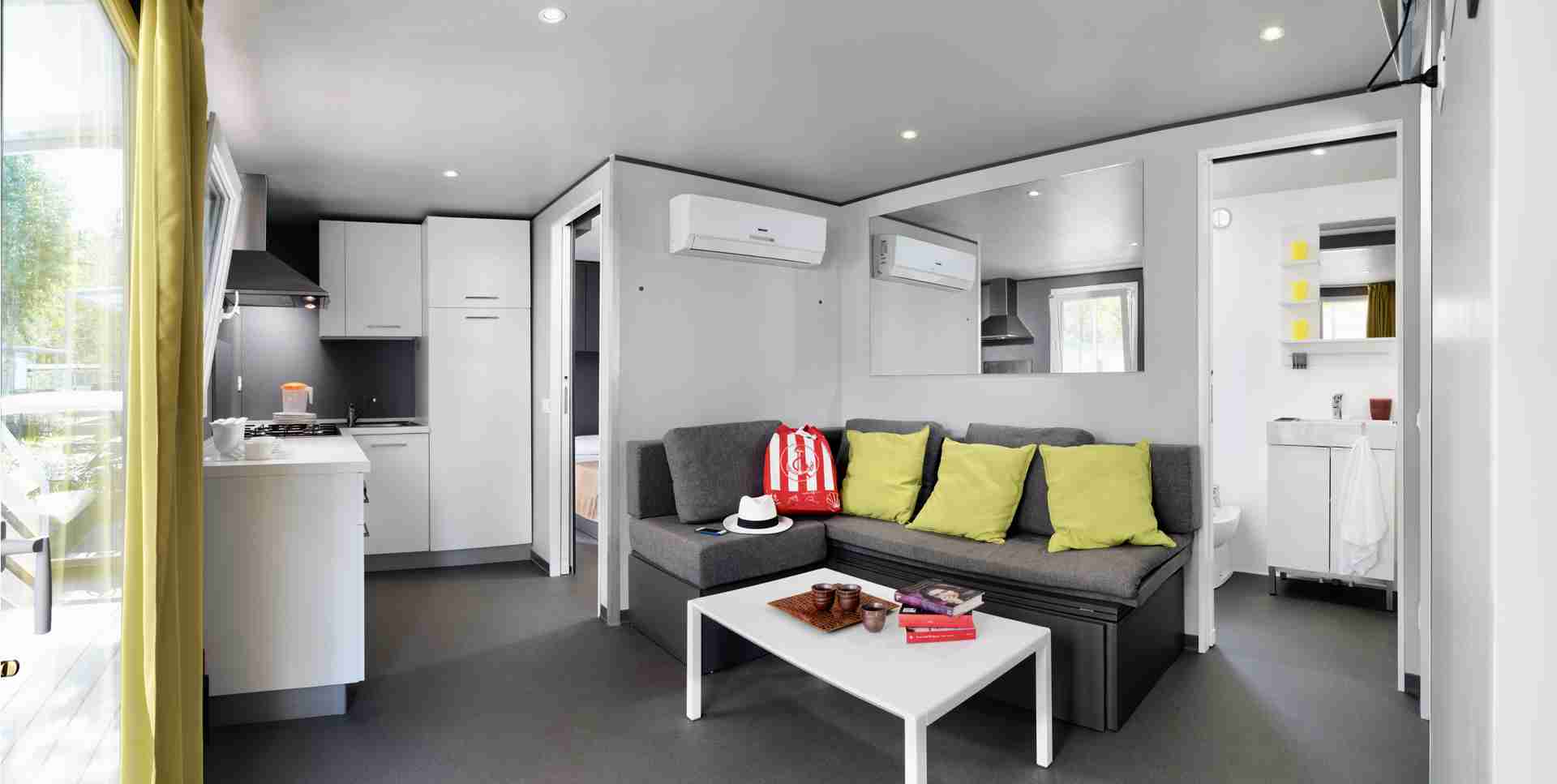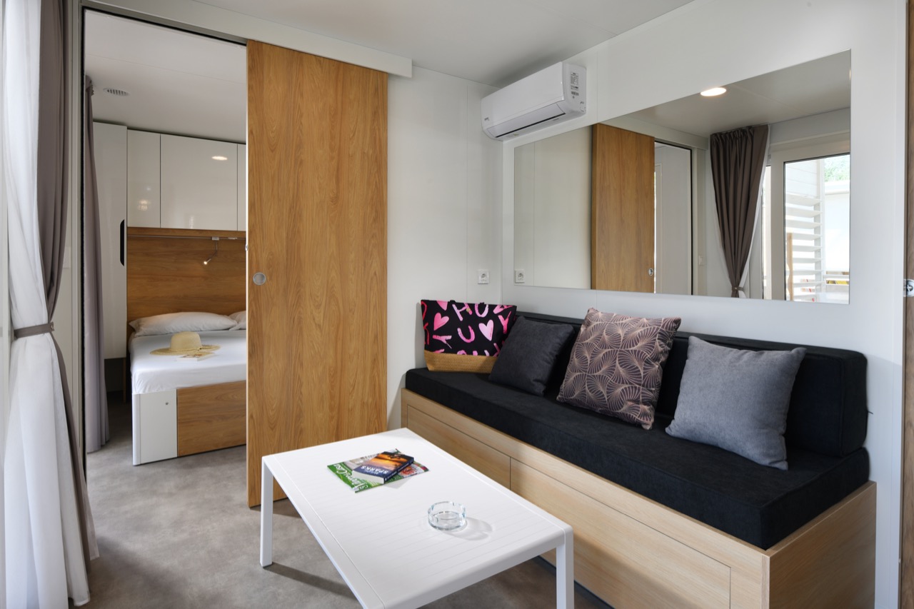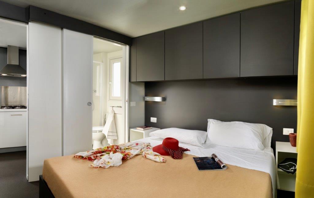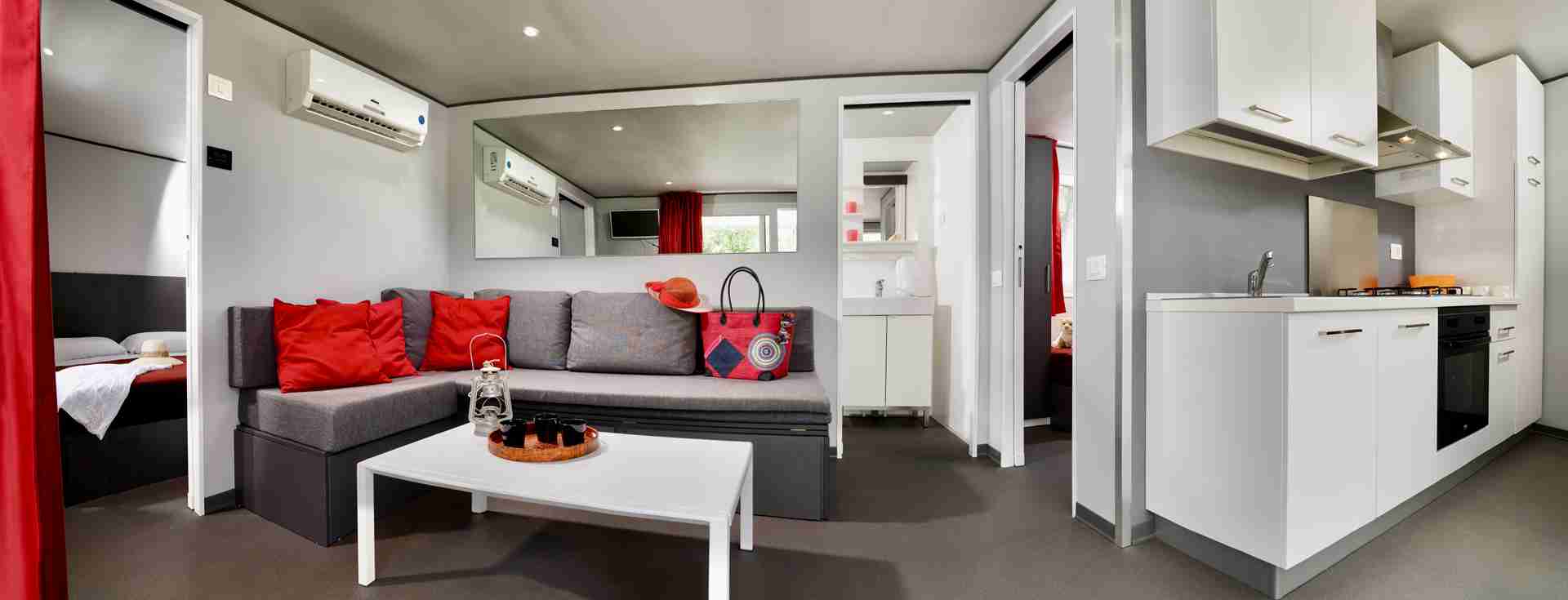 Sirio POOL è una lussuosa mobile home caratterizza da spazi generosi e arredi raffinati, dove trovano posto 1 camera matrimoniale con bagno en suite, una cameretta con secondo bagno, cucina e zona pranzo.