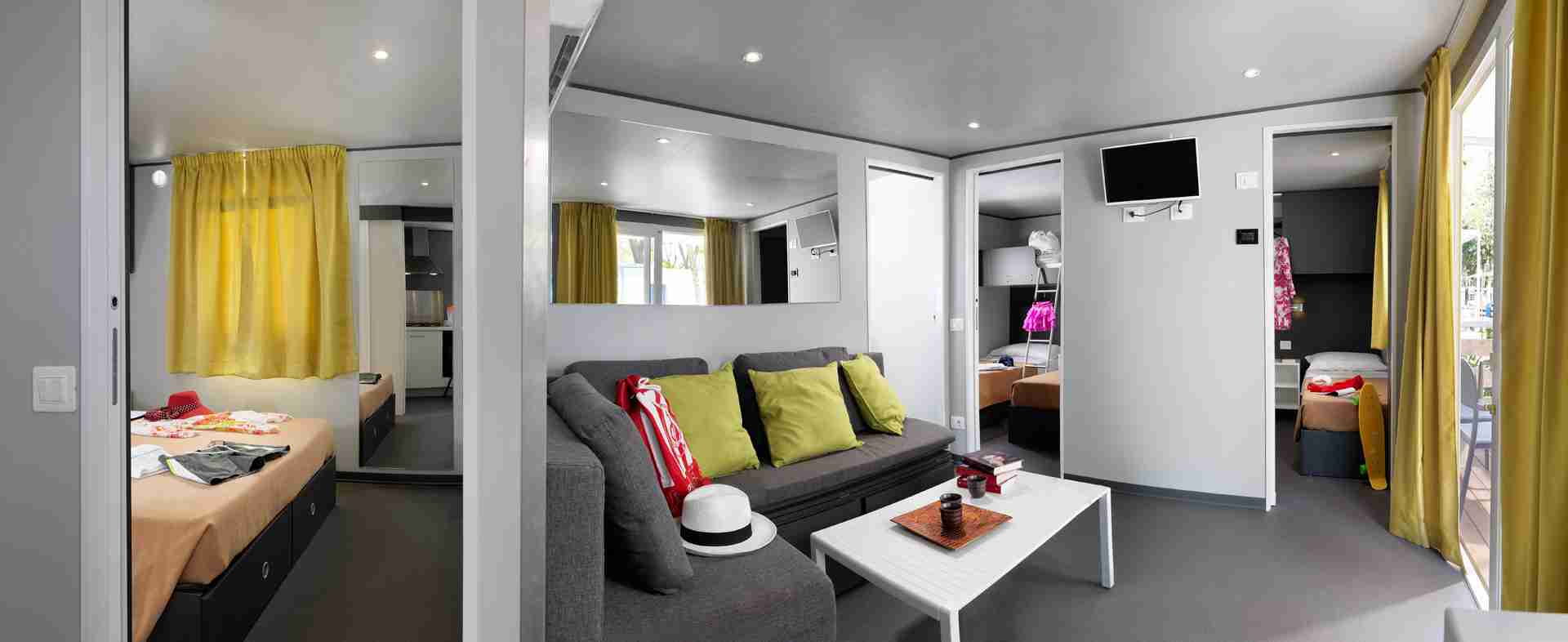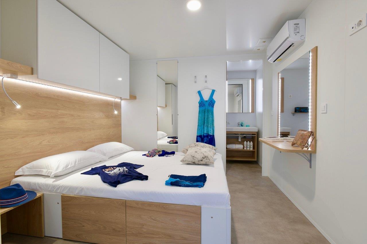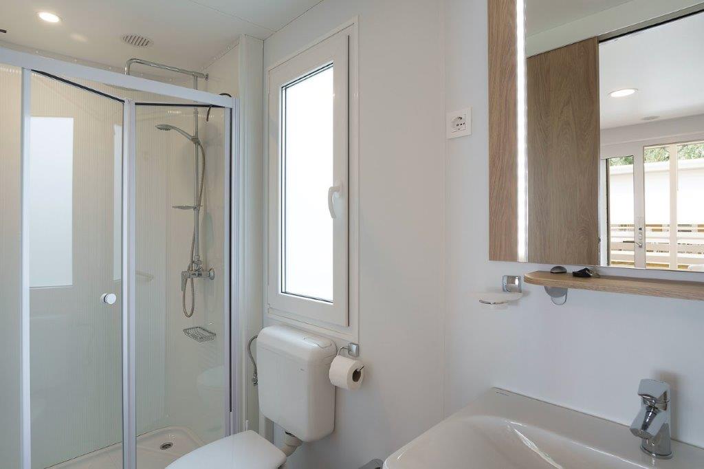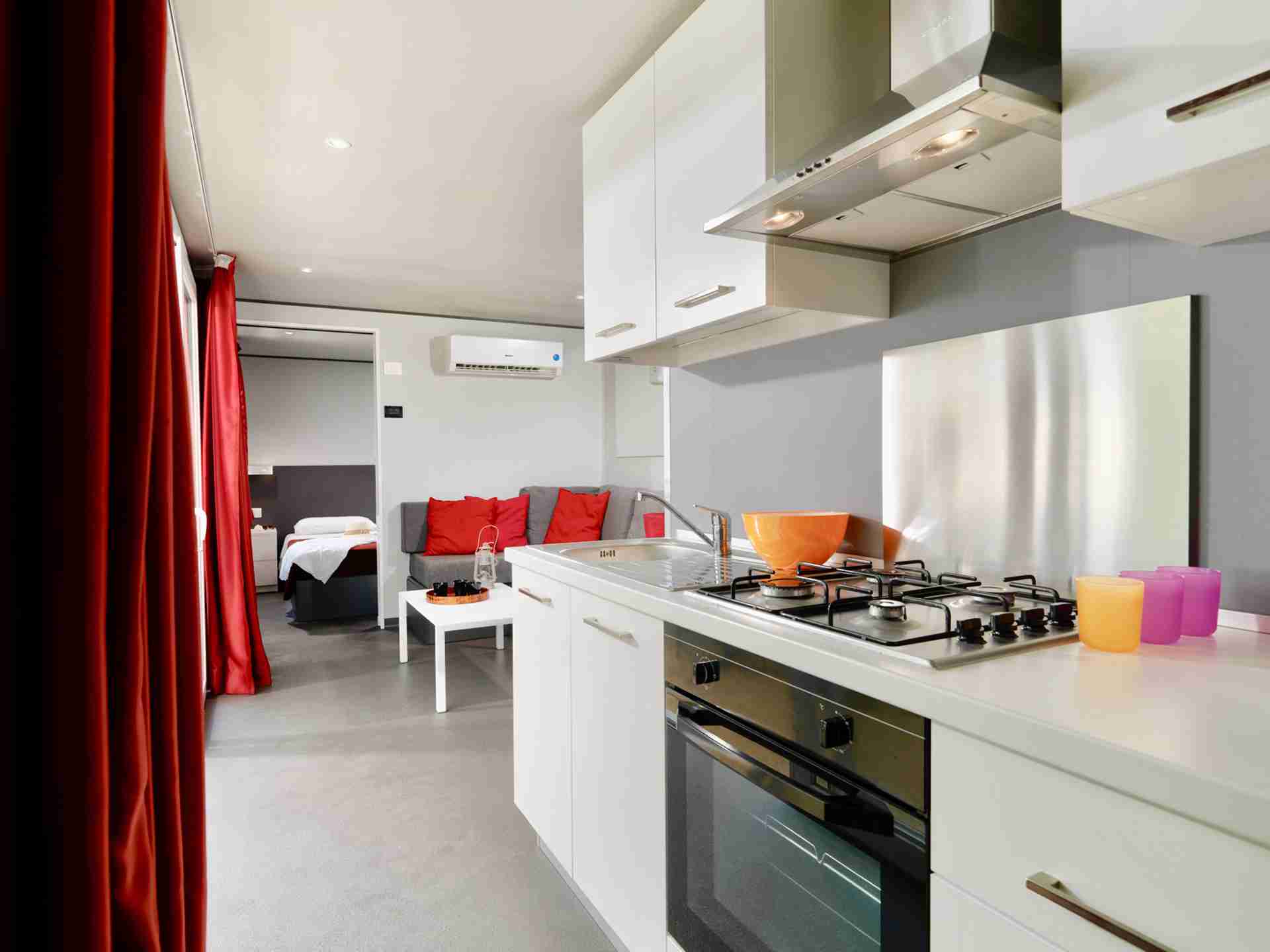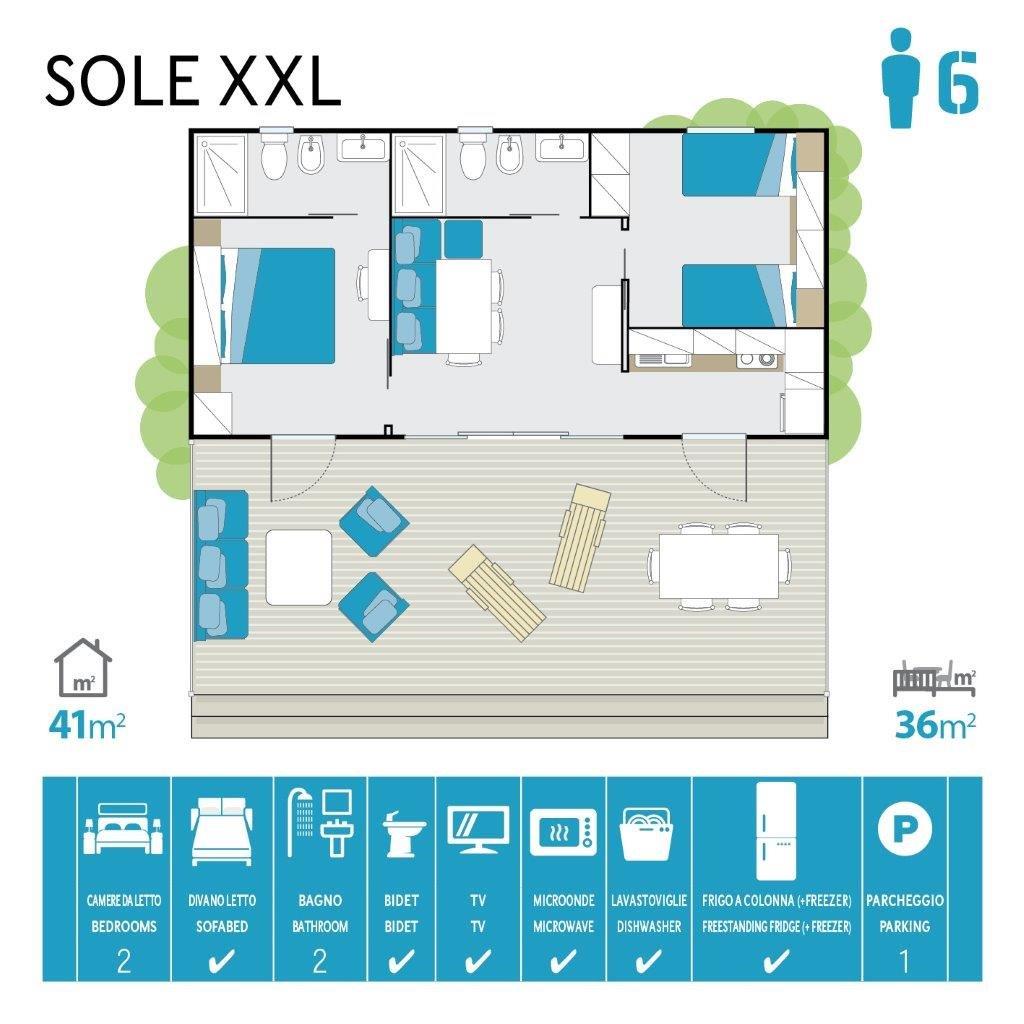 Sirio POOL è una lussuosa mobile home caratterizza da spazi generosi e arredi raffinati, dove trovano posto 1 camera matrimoniale con bagno en suite, una cameretta con secondo bagno, cucina e zona pranzo.
