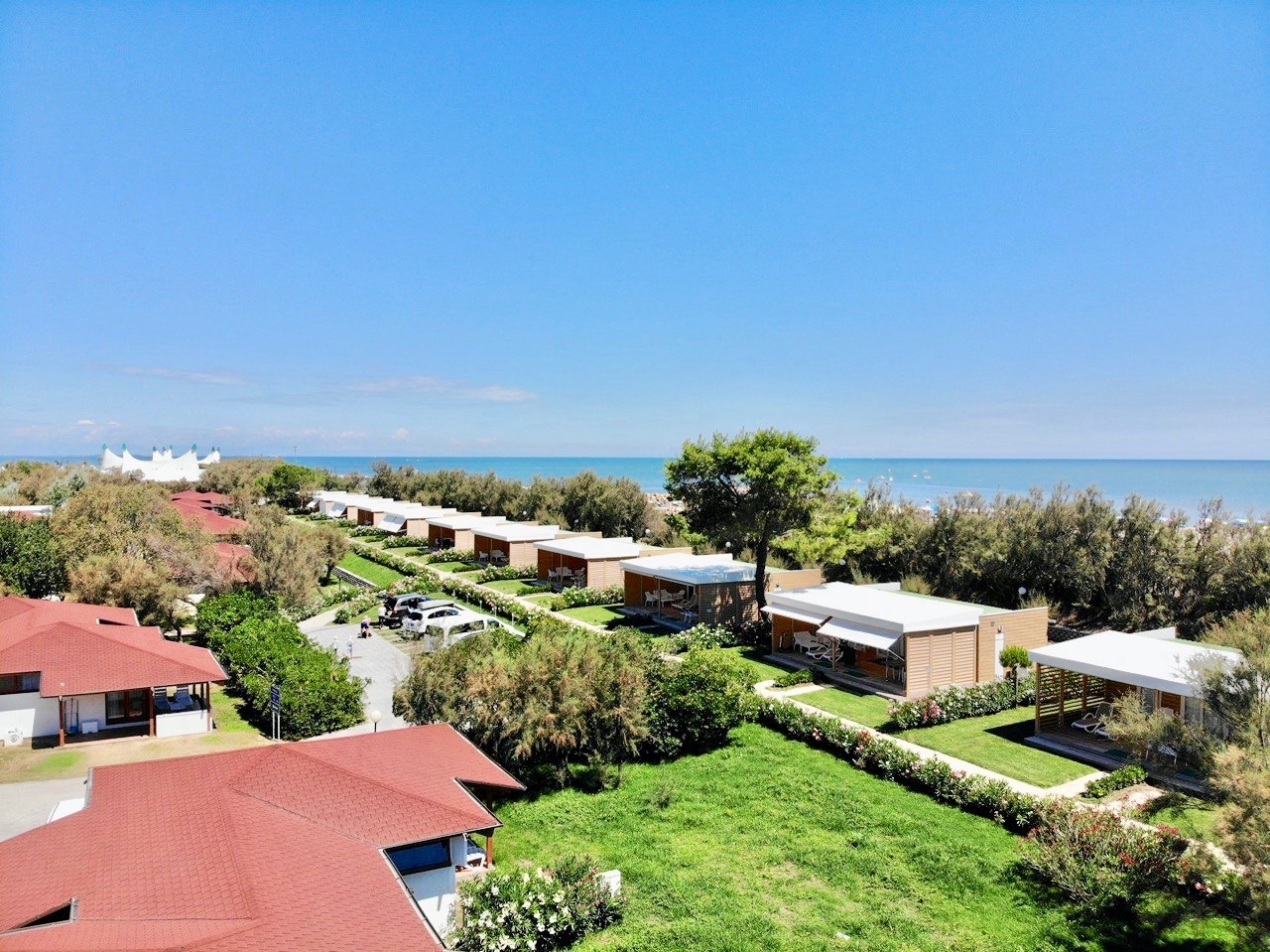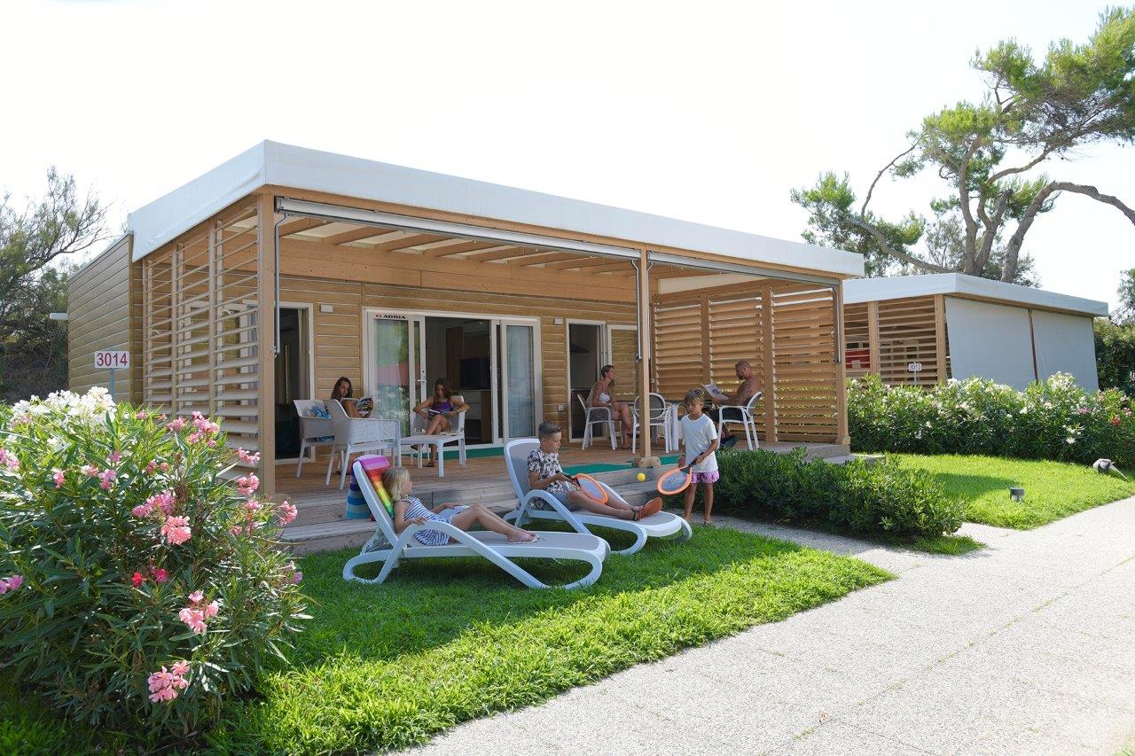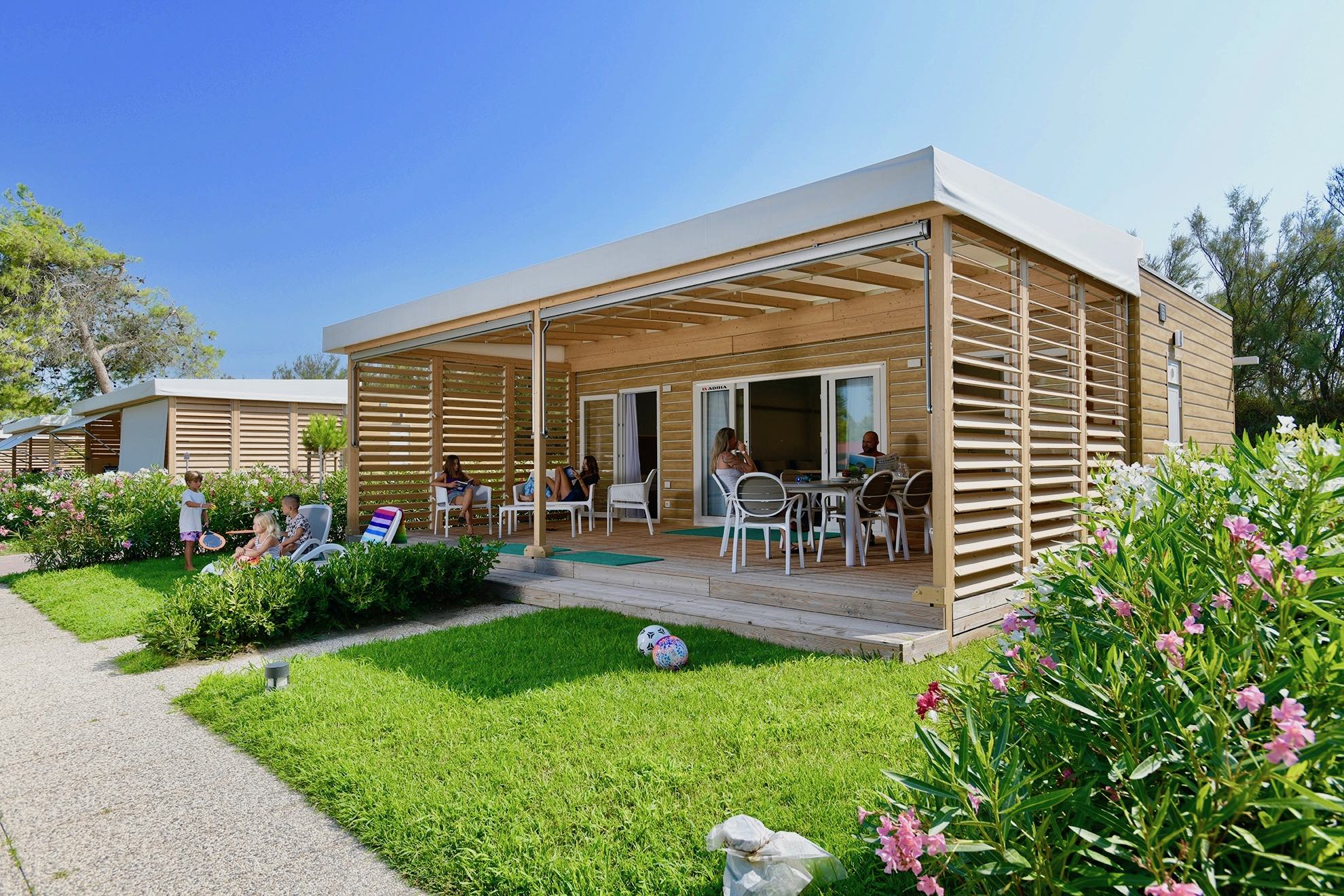 Splendida mobil-home di nuovissima concezione, situata nella posizione più esclusiva del villaggio, in prima linea vicino al mare, con ampio prato verde antistante.