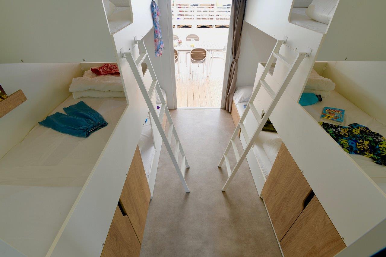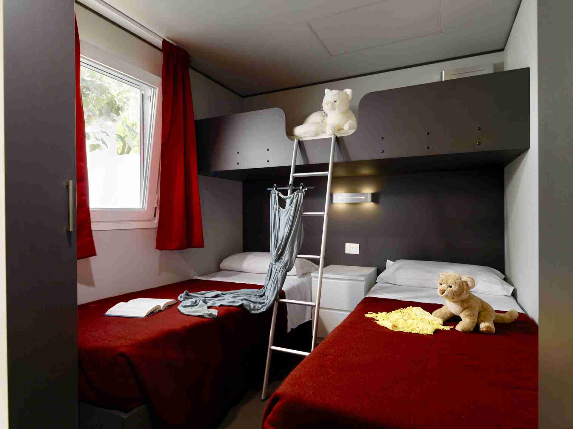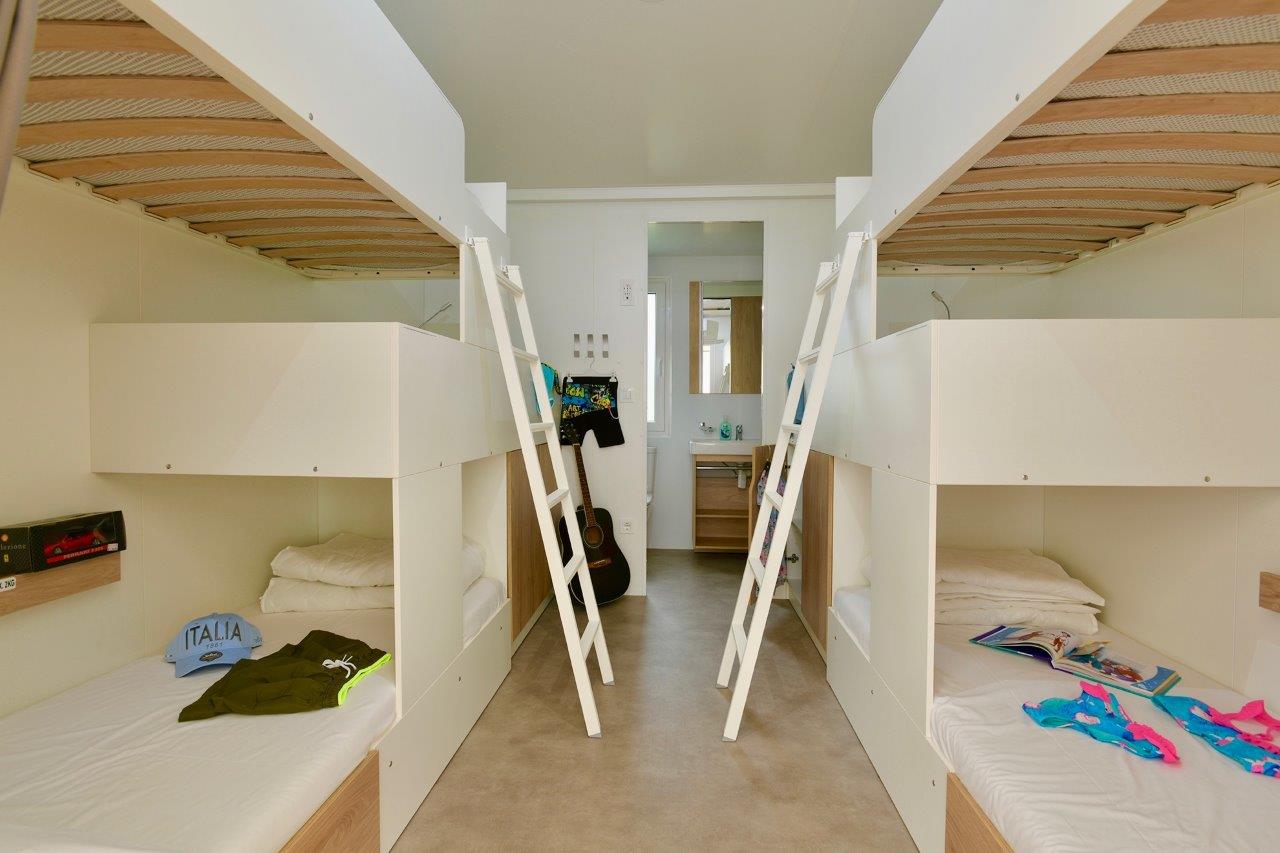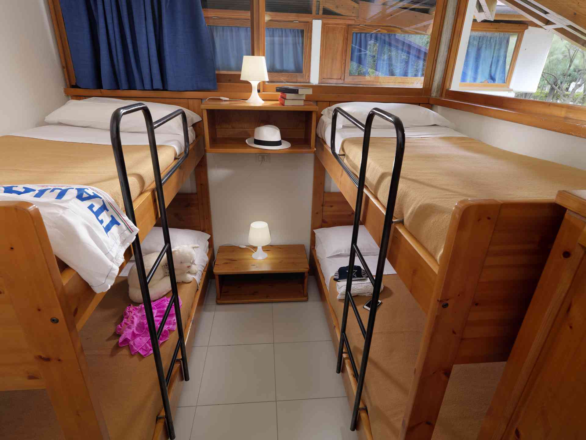 Nella zona notte trovano posto 3 camere, di cui 2 grandi camere matrimoniali e 1 camera “bambini” centrale attrezzata con 6 letti, per un totale di 10 posti letto.
