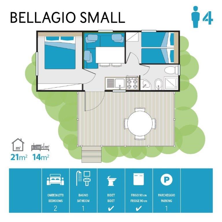 Bellagio Small è un’abitazione di dimensioni contenute ma molto curata negli interni, dove trovano posto 2 camere da letto per ospitare comodamente fino a 4 persone, una cucina con soggiorno, e un confortevole bagno dotato di bidet.