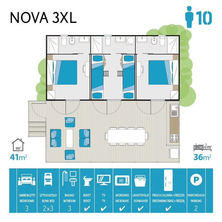 Vi presentiamo Nova 3XL, splendida casa mobile di nuova concezione caratterizzata da ampi spazi, arredi eleganti e molta tecnologia, perfetta per le vacanze di famiglie numerose o di 2 famiglie insieme.