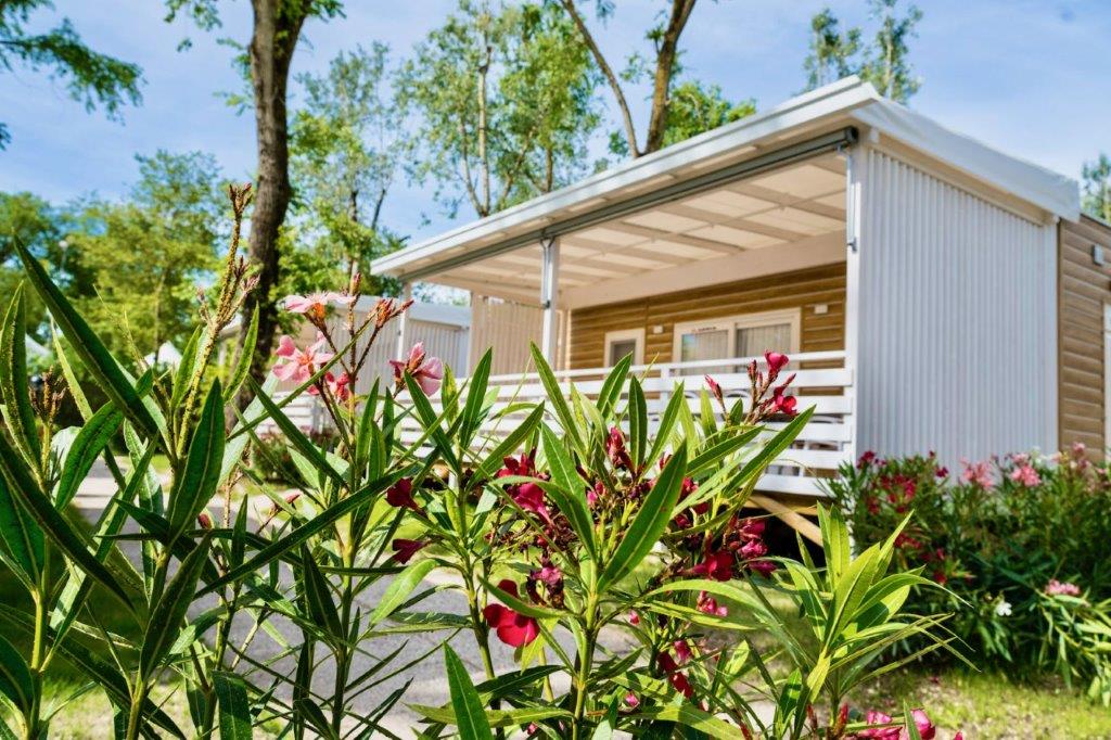 Elegante casa mobile posizionata in posizione privilegiata, in prossimità del parco acquatico, tra viali pedonali alberati e fioriti.