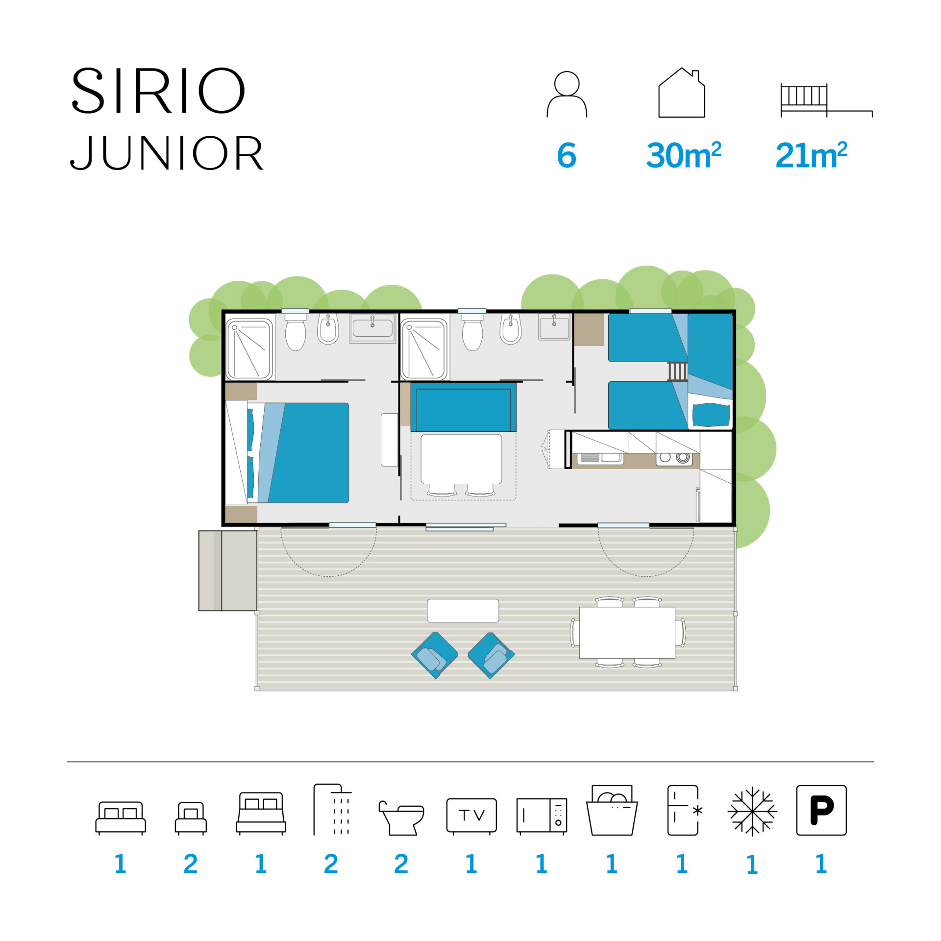Le Sirio Junior sono disposte su vialetti pedonali e si trovano in una posizione centrale del villaggio, comoda a tutti i servizi, caratterizzata da una fitta vegetazione arborea.