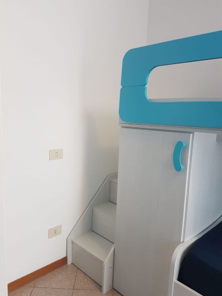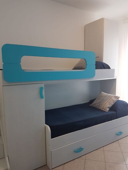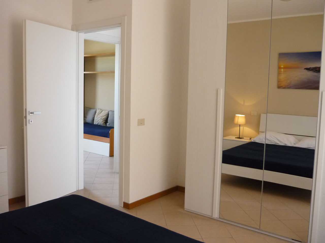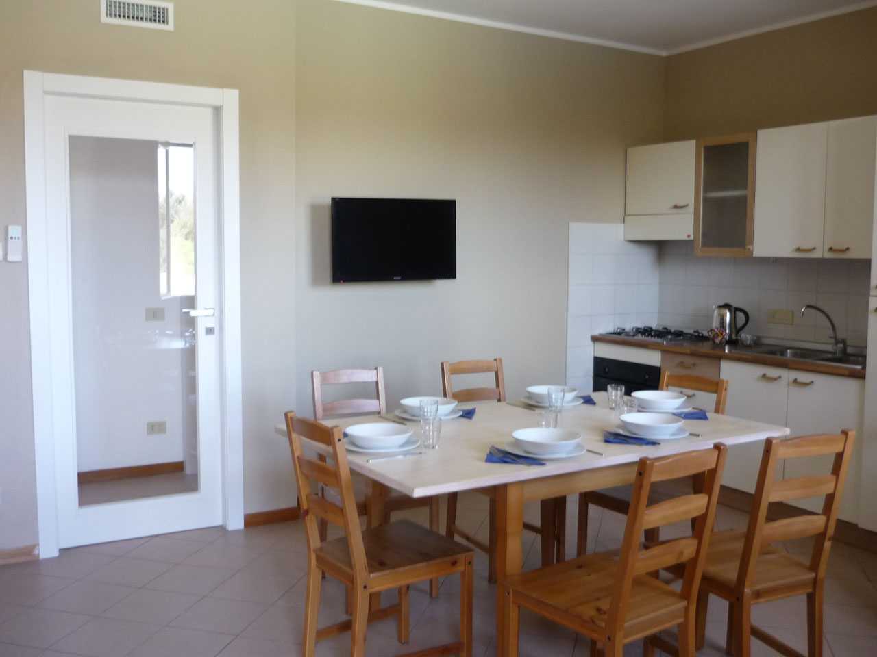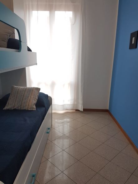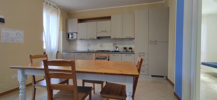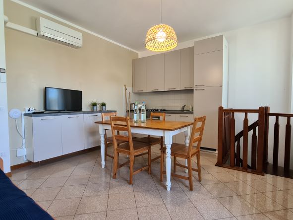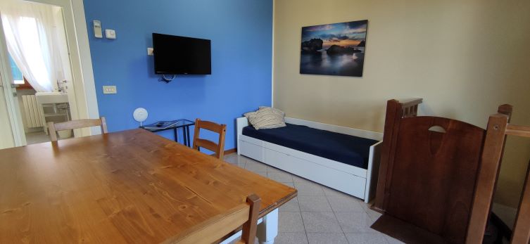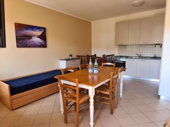 Il nostro trilocale è un appartamento di 60 mq, composto da una luminosa sala da pranzo con tavolo fino a 5 persone, con divano letto ed angolo cottura, una camera matrimoniale e una camera con letti a castello. L'appartamento ha aria condizionata in ogni stanza, tv e wi-fi e bagno con doccia. Tutti i nostri appartamenti hanno un piccolo giardino privato con tavolo e sedie dove potersi rilassare dopo una giornata di mare. Piano terra o primo piano con scale.
