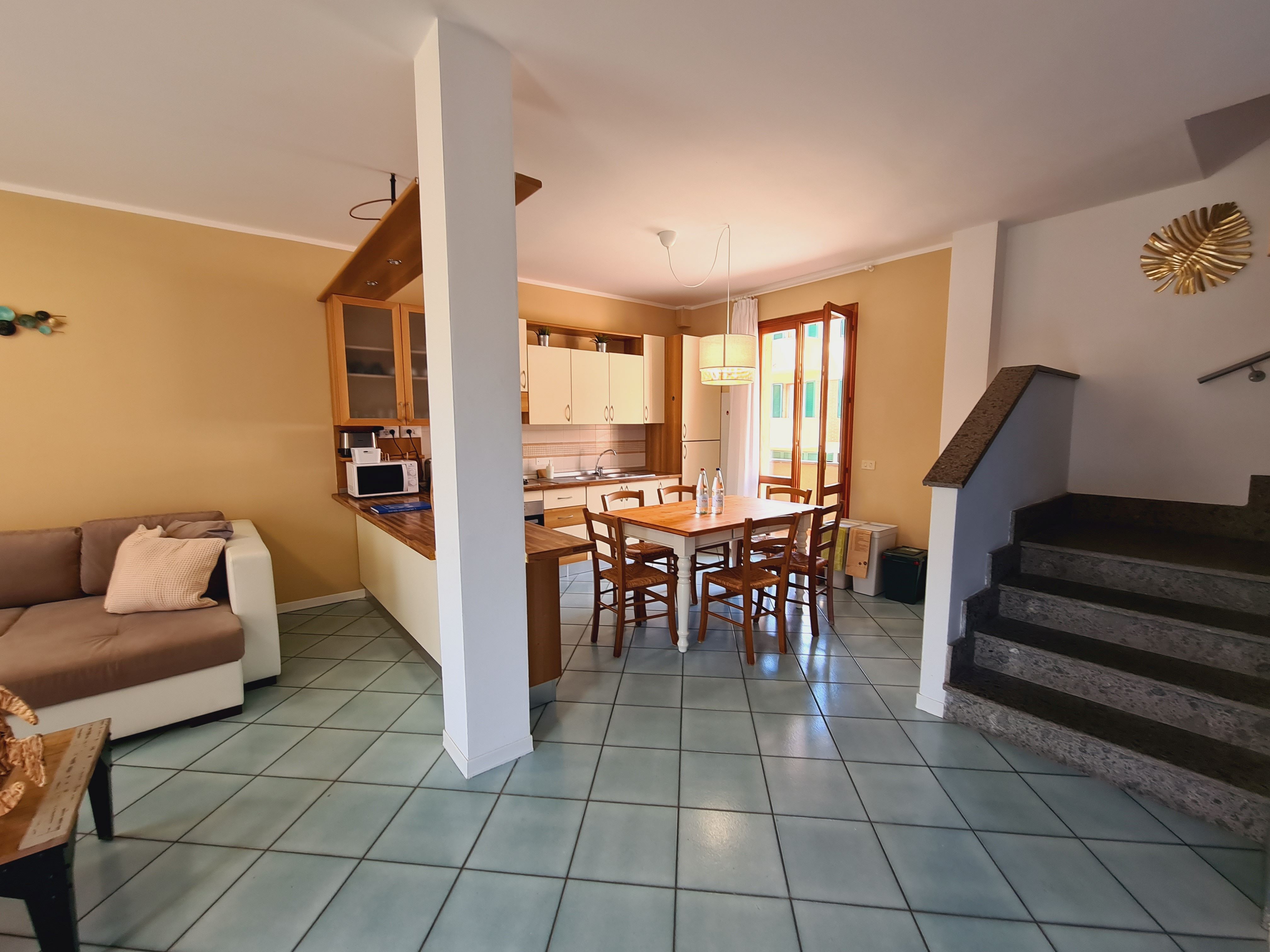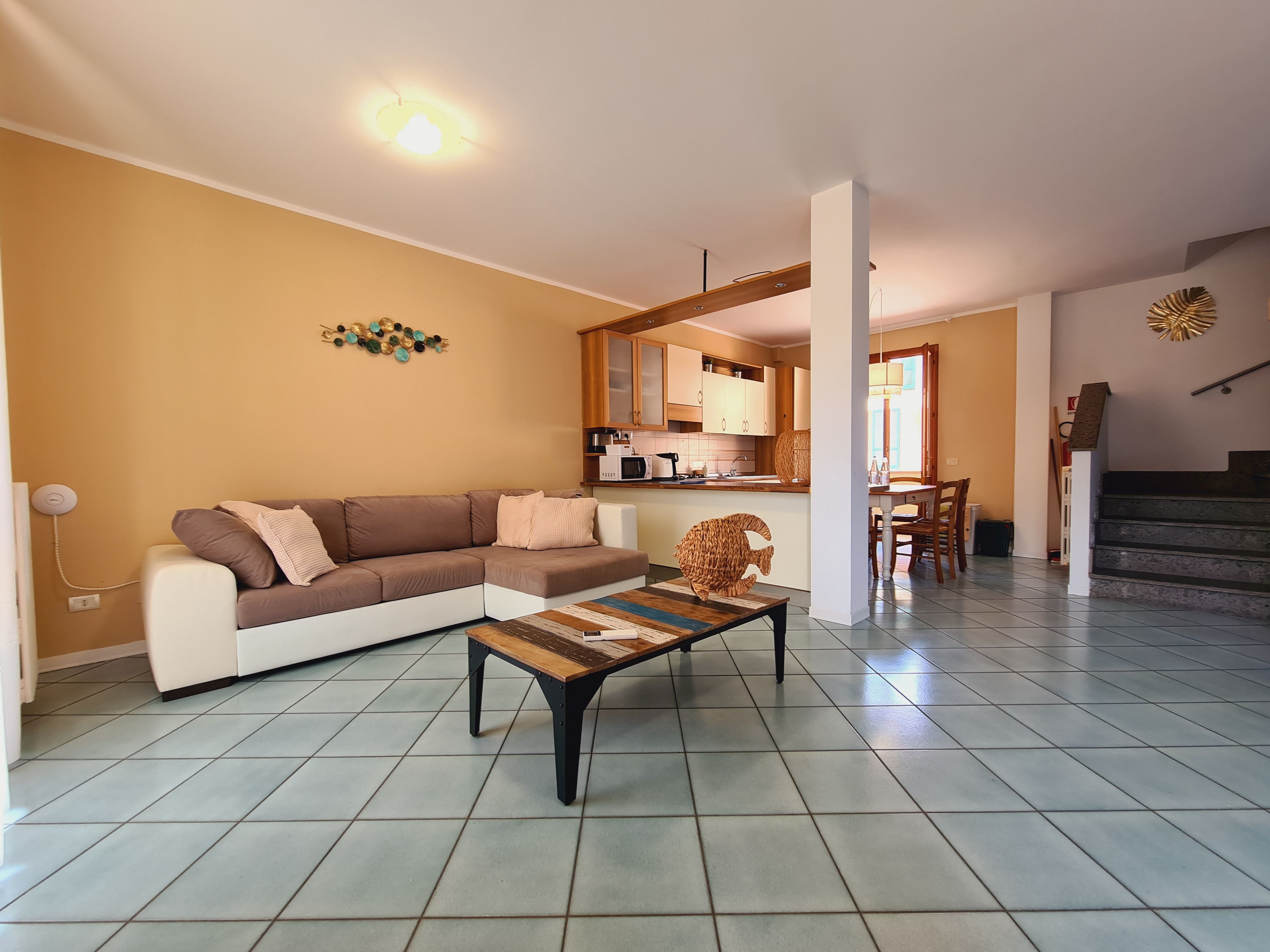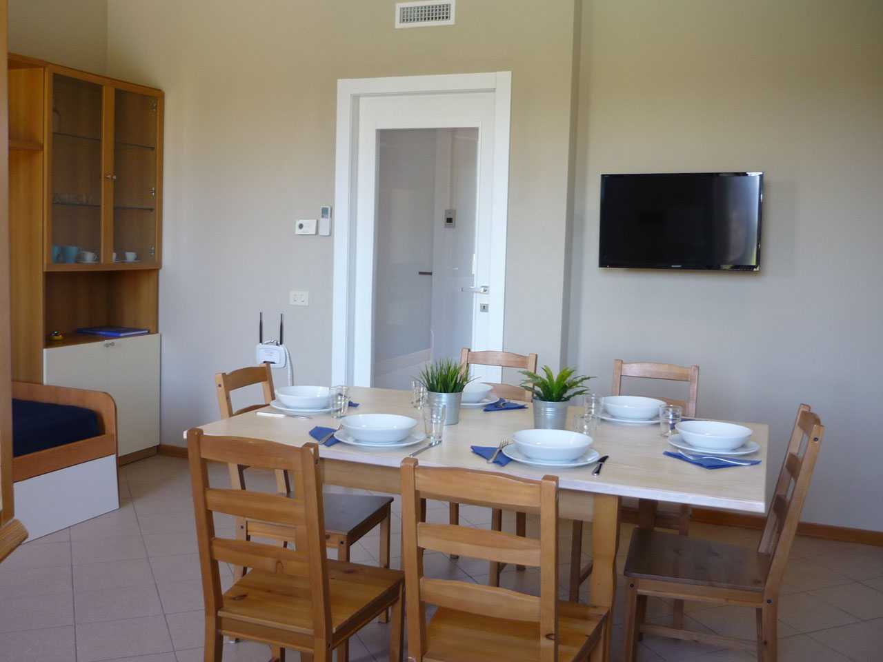 Il nostro trilocale è un appartamento di 60 mq, composto da una luminosa sala da pranzo con tavolo fino a 5 persone, con divano letto ed angolo cottura, una camera matrimoniale e una camera con letti a castello. L'appartamento ha aria condizionata in ogni stanza, tv e wi-fi e bagno con doccia. Tutti i nostri appartamenti hanno un piccolo giardino privato con tavolo e sedie dove potersi rilassare dopo una giornata di mare. Piano terra o primo piano con scale.