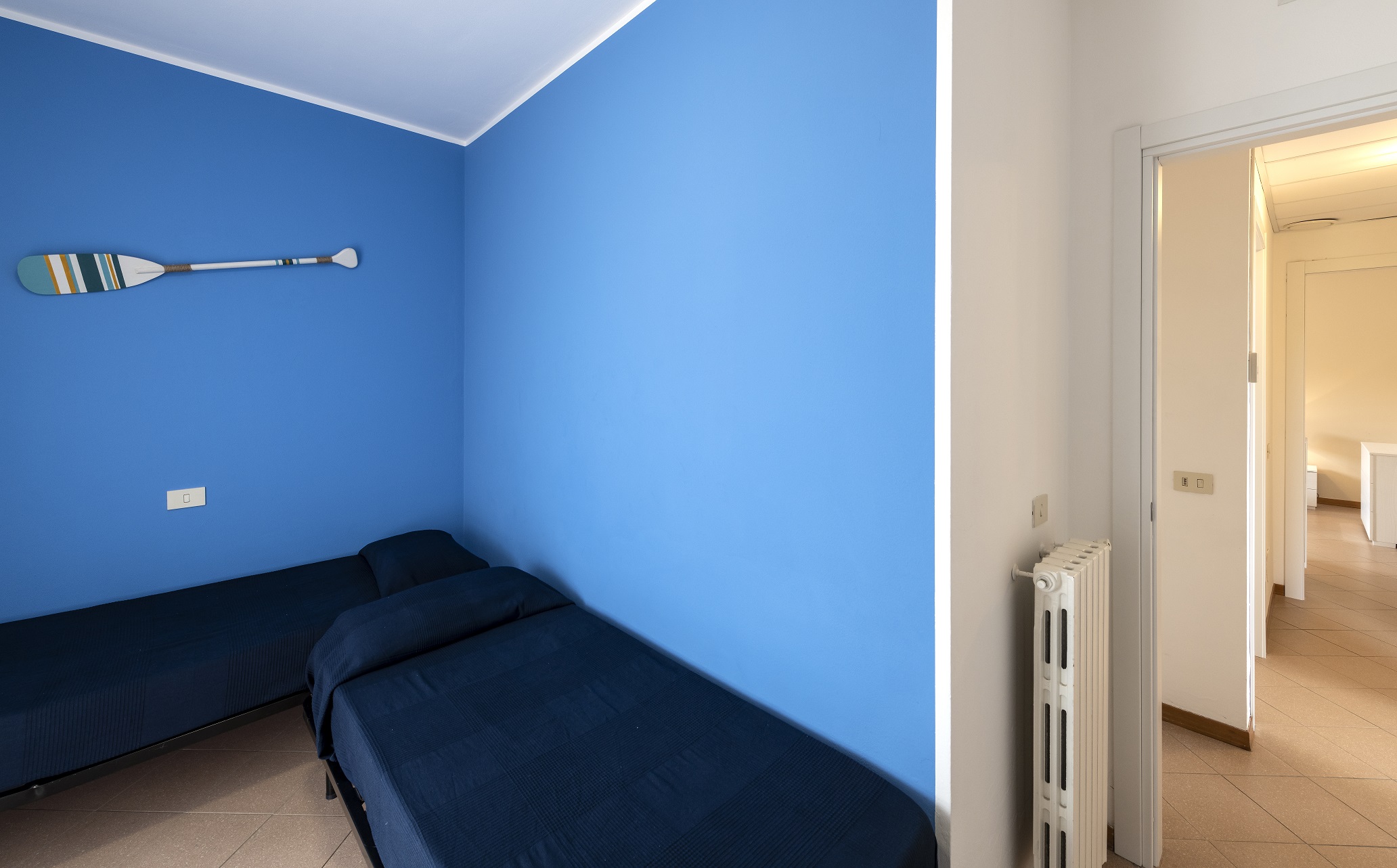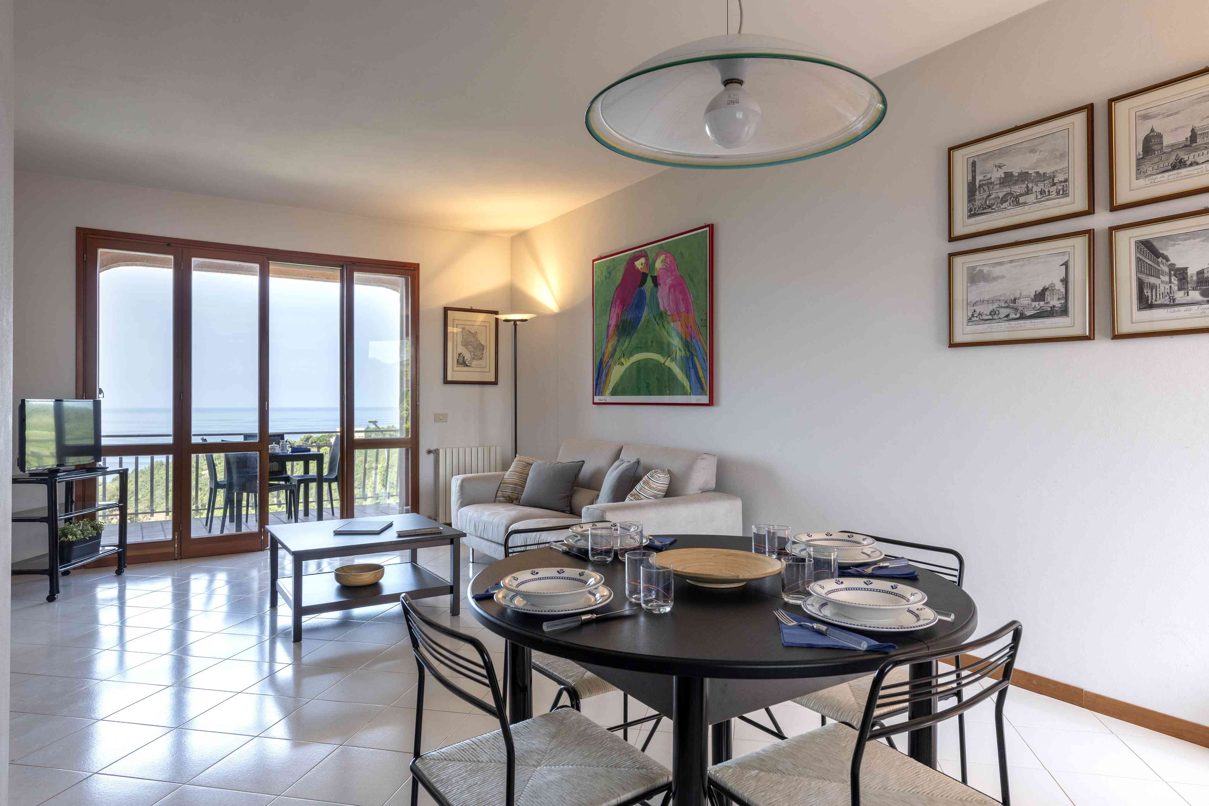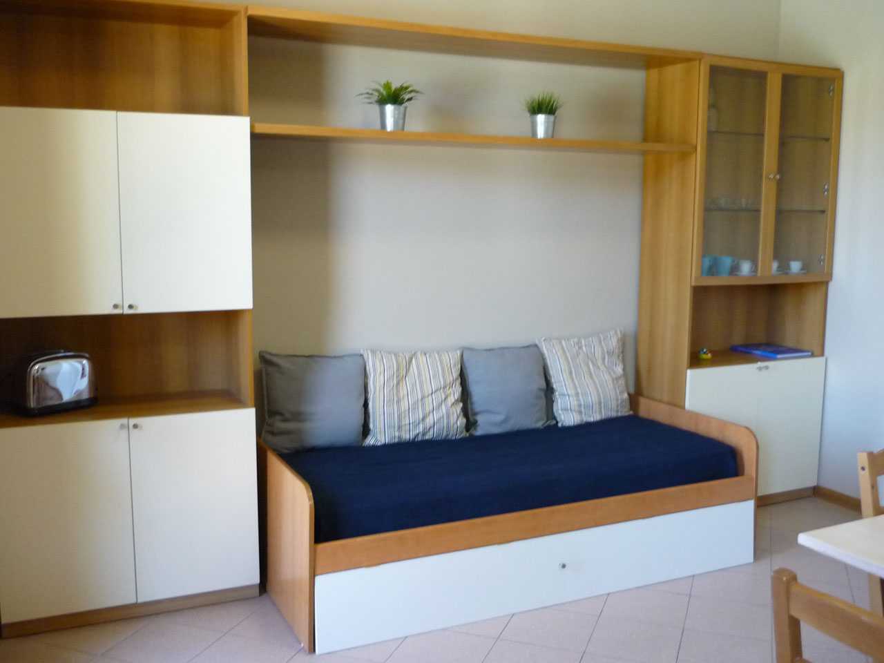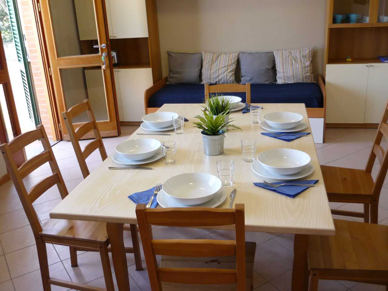Il nostro trilocale è un appartamento di 60 mq, composto da una luminosa sala da pranzo con tavolo fino a 5 persone, con divano letto ed angolo cottura, una camera matrimoniale e una camera con letti a castello. L'appartamento ha aria condizionata in ogni stanza, tv e wi-fi e bagno con doccia. Tutti i nostri appartamenti hanno un piccolo giardino privato con tavolo e sedie dove potersi rilassare dopo una giornata di mare. Piano terra o primo piano con scale.