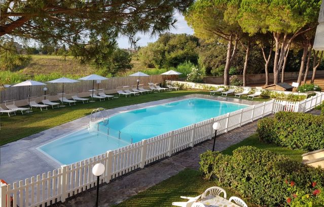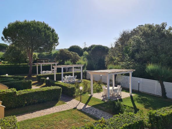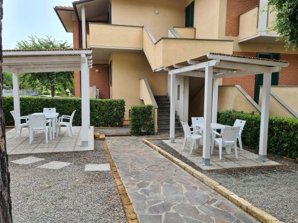 Il nostro bilocale NINFEA è un appartamento di 45 mq, composto da una luminosa sala da pranzo con tavolo per 4 persone, divano letto ed angolo cottura attrezzato, ed una camera matrimoniale. Fronte piscina, l'appartamento ha aria condizionata in ogni stanza, tv e wi-fi e bagno con doccia. Piano terra. Il piccolo giardino privato con tavolo e sedie è fronte piscina.