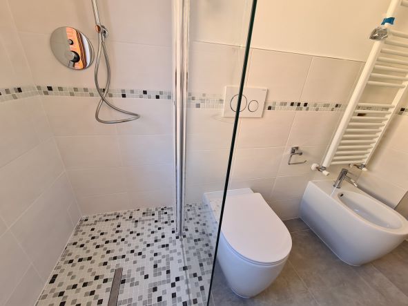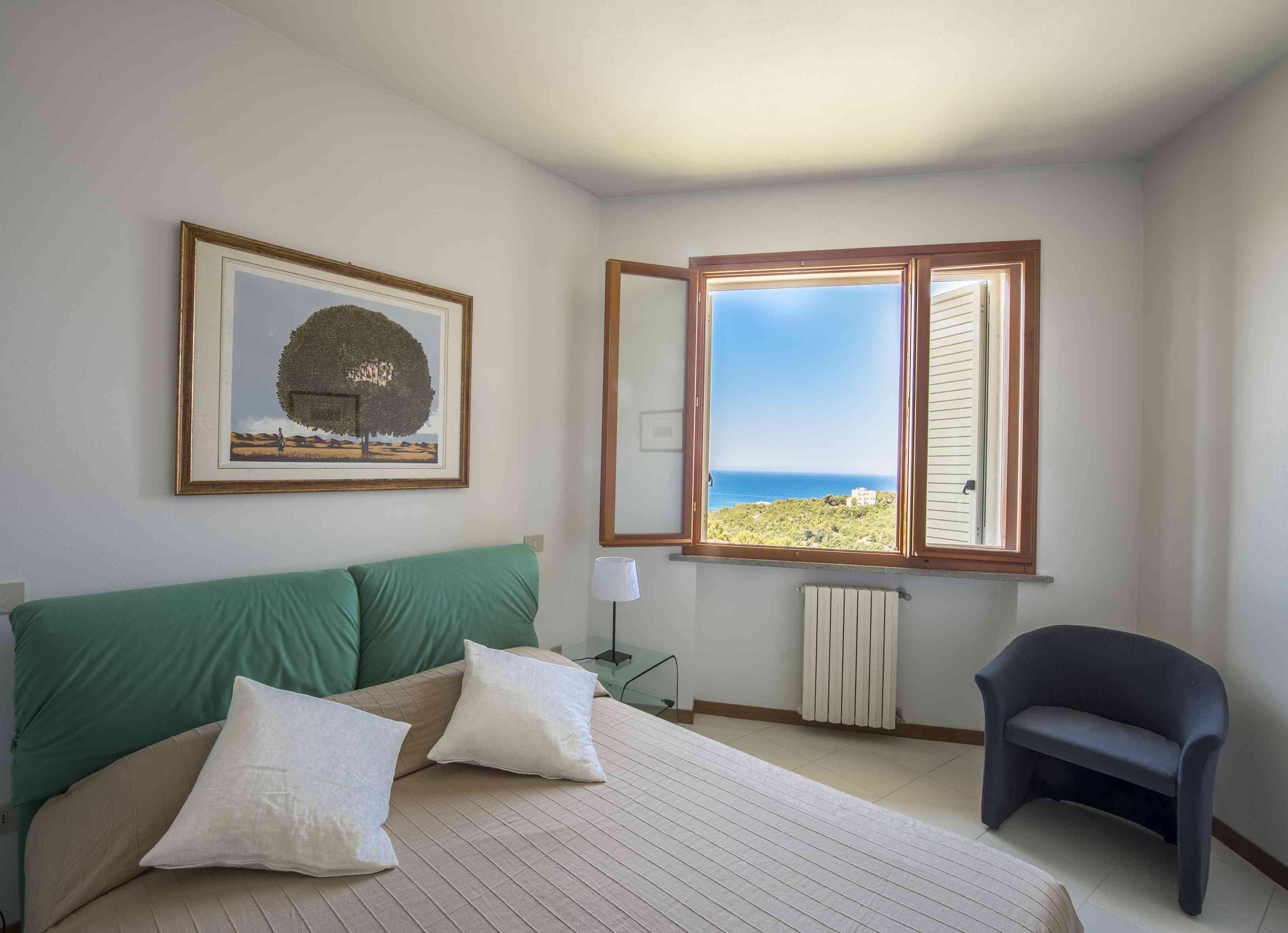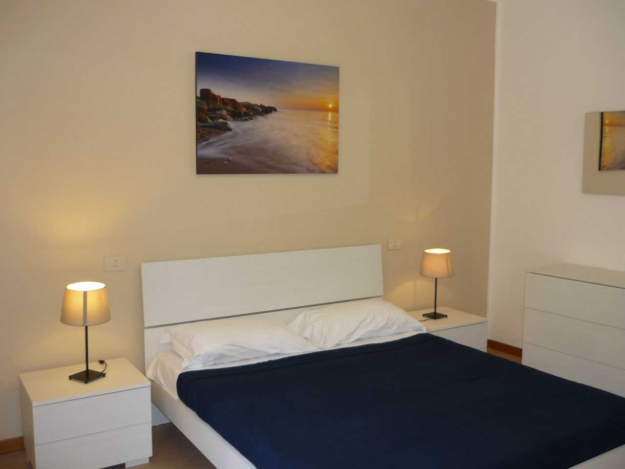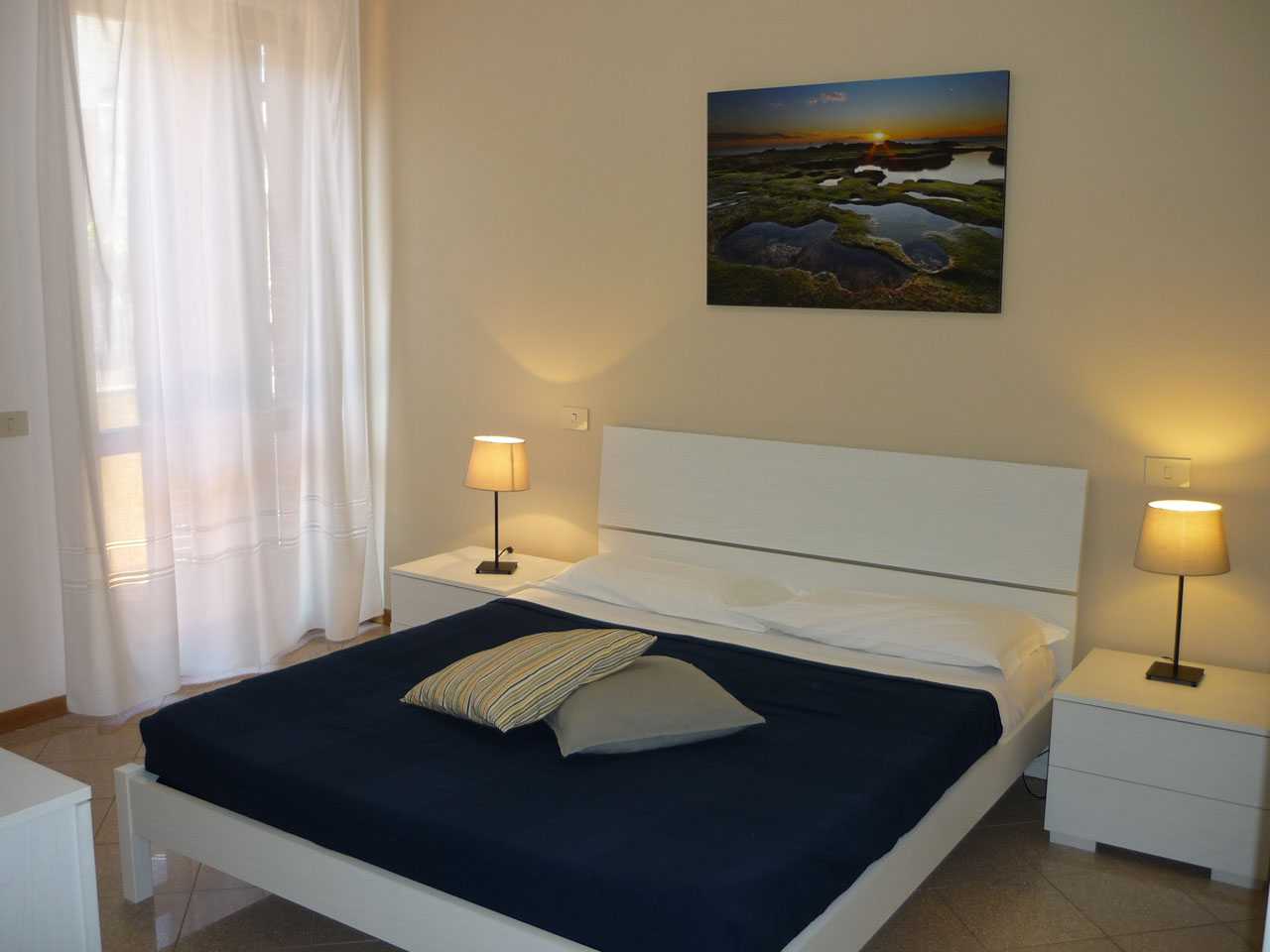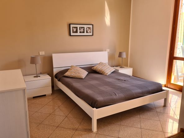 Appartamento per max 4 persone con luminoso soggiorno, angolo cottura moderno e completo di lavapiatti, microonde e bollitore. Due camere da letto (1 camera matrimoniale ed una con letti singoli) con mobili e finiture di pregio e bagno. L'appartamento dispone di un ampio terrazzo con vista sul mare e di un piccolo giardino con tavolo e sedie per rilassarsi dopo una giornata di mare, fare piacevoli cene all'aperto e di posto auto esclusivo.