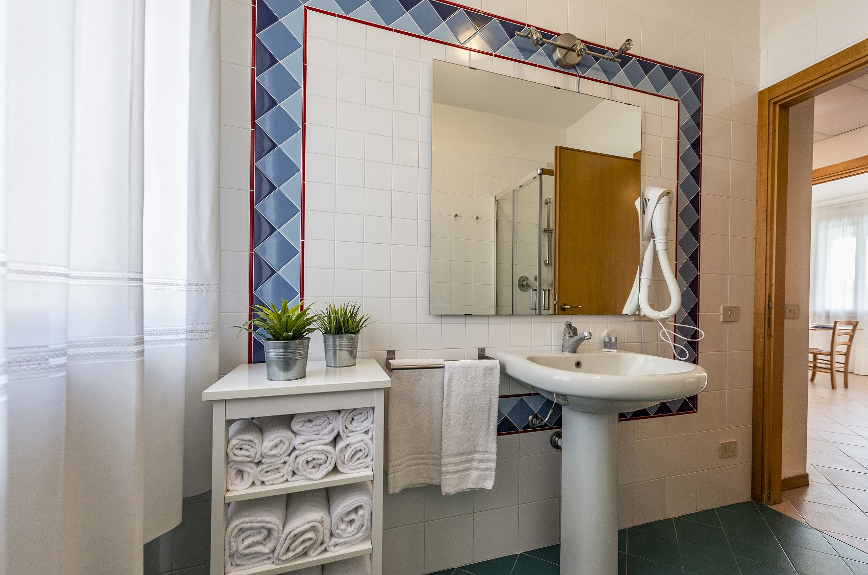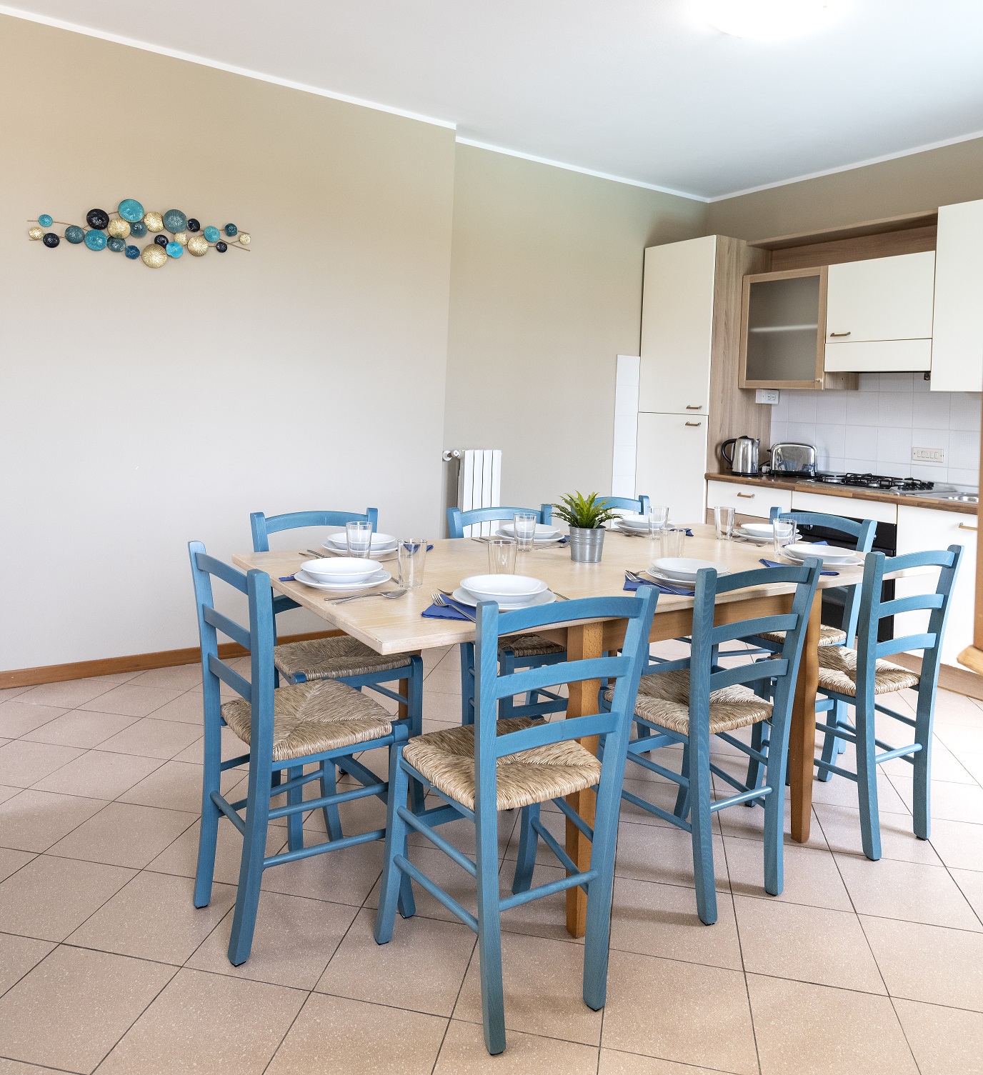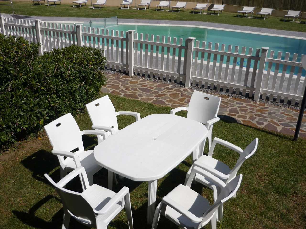 Il nostro trilocale NETTUNO è un appartamento di 60 mq, composto da una luminosa sala da pranzo con tavolo per 6 persone, con letto singolo ed angolo cottura, una camera matrimoniale e una camera con 2 letti singoli. Fronte piscina, l'appartamento ha aria condizionata in ogni stanza, tv e wi-fi e bagno con doccia. Il piccolo giardino privato con tavolo e sedie è fronte piscina. Piano terra.