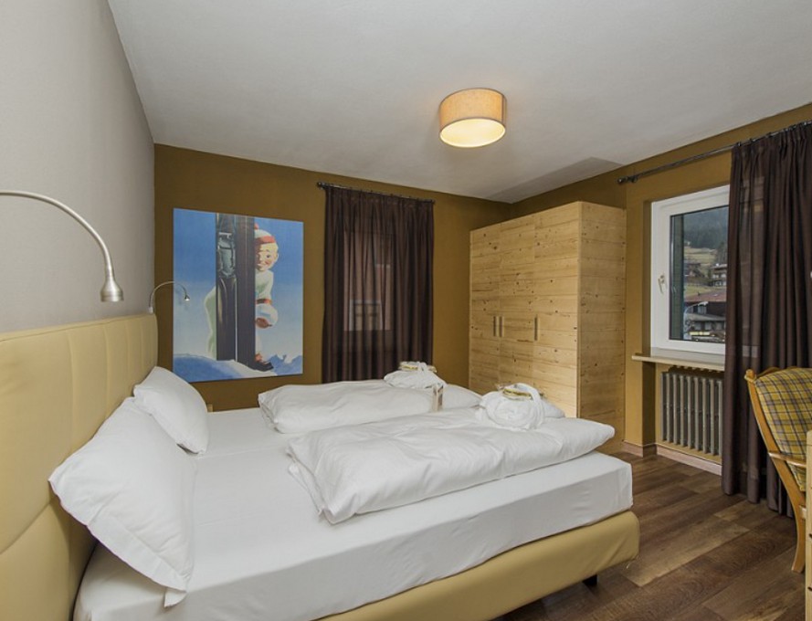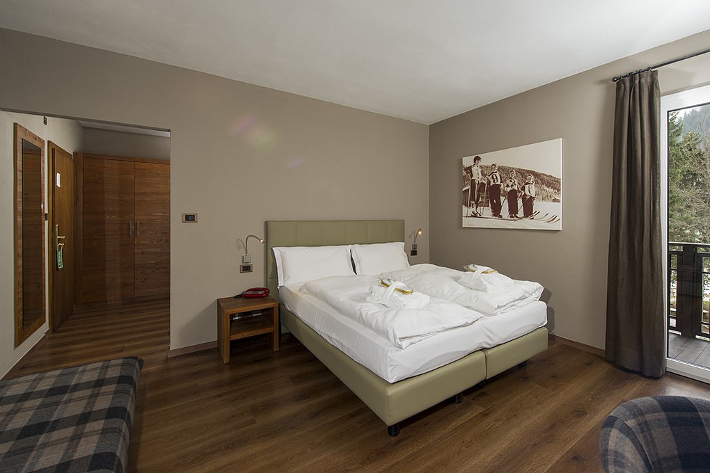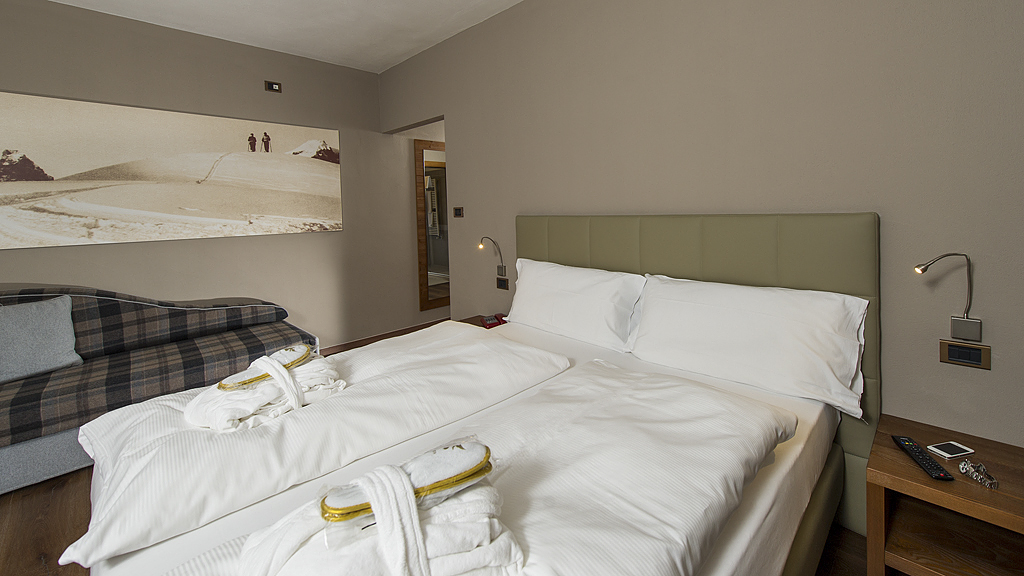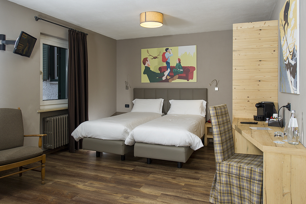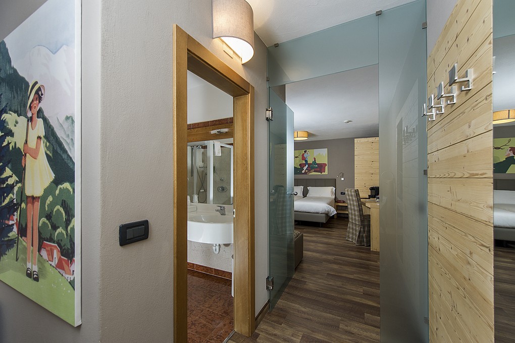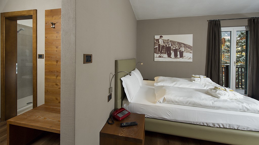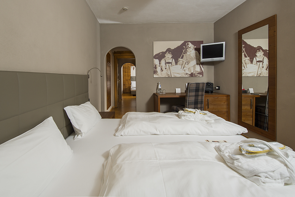 Modernity and comfort characterize the Villa Mitzi rooms. They have a bathroom with shower. Ideal for 2 adults + 1 child. Located in the Villa Mitzi building, on the mezzanine floor, internally connected to the historic Gran Baita building. In some there is the possibility of adding a 4th bed. It does not have a balcony.