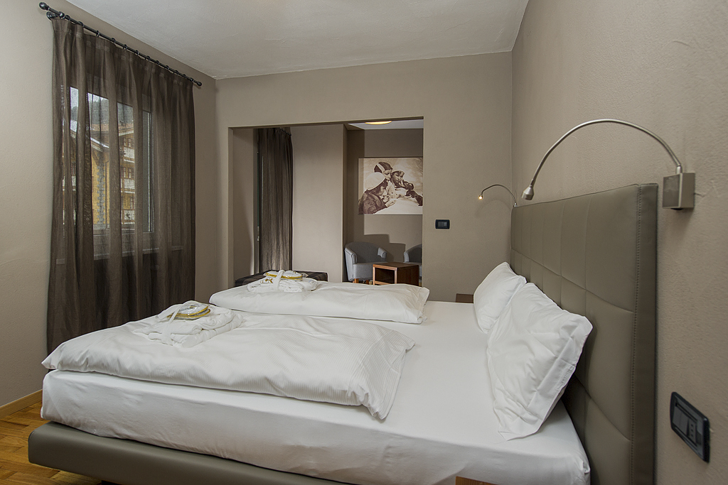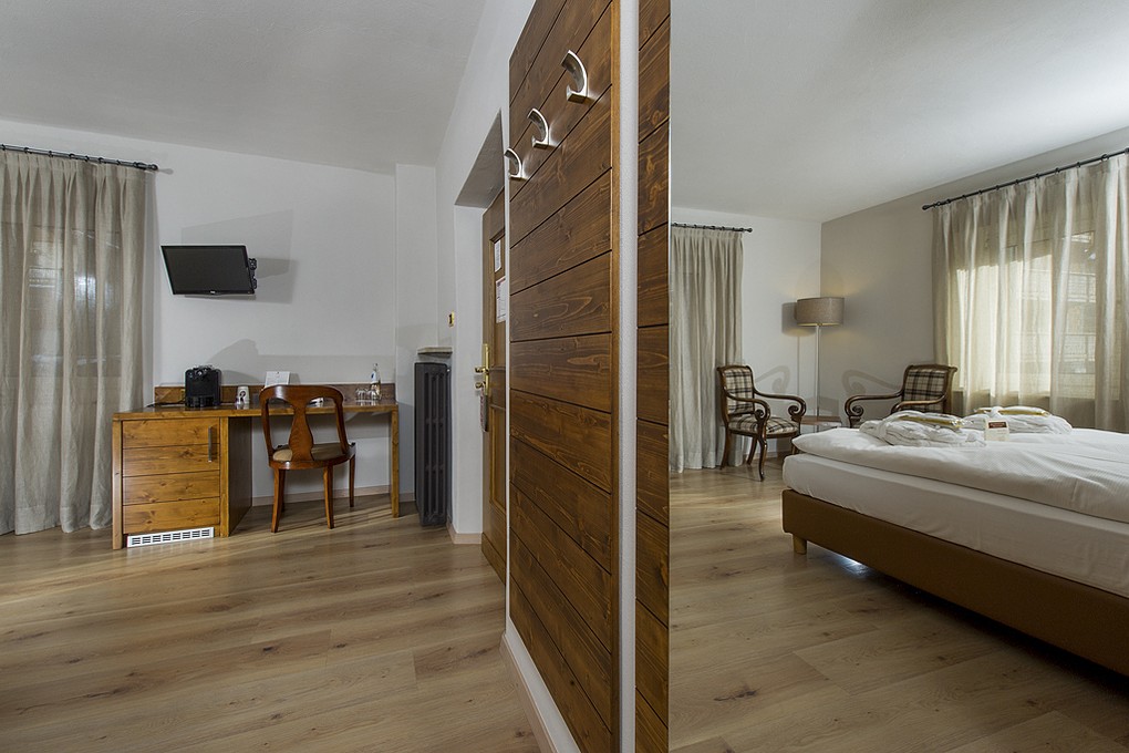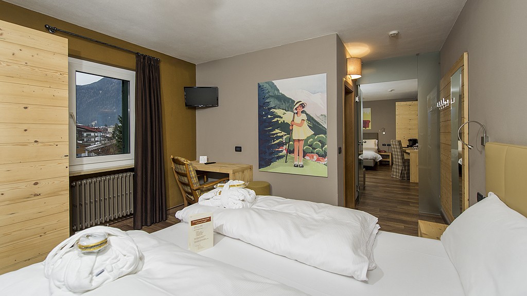 We provide all the space and comfort you are looking for in our adjoining rooms Villa Mitzi. Equipped with 2 bathrooms, one with shower and one with bathtub, 2 TVs, minibar and wifi. The two rooms are connected via an internal non-soundproof door which guarantees visual privacy. Ideal for large families of up to 6 people. Located in the Villa Mitzi building in the garden area, internally connected to the historic Gran Baita building.