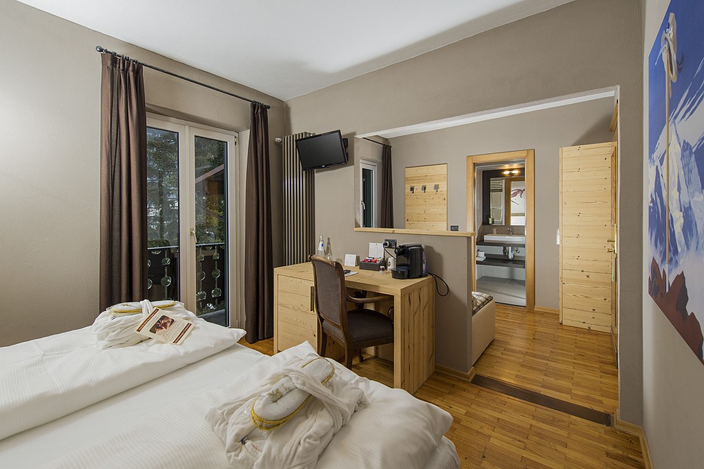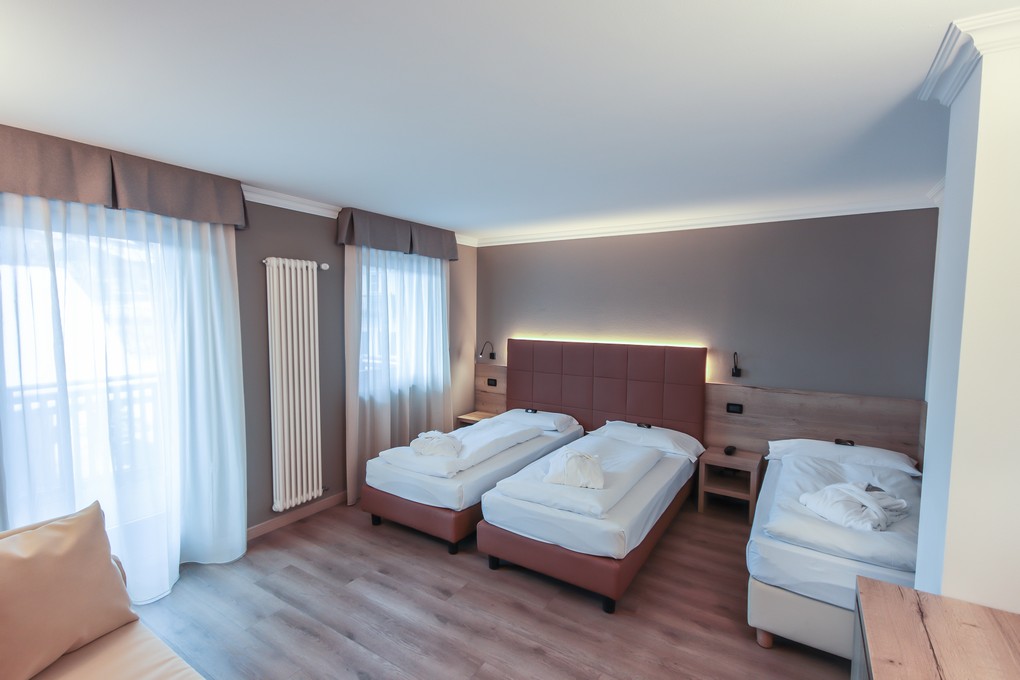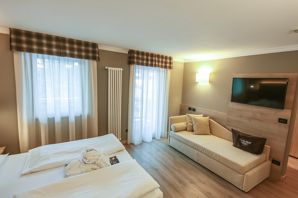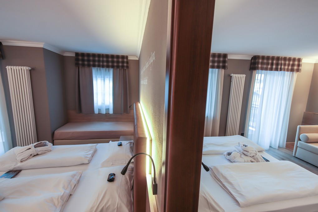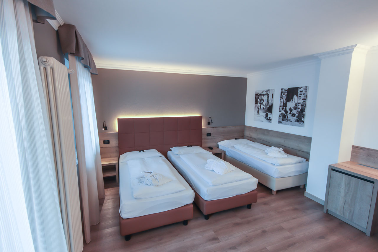Modernity and comfort characterize the Triple rooms of Villa Mitzi with balcony. They are equipped with a bathroom with shower or bathtub. Ideal for 2 adults and 1 or 2 children, with the presence of a double bed, single sofa bed and the possibility of a 4th bed for the second child. Located in the Villa Mitzi building in the garden area, internally connected to the historic Gran Baita building.