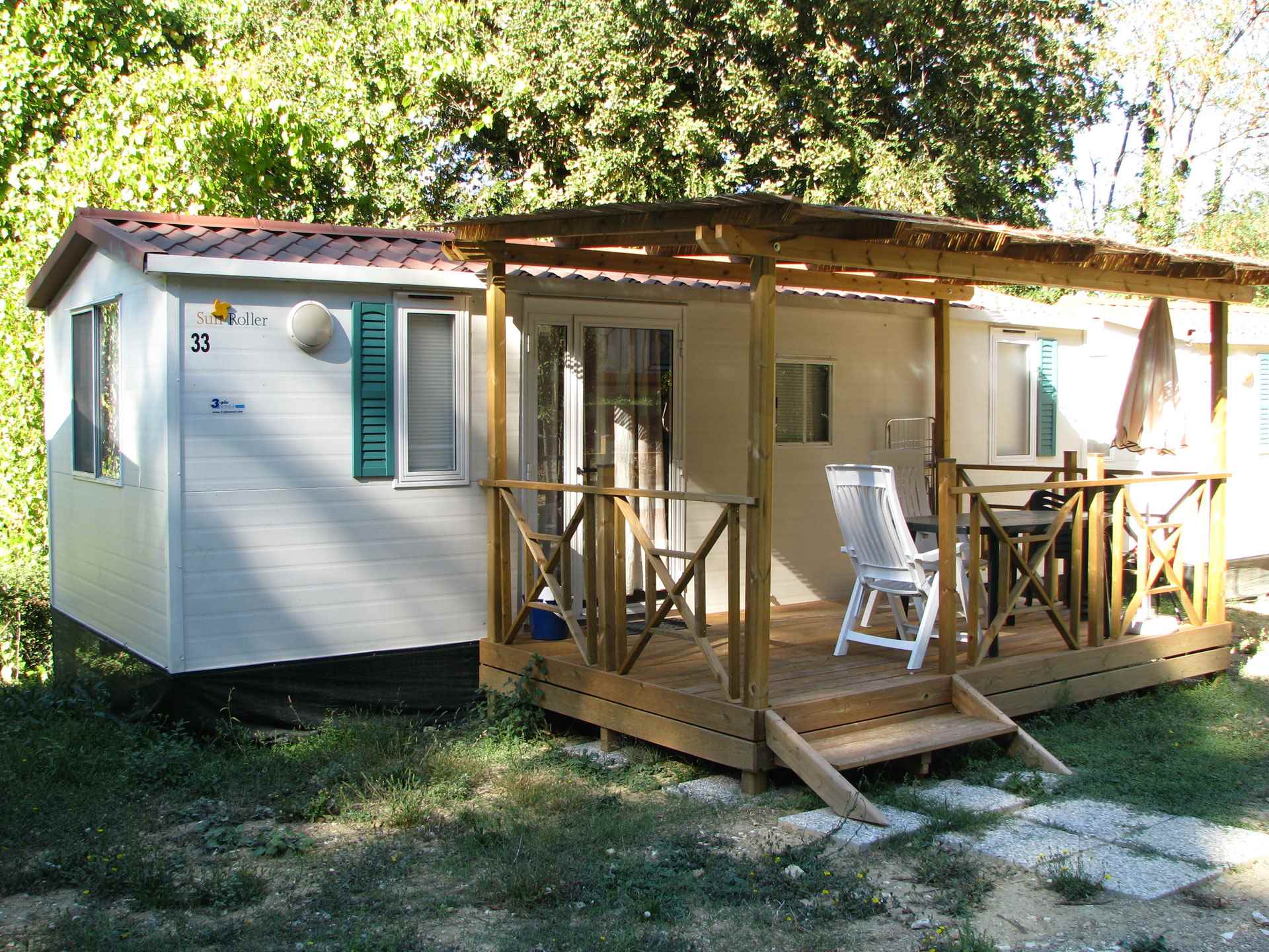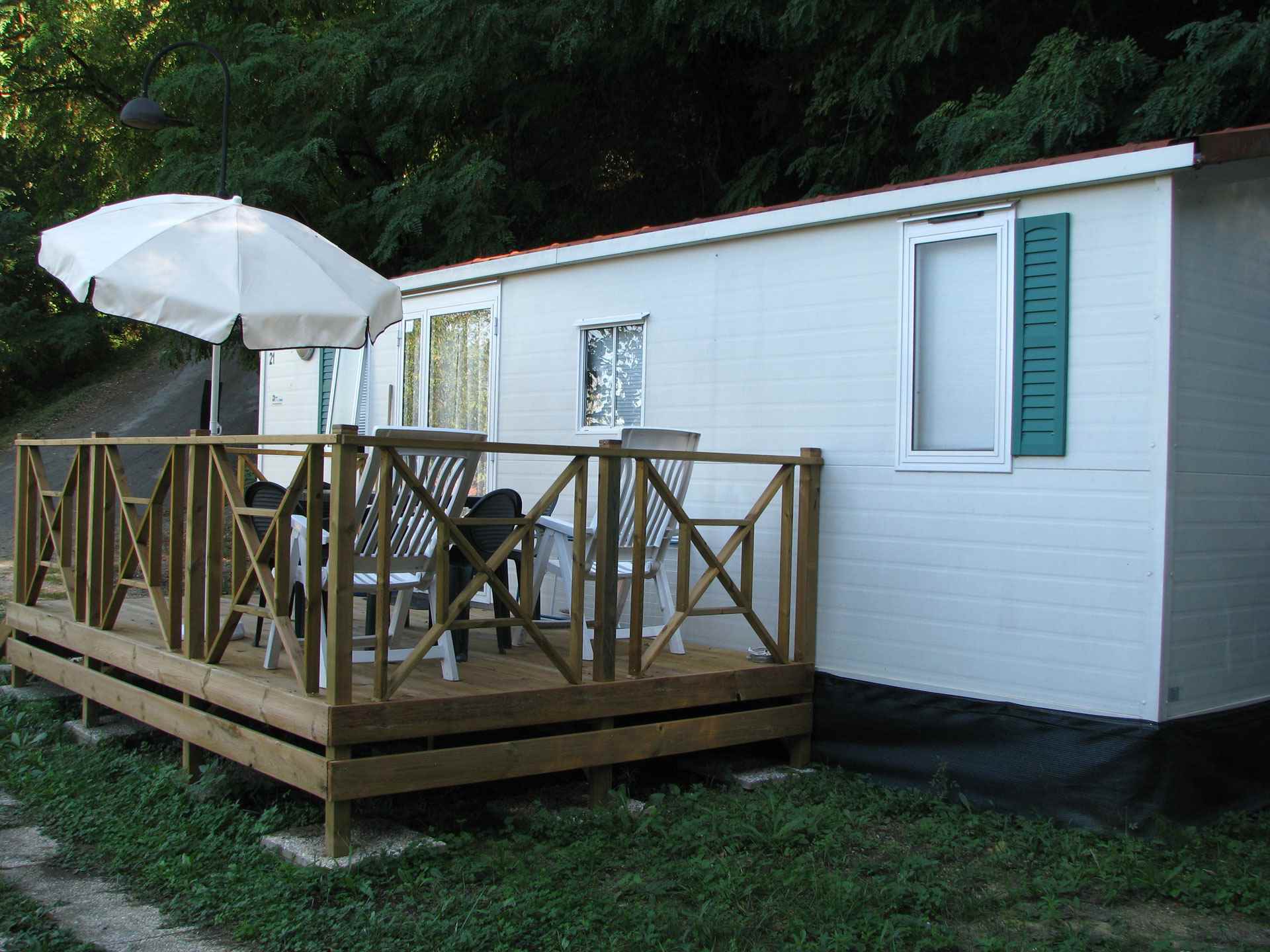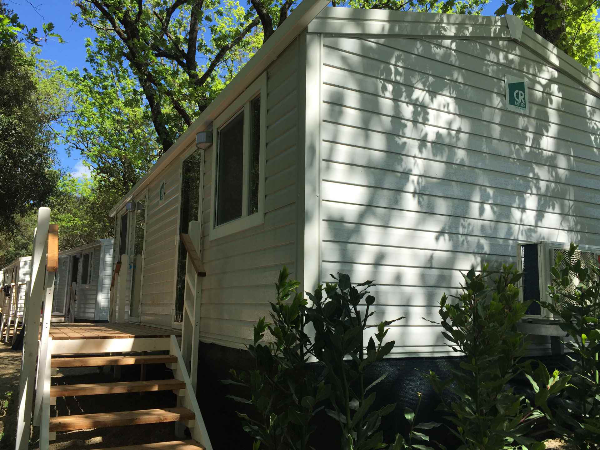 Le nostre case mobili con cucina sono molto confortevoli e spaziose per massimo 5 persone. Ogni casa mobile ha due camere da letto, un bagno con cabina doccia e lavello, un Wc separato. In una camera ci sono tre letti singoli, di cui uno a castello consigliato per bambini fino a 11 anni, nell'altra camera c'è un letto matrimoniale. Nel soggiorno, con divano letto singolo, è presente una cucina attrezzata, un frigorifero con congelatore e un piano cottura a 4 fuochi. All'esterno è presente una spaziosa veranda in legno arredata con tavolo, sedie, barbecue, sdrai ed ombrellone.