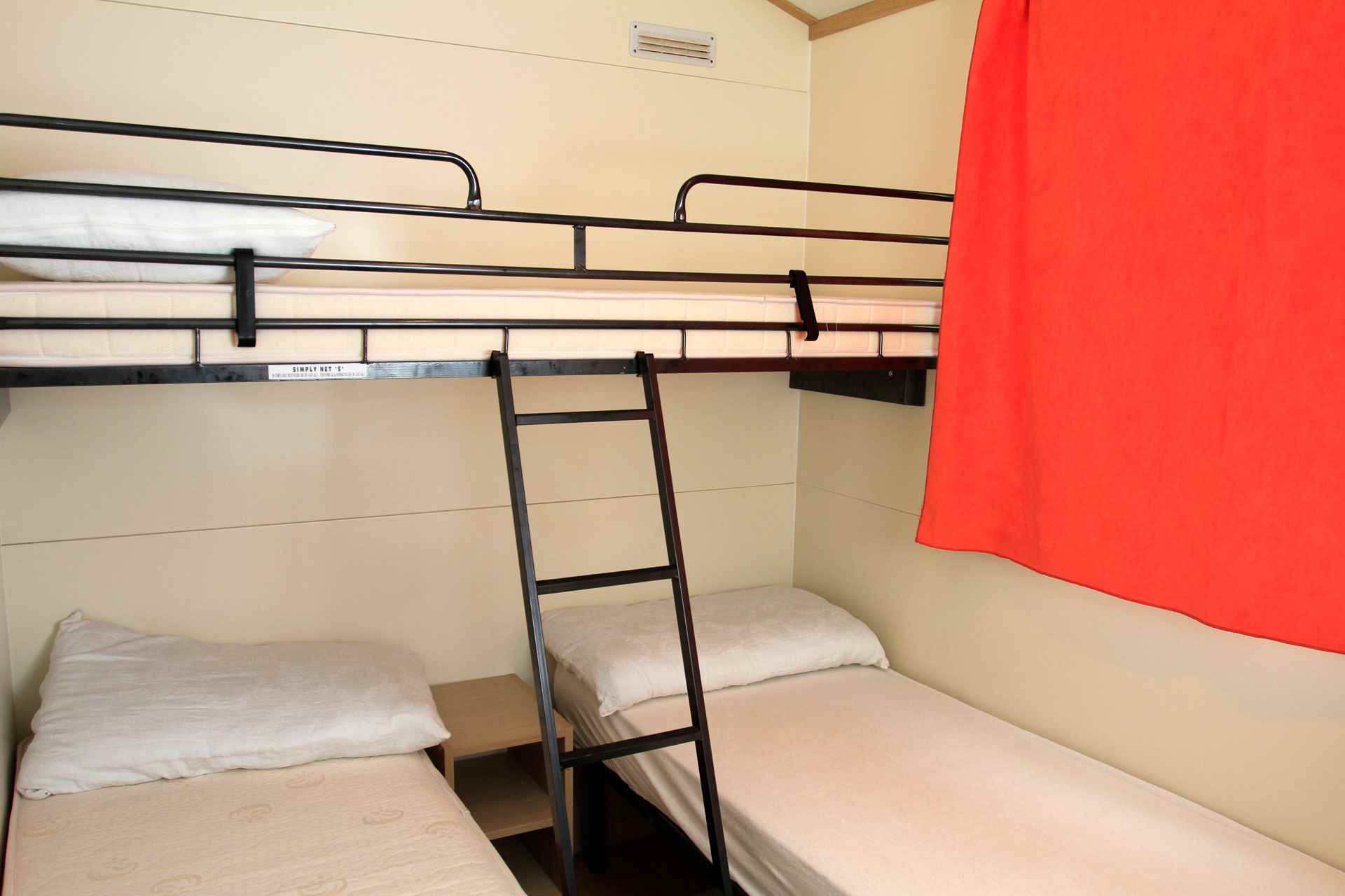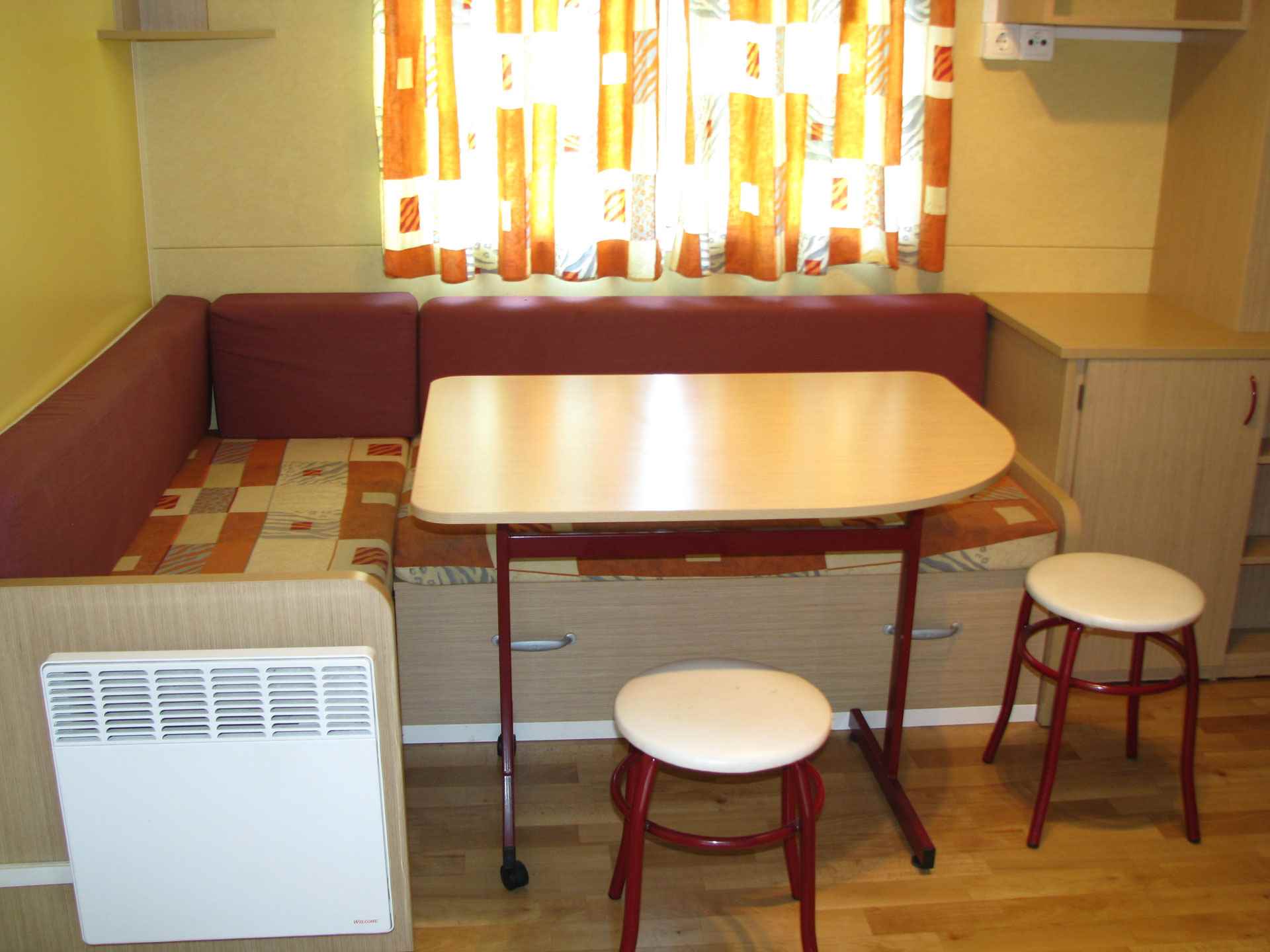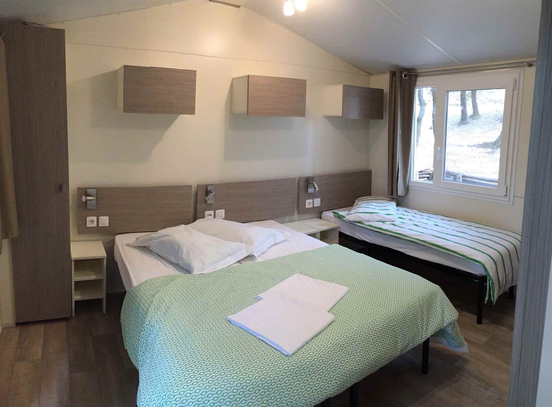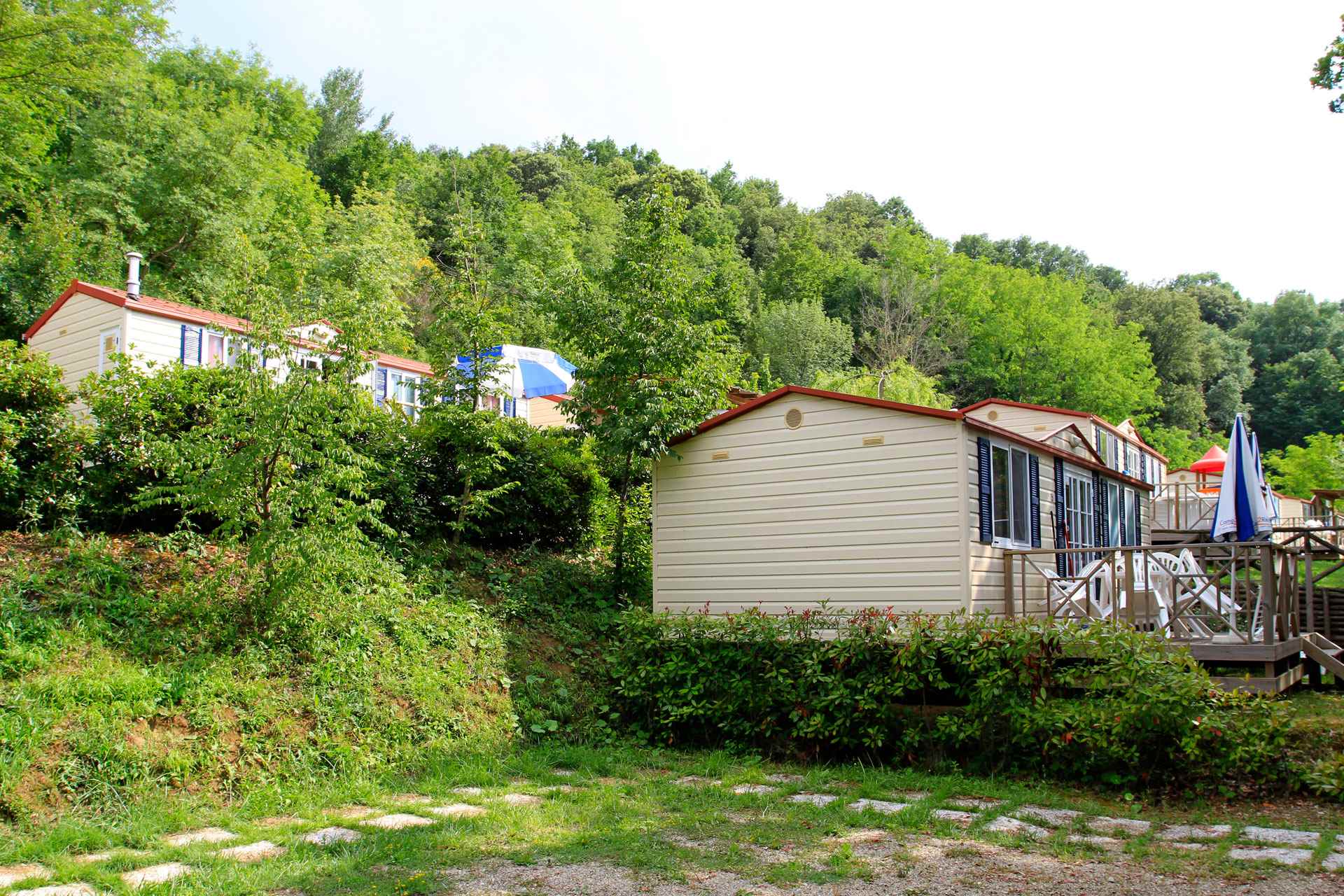 Le nostre case mobili con cucina sono molto confortevoli e spaziose per massimo 5 persone. Ogni casa mobile ha due camere da letto, un bagno con cabina doccia e lavello, un Wc separato. In una camera ci sono tre letti singoli, di cui uno a castello consigliato per bambini fino a 11 anni, nell'altra camera c'è un letto matrimoniale. Nel soggiorno, con divano letto singolo, è presente una cucina attrezzata, un frigorifero con congelatore e un piano cottura a 4 fuochi. All'esterno è presente una spaziosa veranda in legno arredata con tavolo, sedie, barbecue, sdrai ed ombrellone.