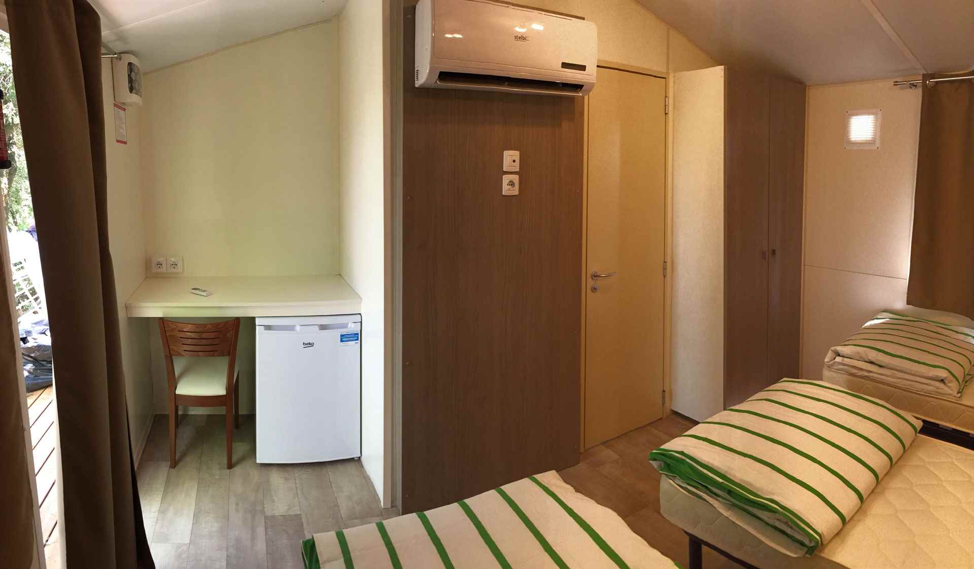 La casa mobile Green Room è una camera tripla con bagno privato molto confortevole e spaziosa per massimo 3 persone. Ha 3 letti singoli oppure un letto matrimoniale ed uno singolo, un bagno con cabina doccia, lavello e Wc. Nella camera è presente anche un frigorifero ed una scrivania. Non è presente la cucina. All'esterno è attrezzata con un tavolo e tre sedie.