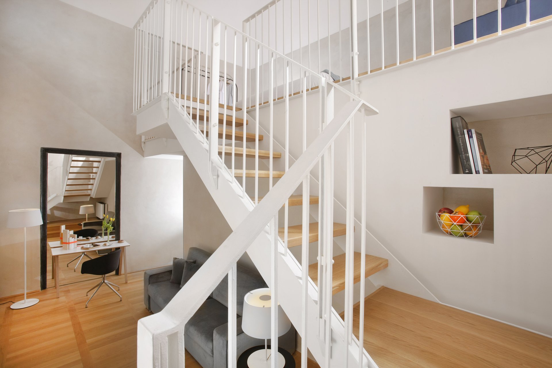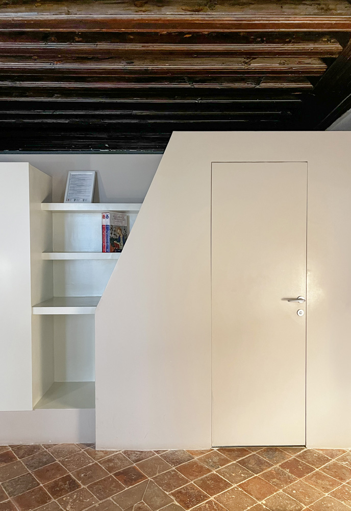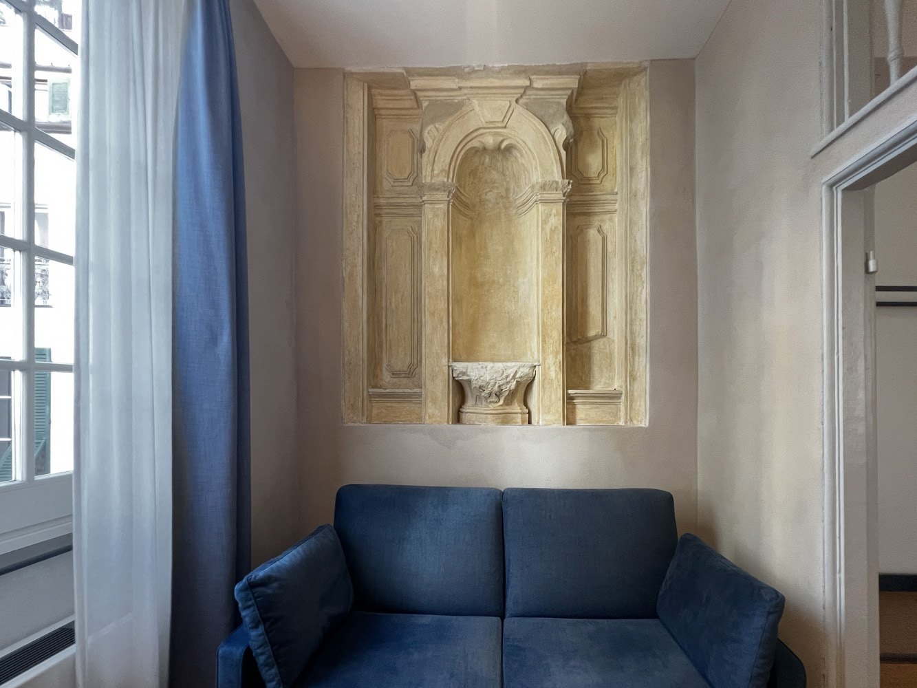 Alto soffitto, pavimento in resina, portali in ardesia originali e una piccola zona lettura all'interno di una nicchia del '500. Grande ricercatezza negli arredi di design con uno stile elegante ed essenziale.
