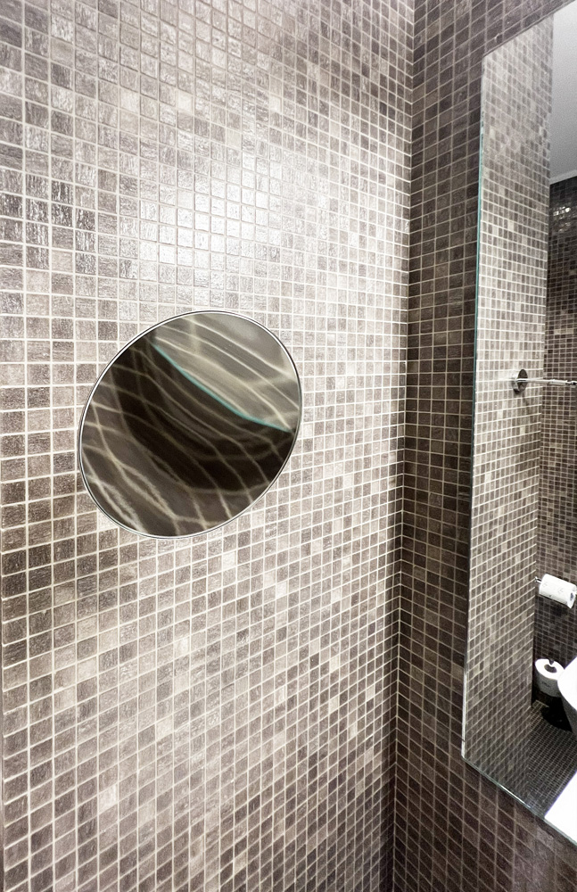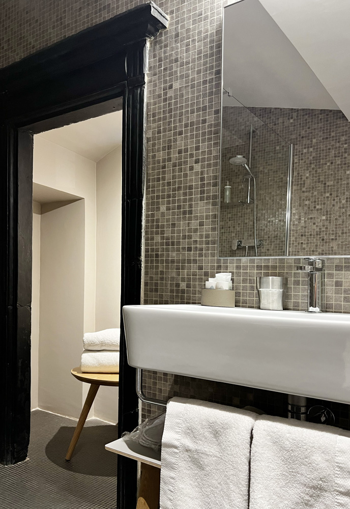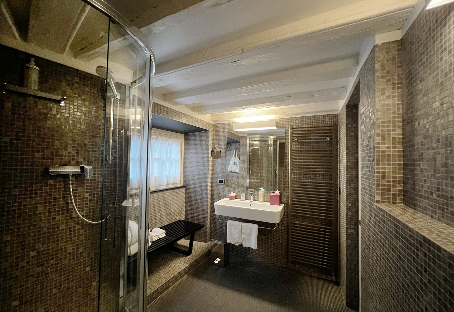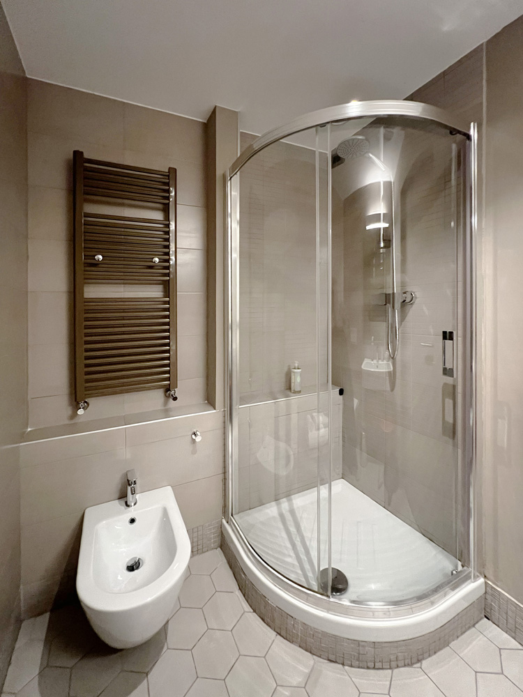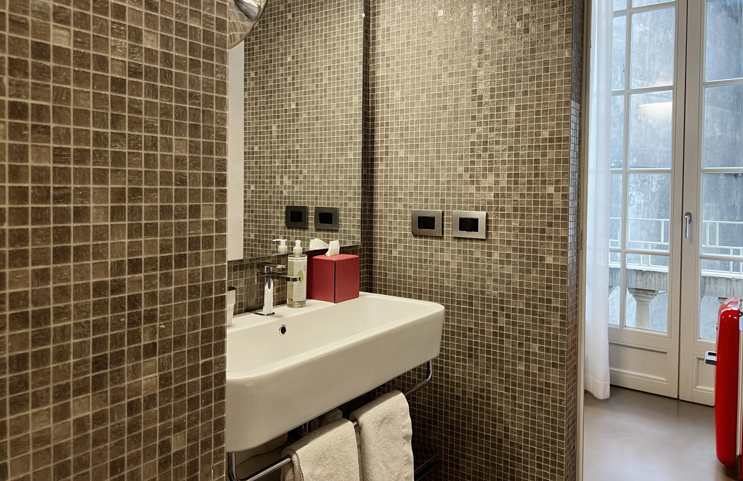 Bagno elegante con doccia con presenza di ulteriori dettagli storici, prodotti di detergenza Osmè Ecocert a dispenser con extra kit prodotti cortesia monouso e altri a richiesta.
