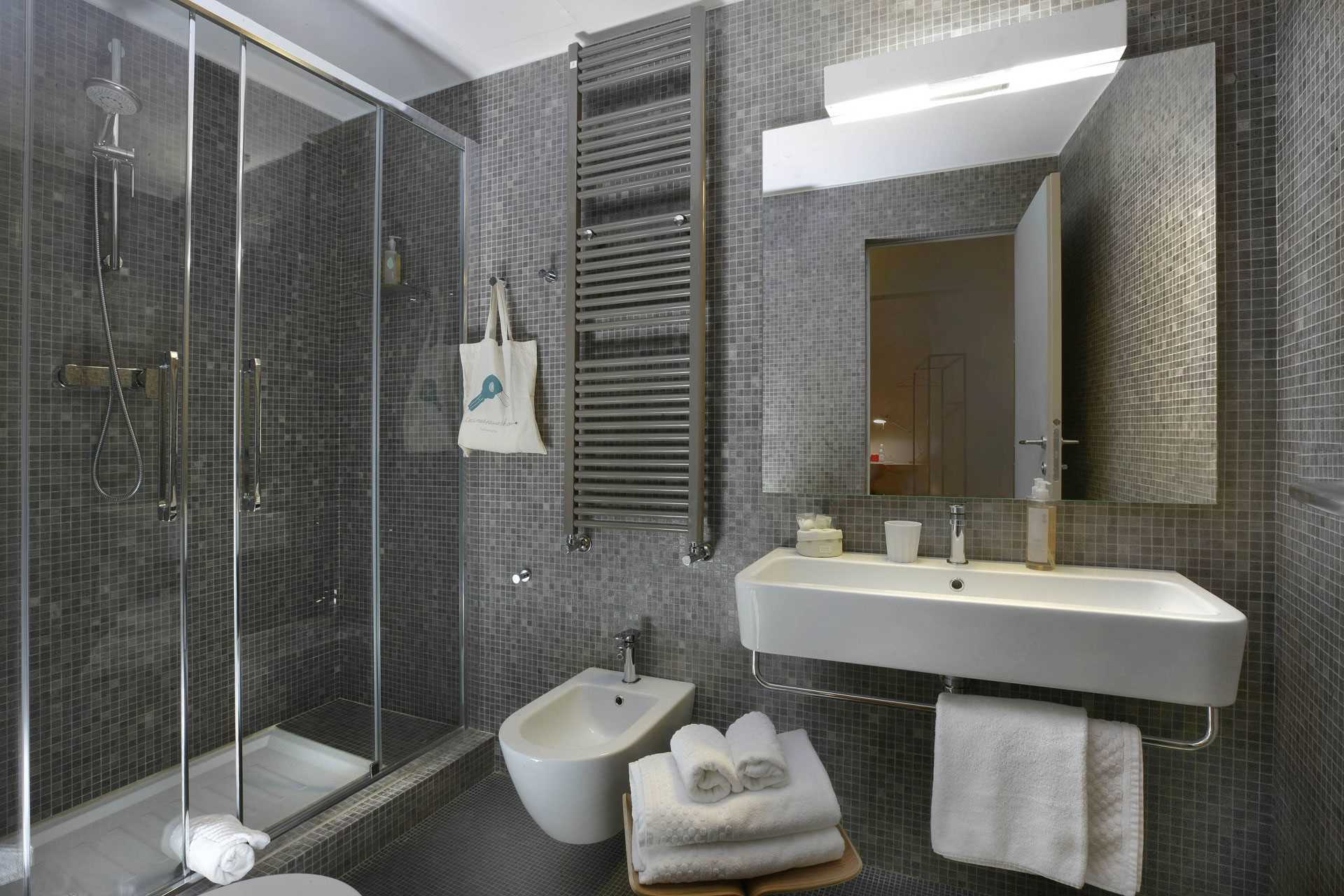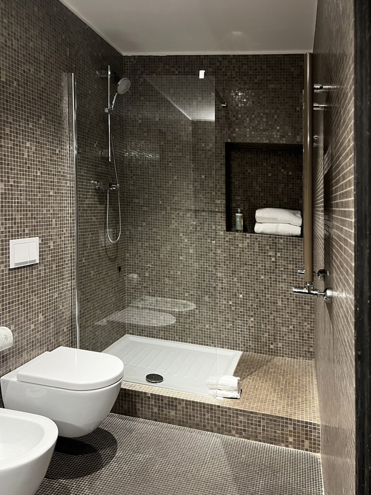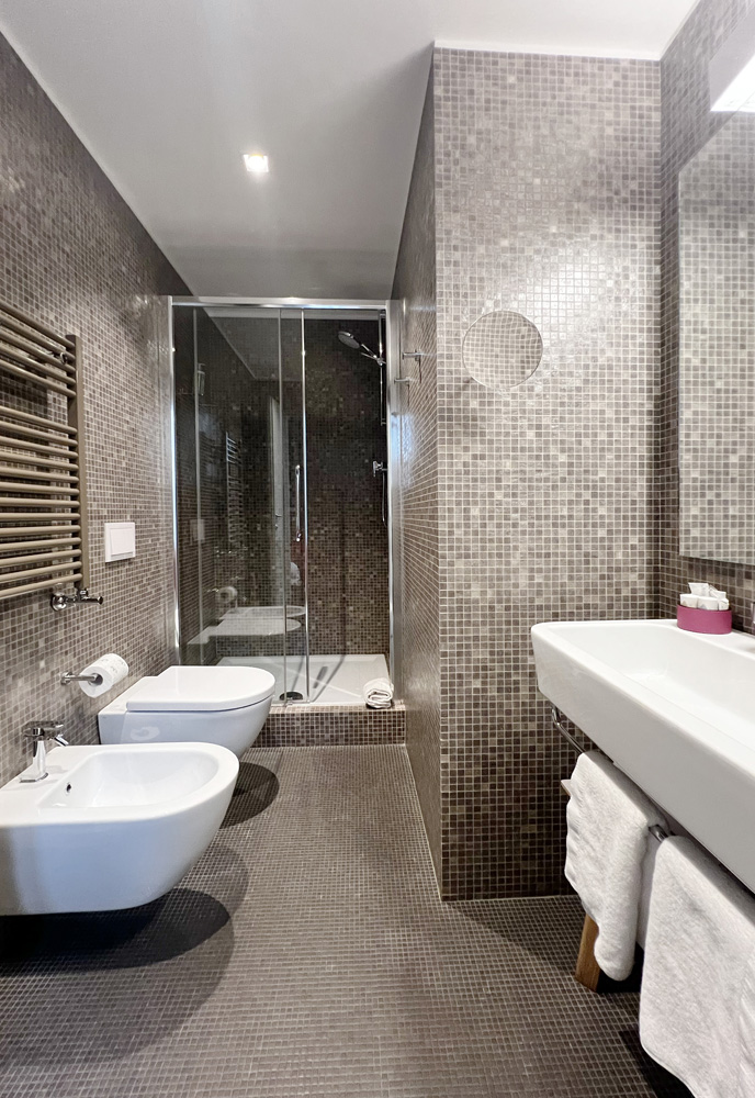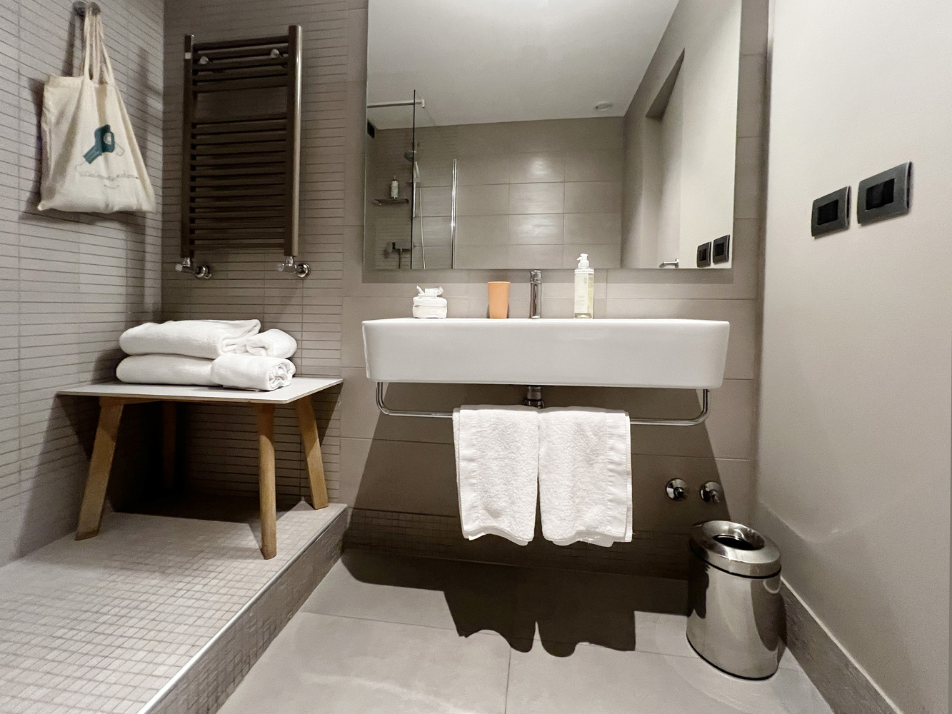 Bagno elegante con doccia, prodotti di detergenza Osmè Ecocert a dispenser con extra kit prodotti cortesia monouso e altri a richiesta.