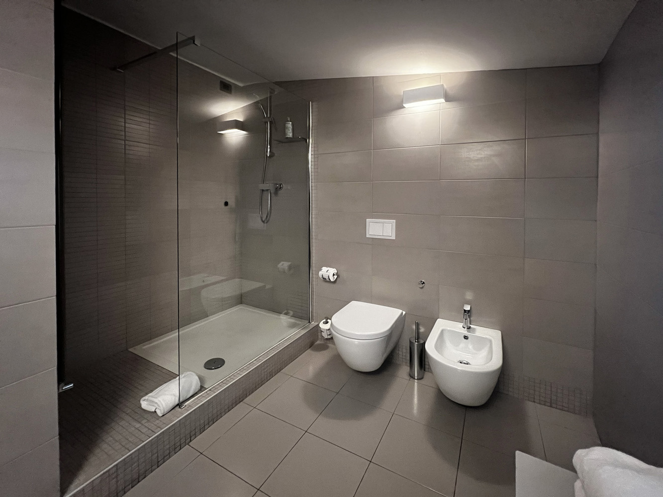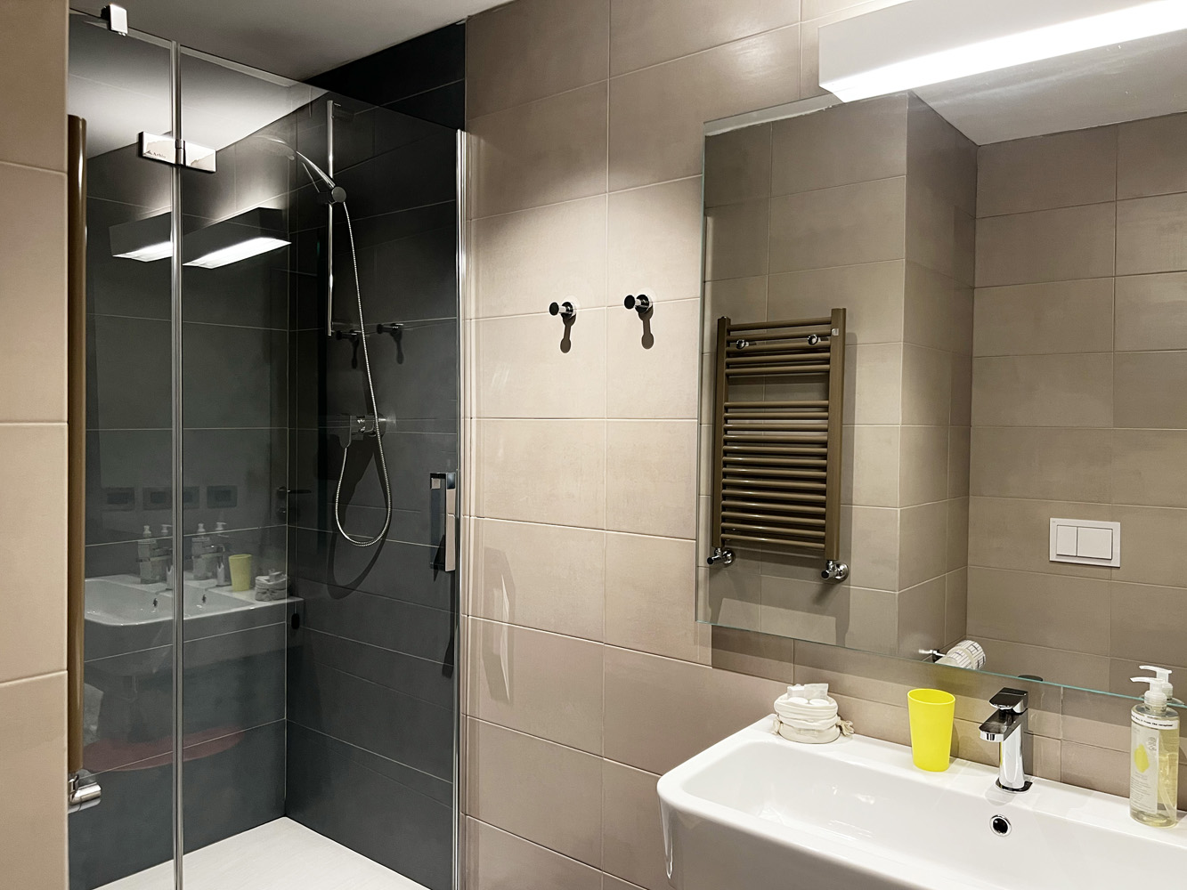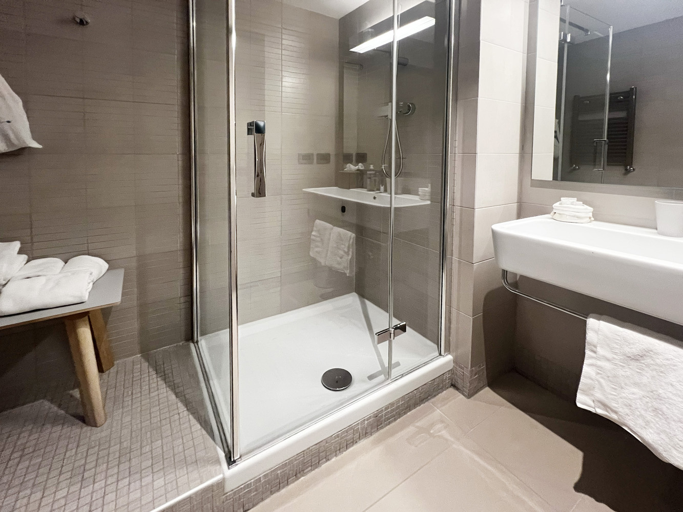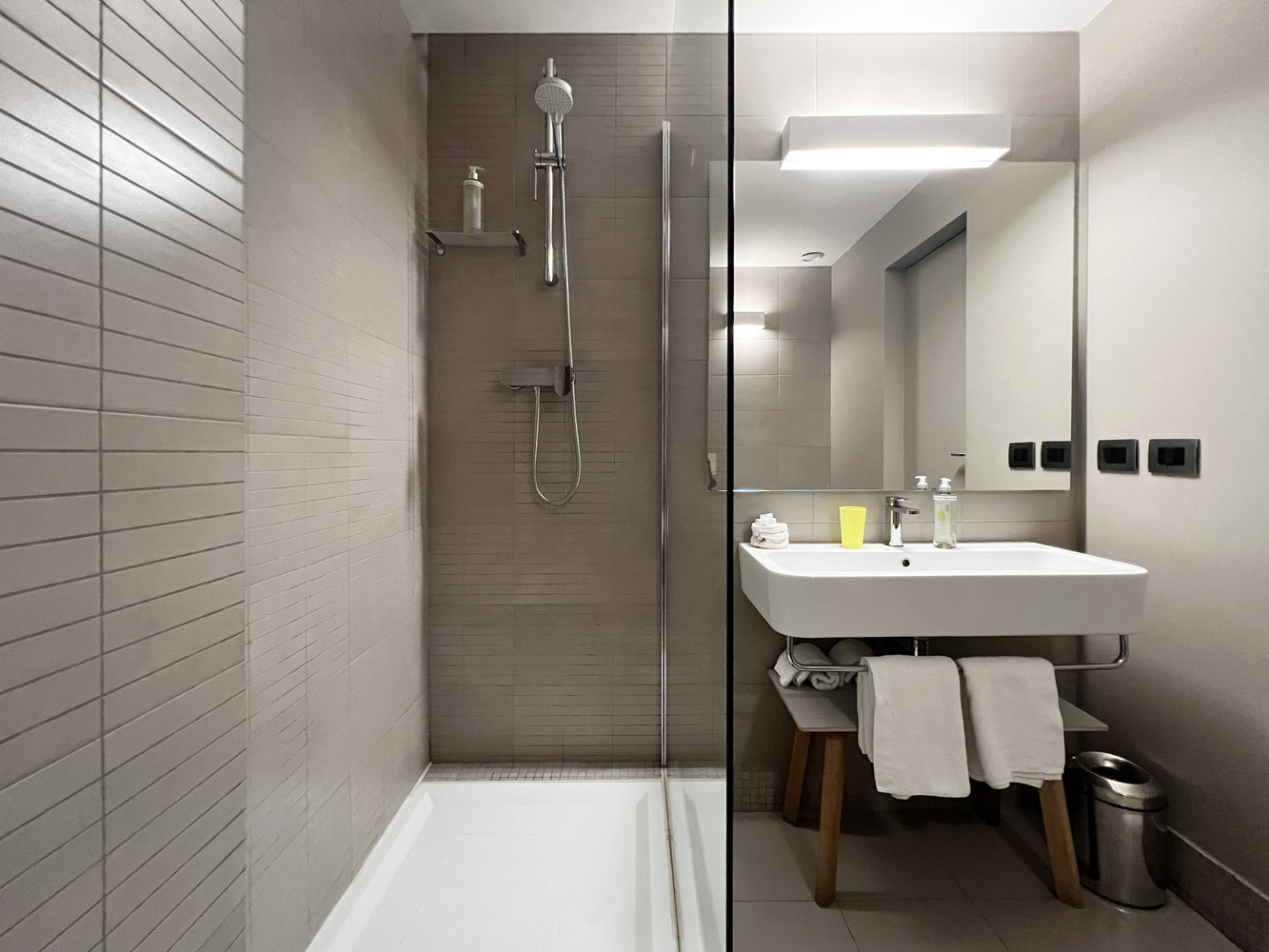 Bagno elegante con doccia, prodotti di detergenza Osmè Ecocert a dispenser con extra kit prodotti cortesia monouso e altri a richiesta.