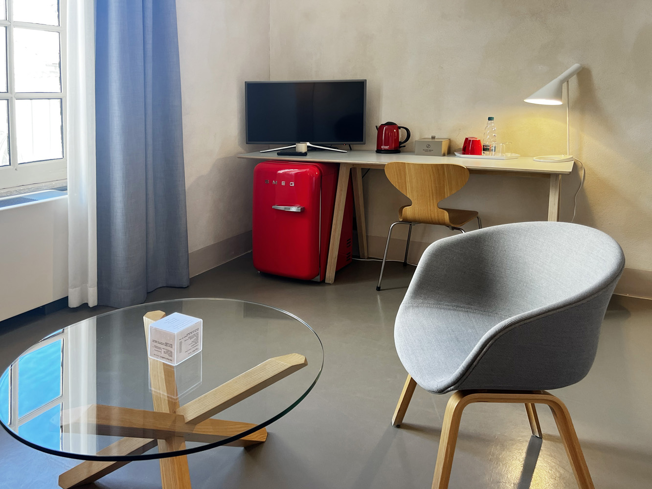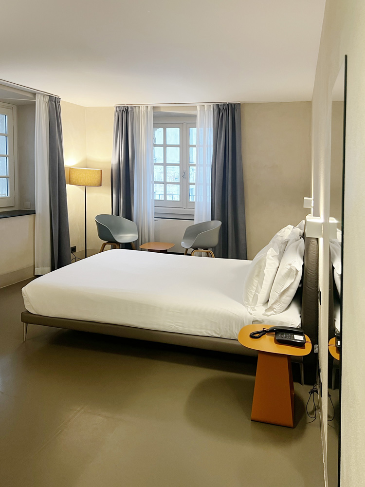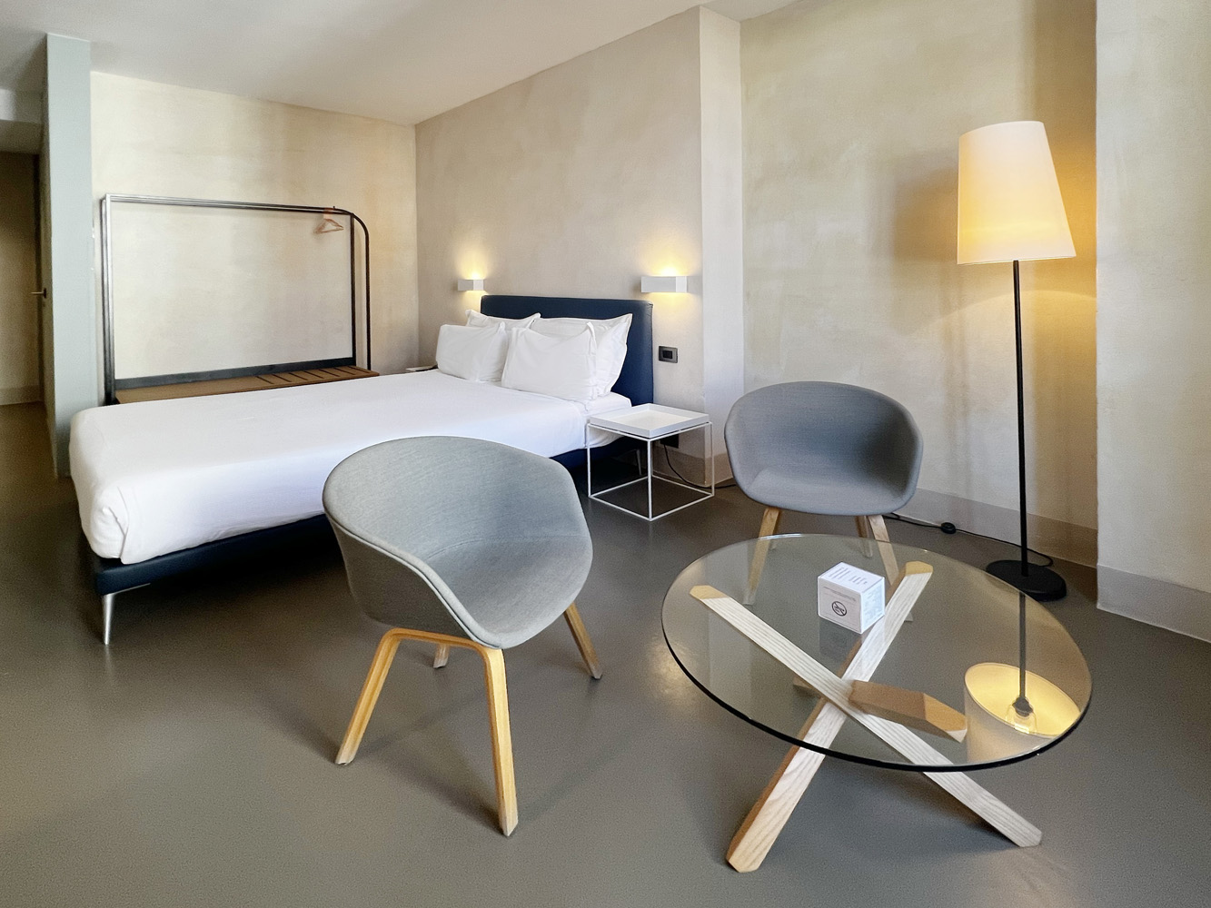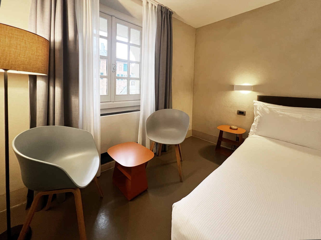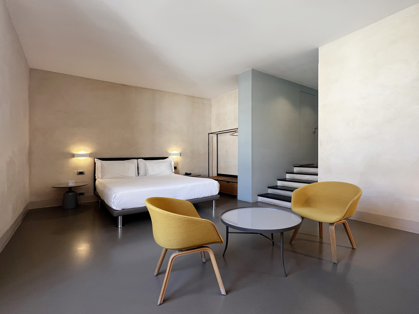 Camera silenziosa e accogliente con vista interna, arredi e colori in stile sobrio ed essenziale. Poltrone colorate di design e pavimento in resina.