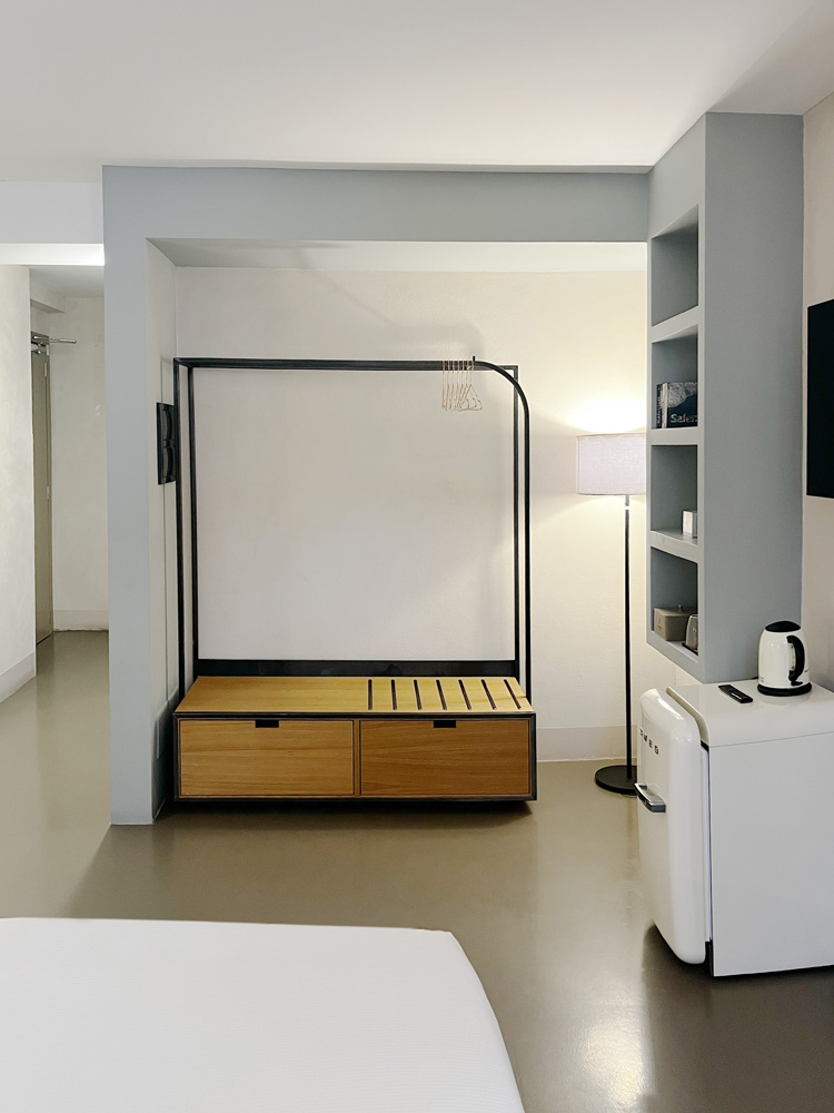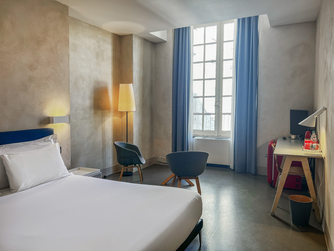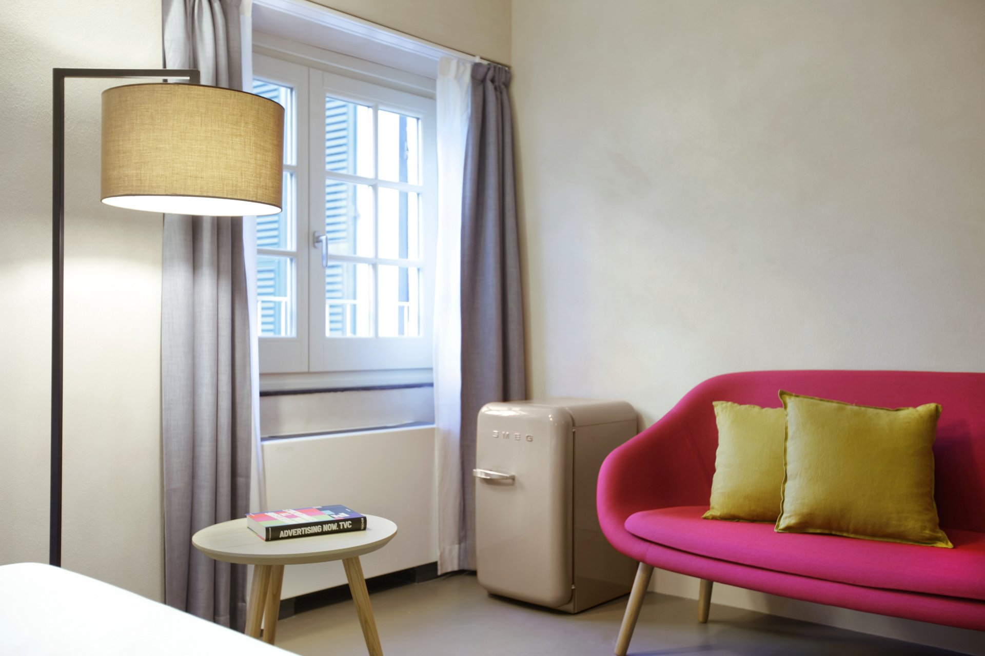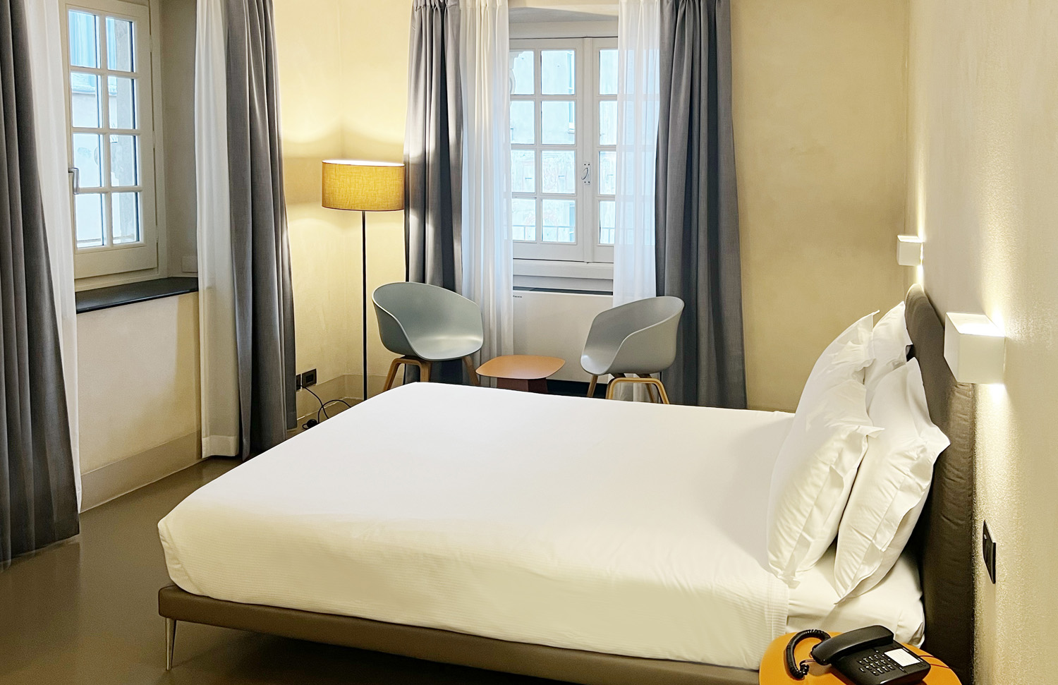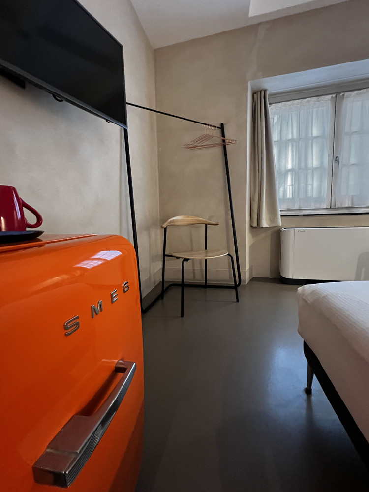 Camera compatta e funzionale con tutti i comfort richiesti in un minor spazio, piccolo desk, stand per gli abiti, frigobar Smeg e vista su piazzetta laterale.
