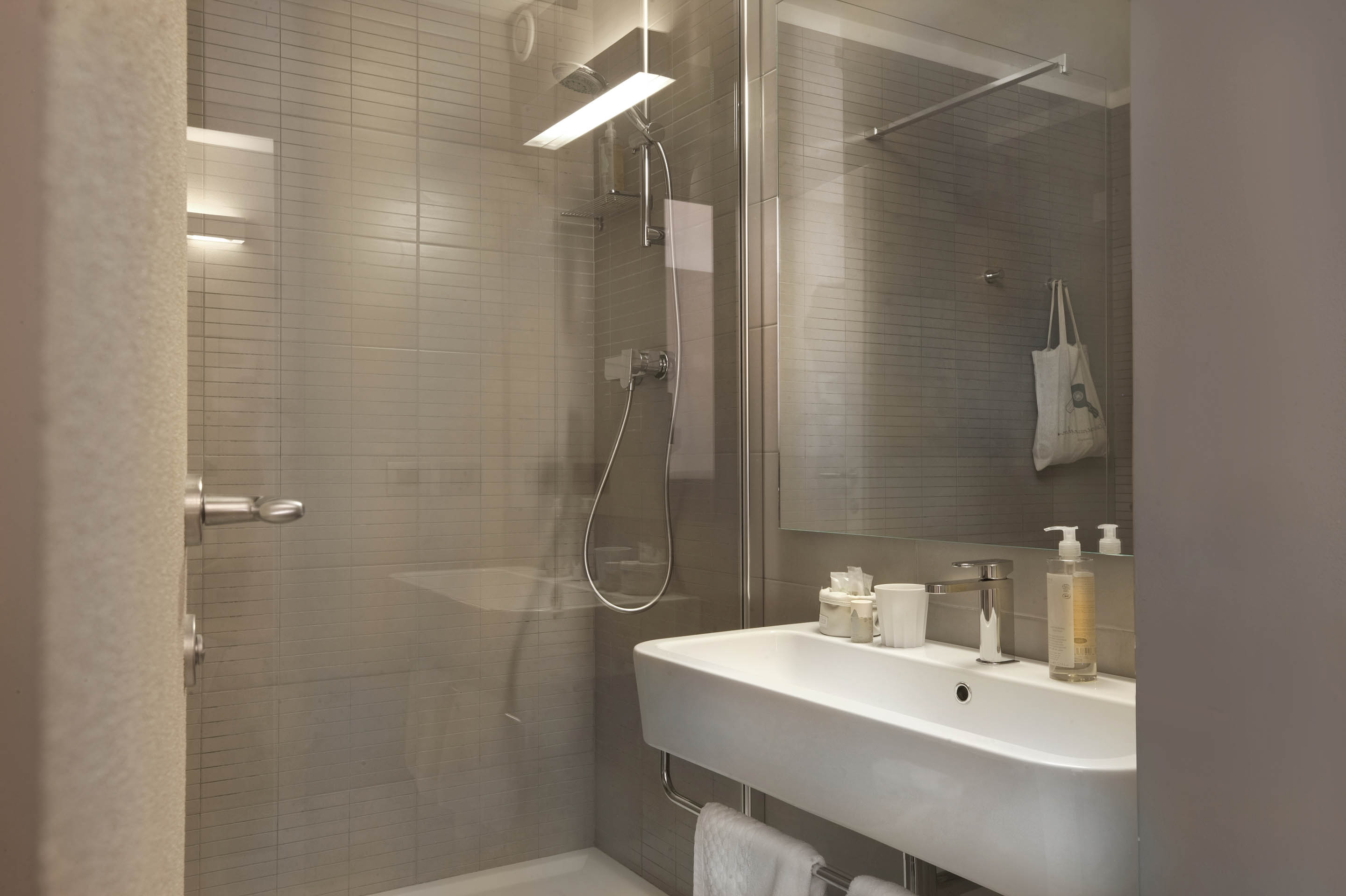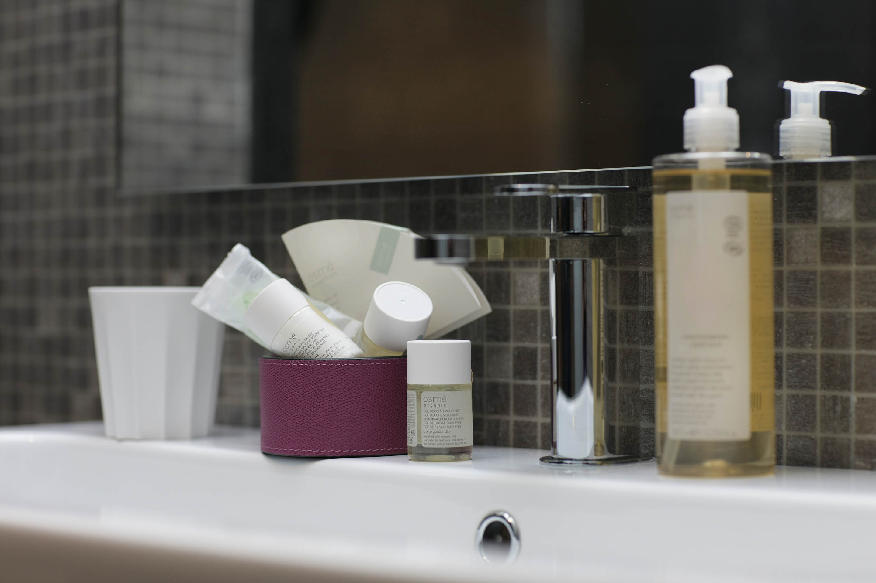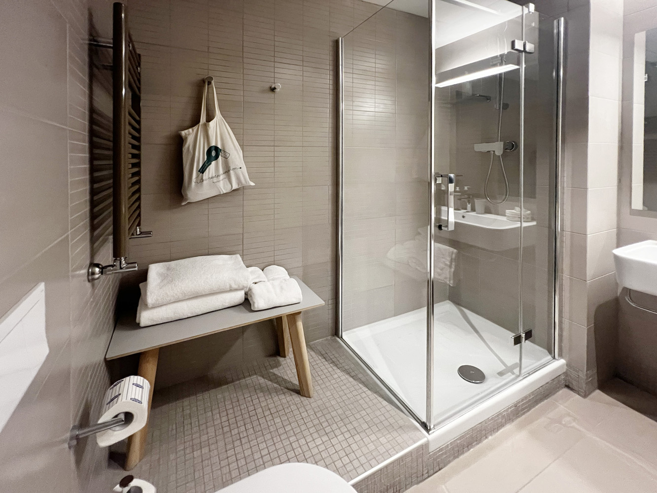 Bagno moderno con doccia, prodotti di detergenza Osmè Ecocert a dispenser e kit prodotti cortesia monouso.