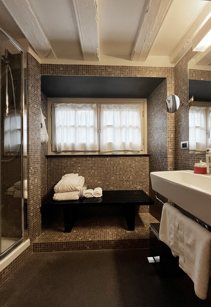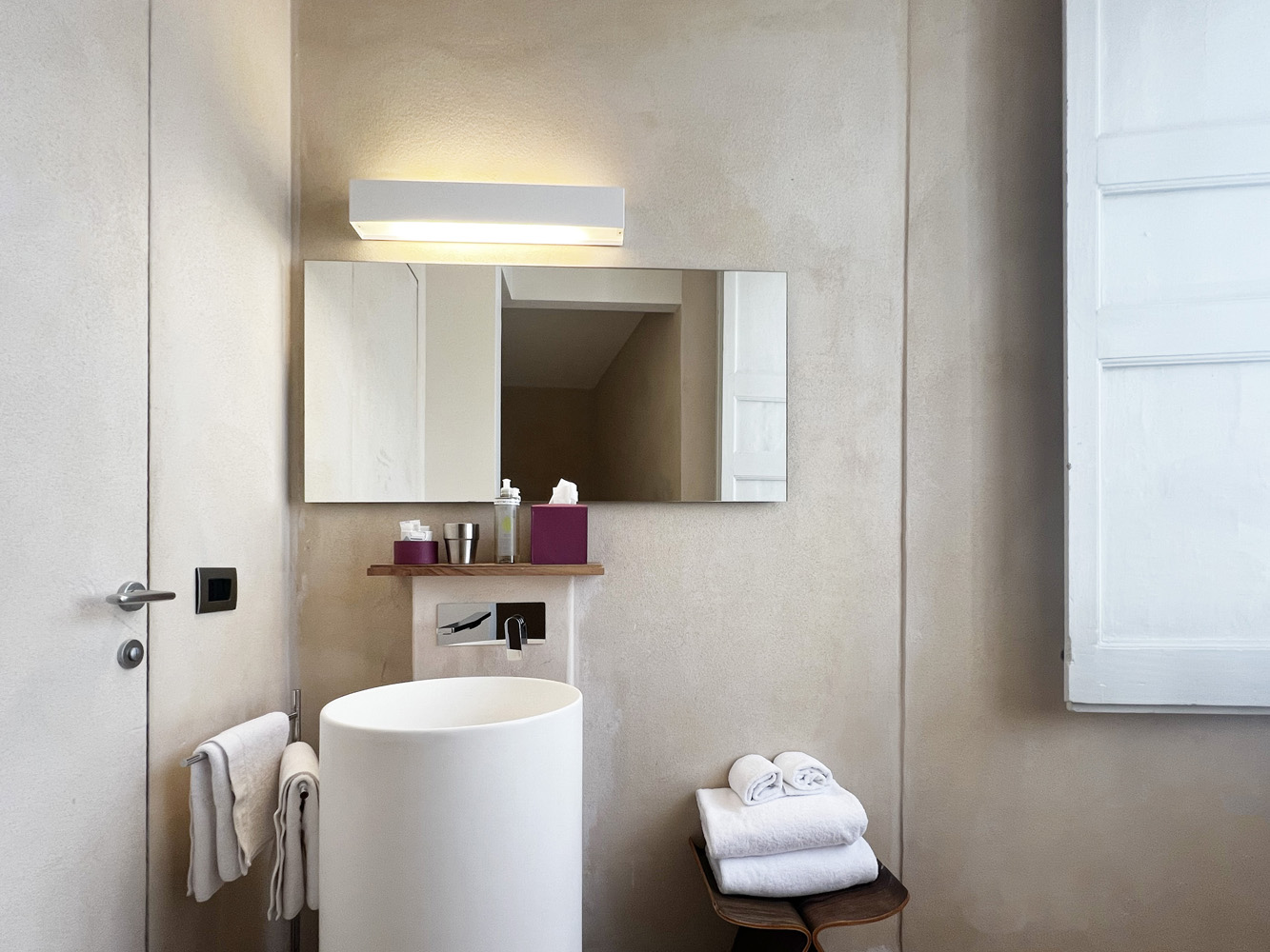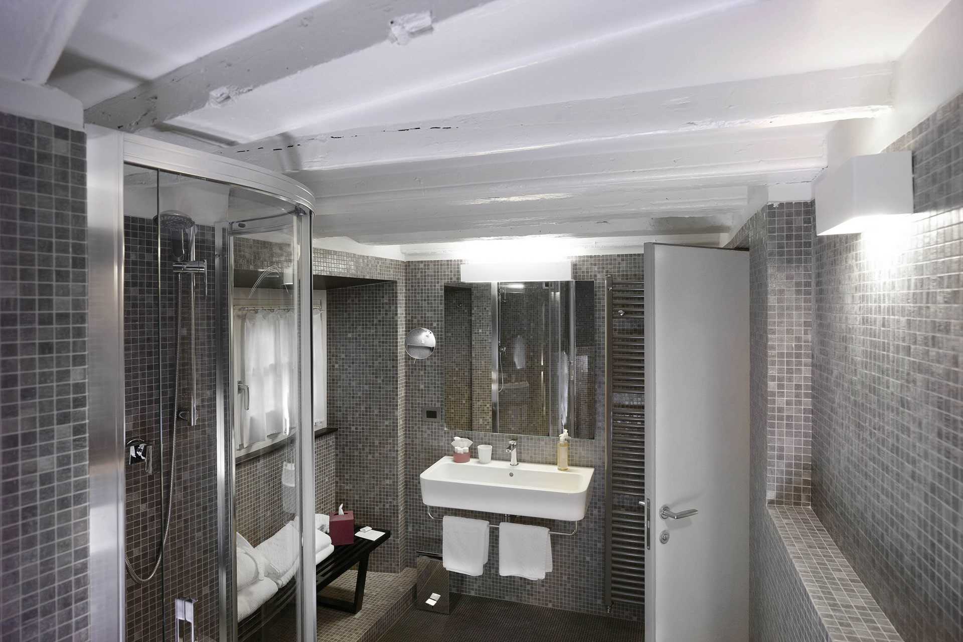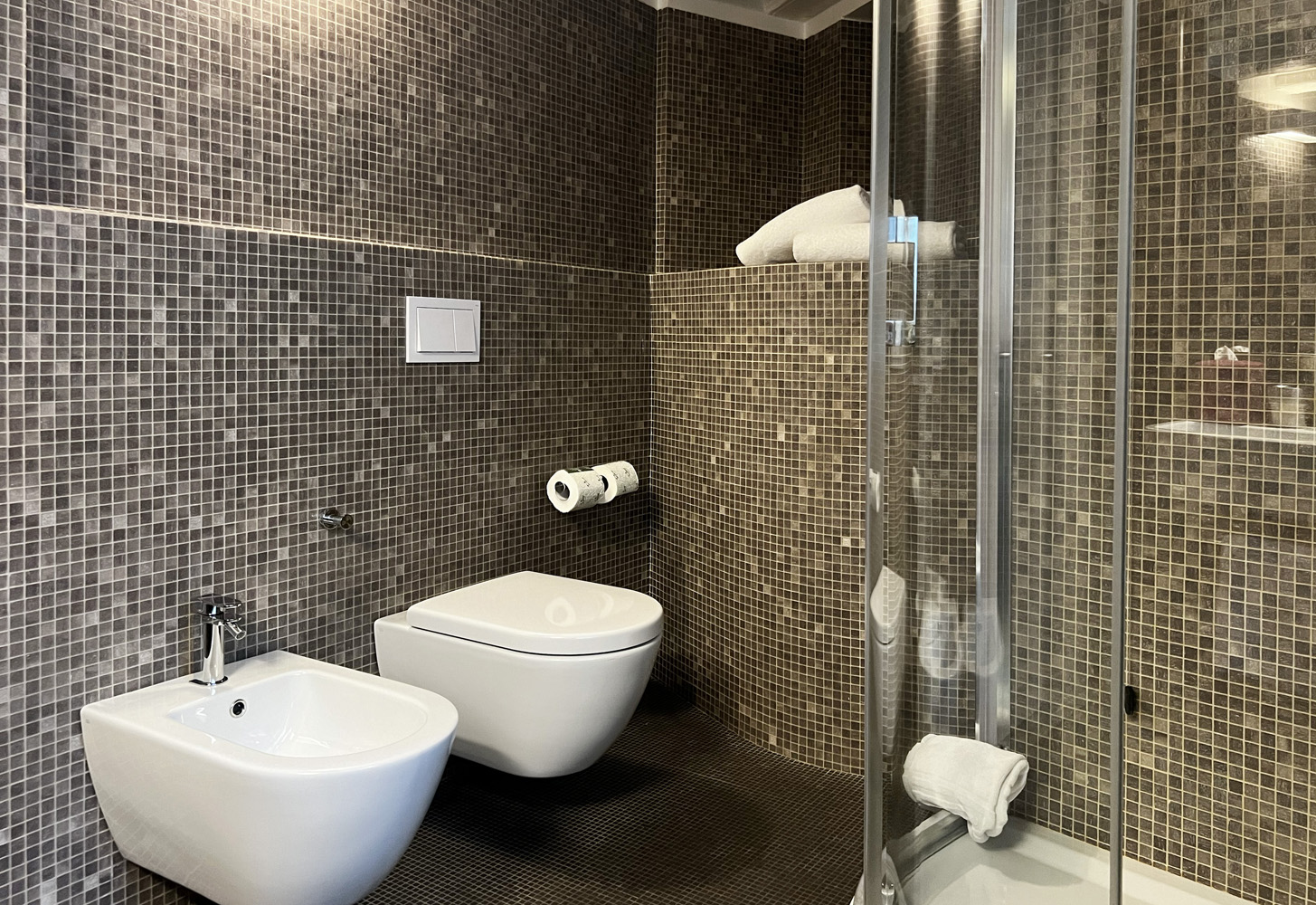 Bagno ampio ed elegante con doccia, alcuni con dettagli storici, prodotti di detergenza Osmè Ecocert a dispenser con extra kit prodotti cortesia monouso e altri a richiesta.