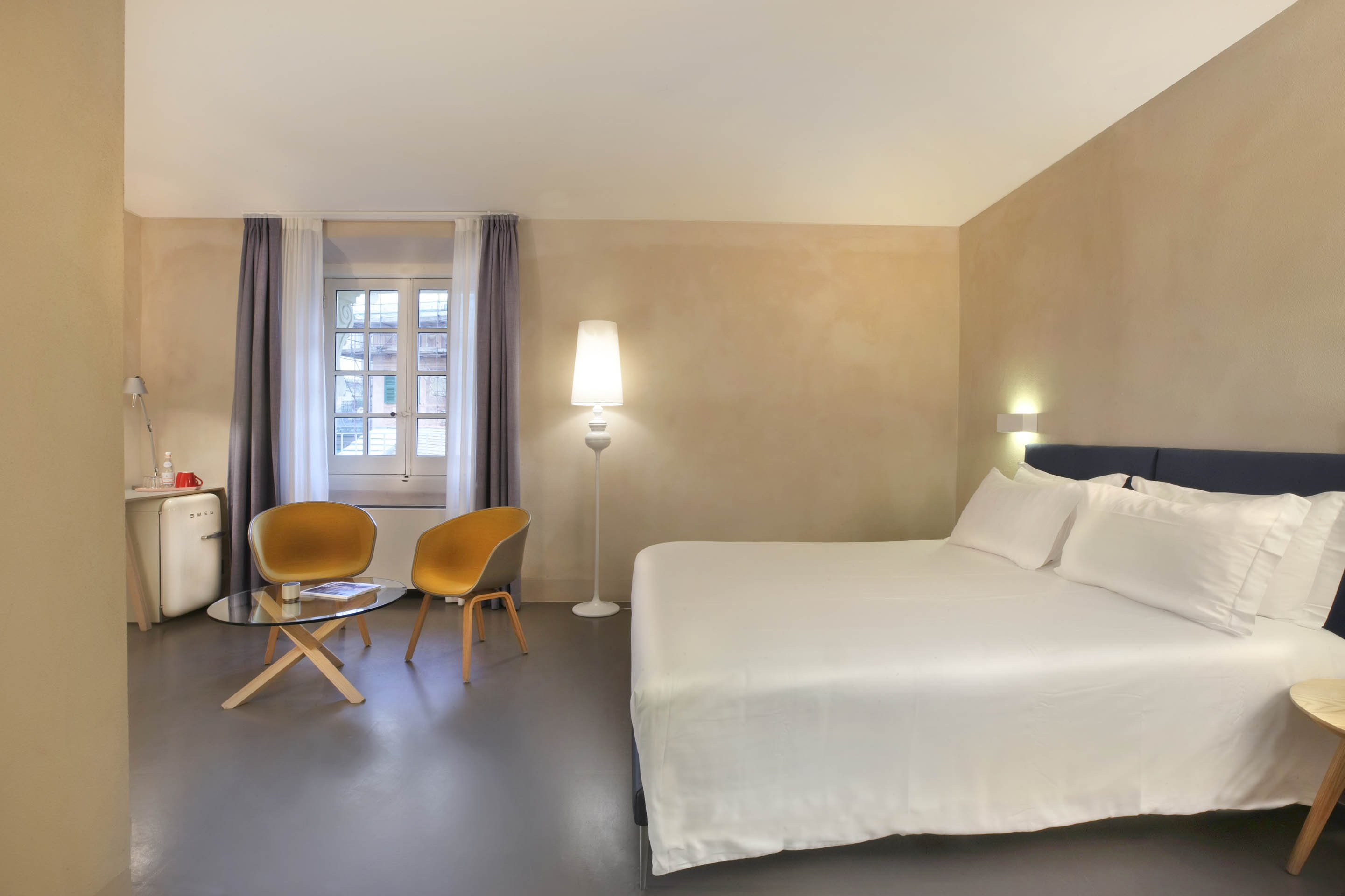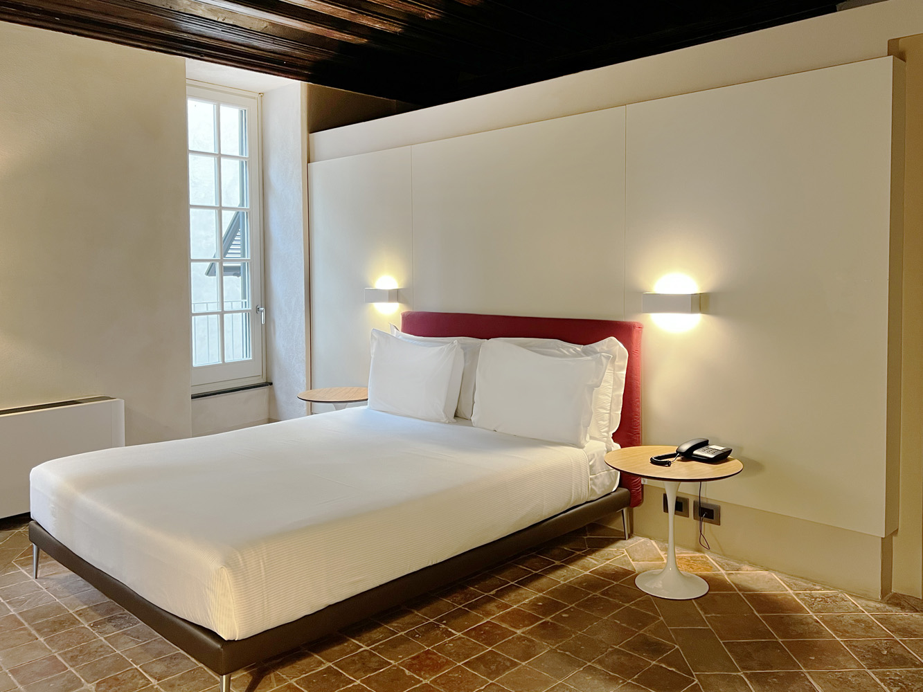 La Deluxe Luxury è una camera unica, con presenza di dettagli storici originali abbinati ad arredi moderni ed essenziali. Pavimento in cotto del '500 e soffitto originale in travi di legno, completano l'arredo mobili di design per una moderna atmosfera romantica.